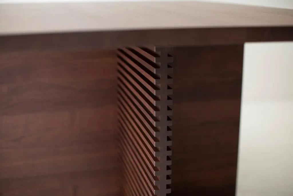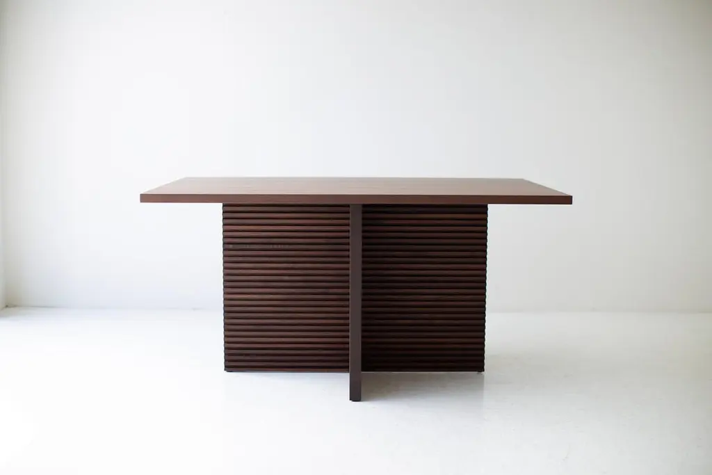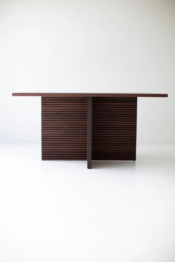 Bertu Dining Table, Pedestal Dining Table, Walnut Dining Table, CicelyThis Walnut Pedestal Dining Table - The Cicely is made in the heart of Ohio with locally sourced wood. We use the table both as a dining table and desk. Each table is hand-made in solid walnut and finished with a beautiful commercial-grade finish (other finishes and wood species available). We absolutely love the leg design - chunky, fresh, modern, and looks great with any aesthetic. Every piece in the Cicely Collection shares the beautiful horizontal routed pattern design.specsPeriod/Model: New; Mid Century Modern InspiredSpecs: Walnut, Commercial-grade finishCustomizable: Yes! It's what we do :)dimensionsH: 30"L: 60"D: 42"SKU: Bertu Dining Table, Pedestal Dining Table, Walnut Dining Table, Cicely