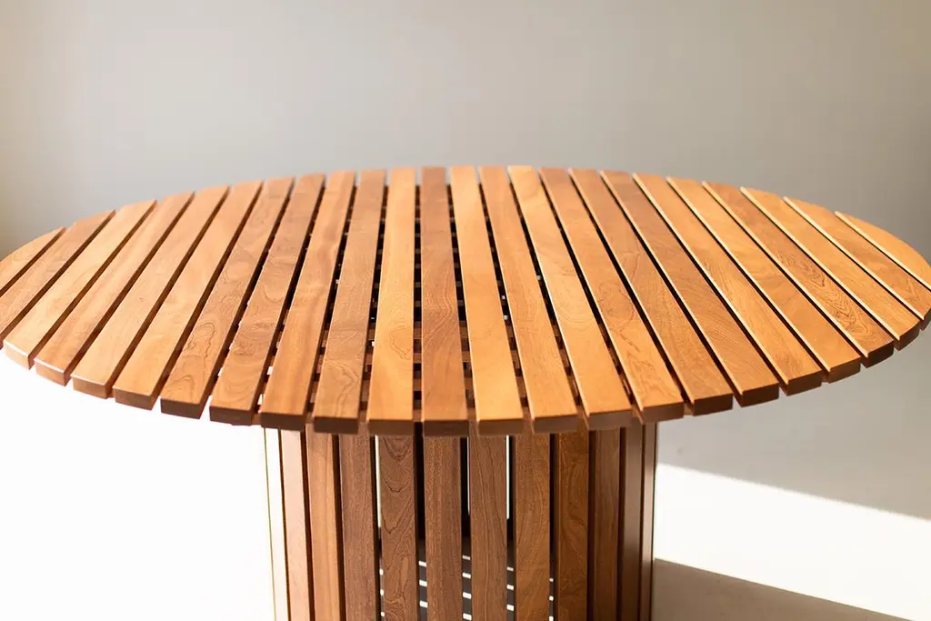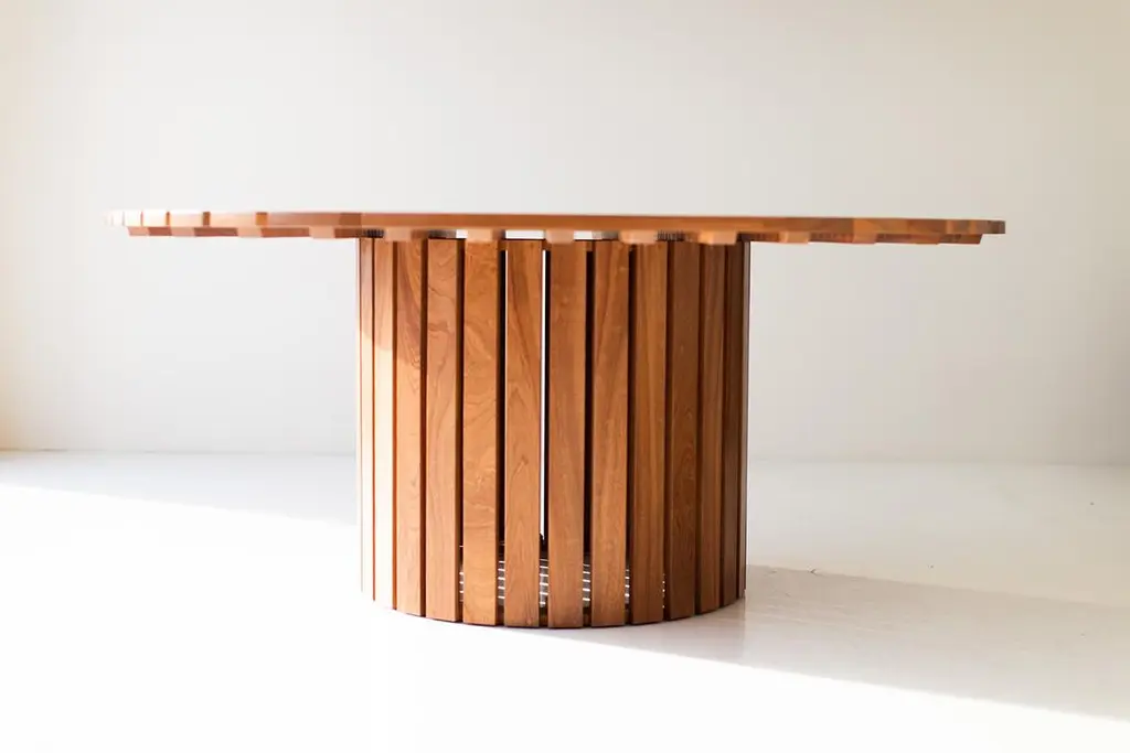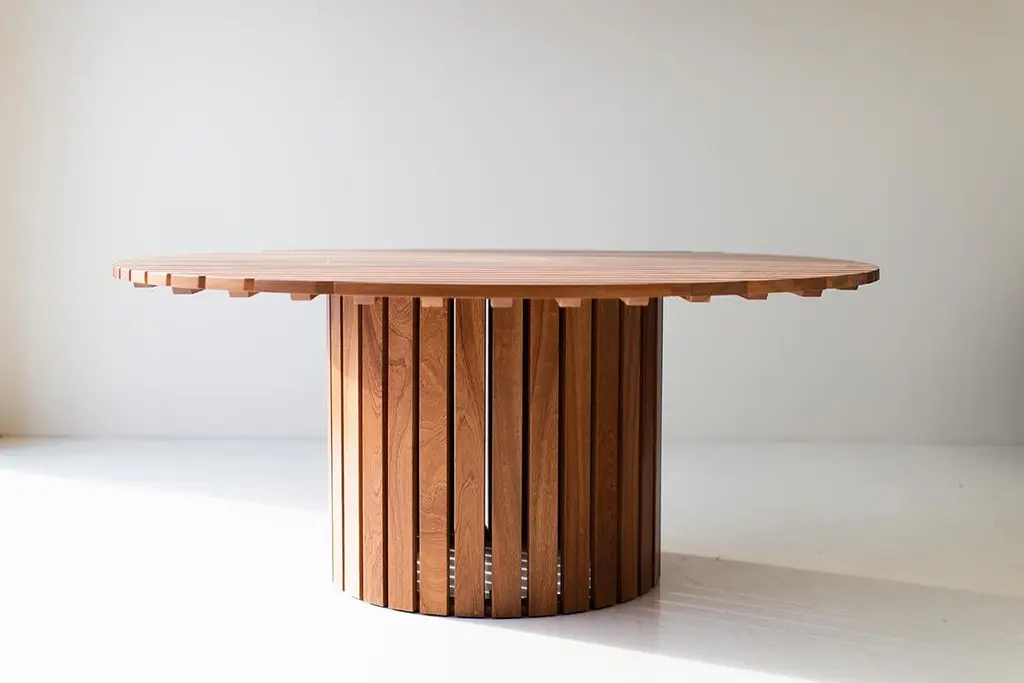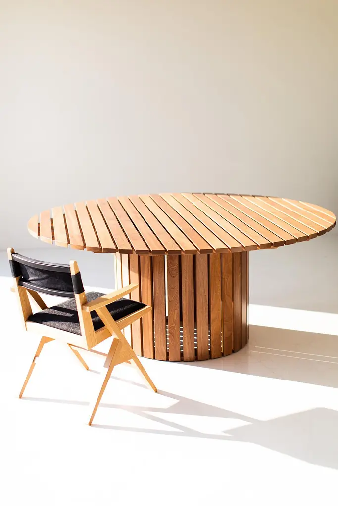 This round outdoor wood dining table - The Hamptons is handmade in the heart of Ohio with locally sourced sapele mahogany. The wood is suitable for outdoor conditions and finished with a commercial grade exterior finish. Finish options include natural, grey-wash, dark walnut, and ebony (shown here in natural.) Samples available upon request. We love the sleek feel and versatility of this style. Contact us to customize dimensions. We love this table and hope you enjoy it as much as we do! specsPeriod/Model: New; Mid-Century Modern InspiredSpecs: Mahogany, Natural Commercial-grade Exterior FinishCustomizable: Yes! It's what we do :)dimensionsH: 30"L: 70"D: 70".