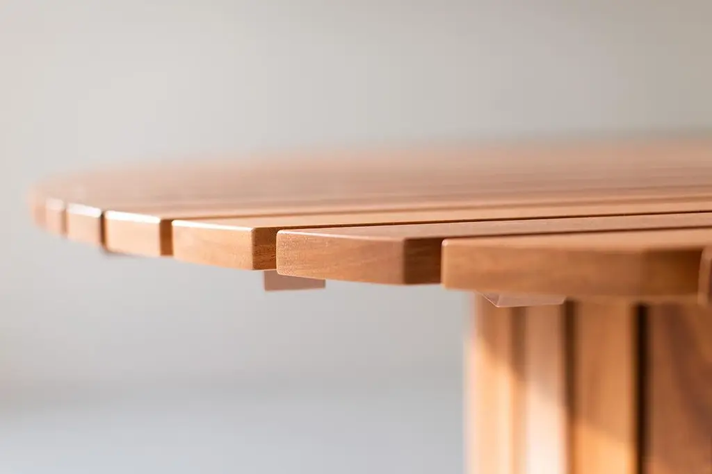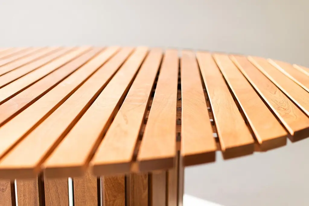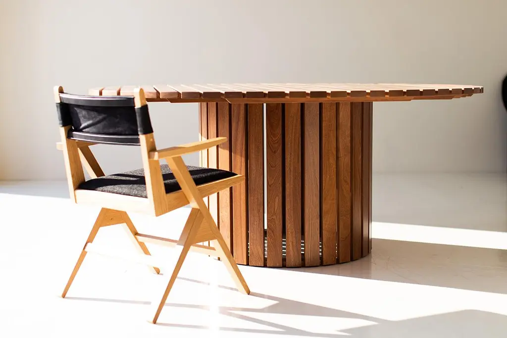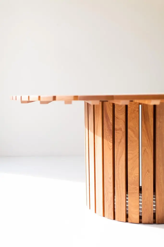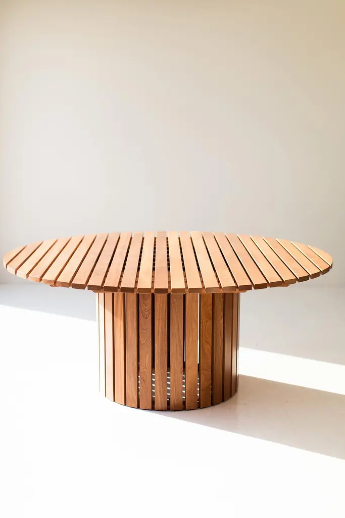 This round outdoor wood dining table - The Hamptons is handmade in the heart of Ohio with locally sourced sapele mahogany. The wood is suitable for outdoor conditions and finished with a commercial grade exterior finish. Finish options include natural, grey-wash, dark walnut, and ebony (shown here in natural.) Samples available upon request. We love the sleek feel and versatility of this style. Contact us to customize dimensions. We love this table and hope you enjoy it as much as we do! specsPeriod/Model: New; Mid-Century Modern InspiredSpecs: Mahogany, Natural Commercial-grade Exterior FinishCustomizable: Yes! It's what we do :)dimensionsH: 30"L: 70"D: 70".