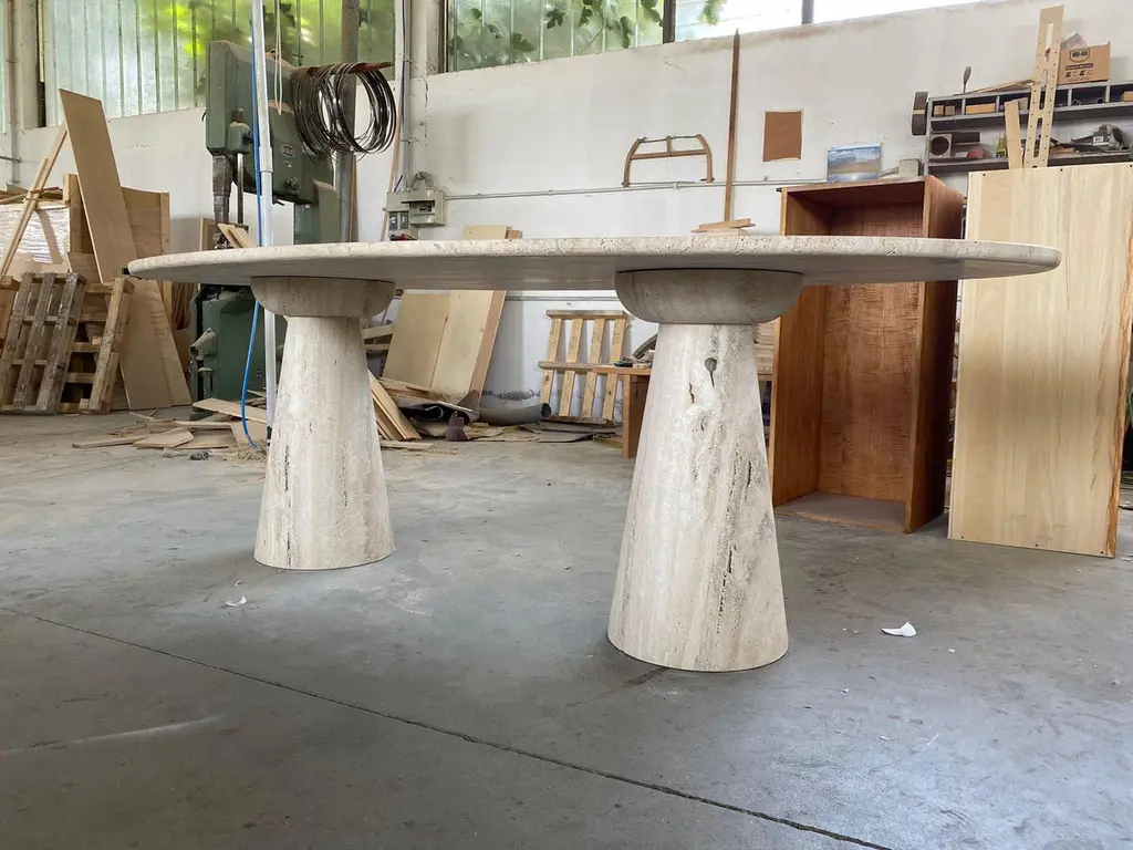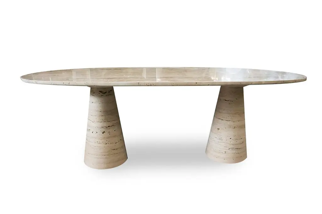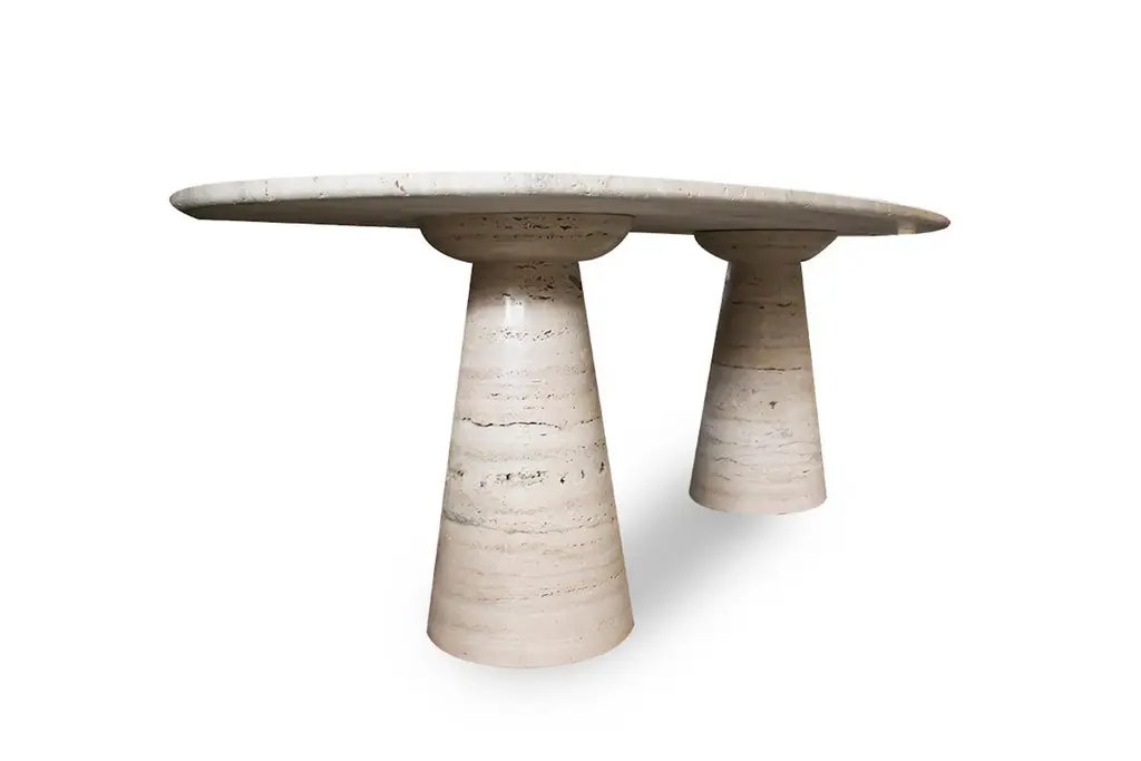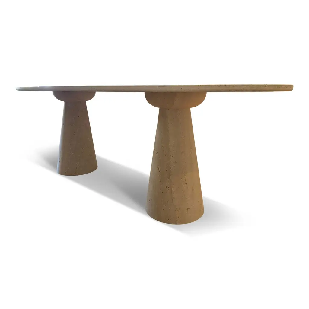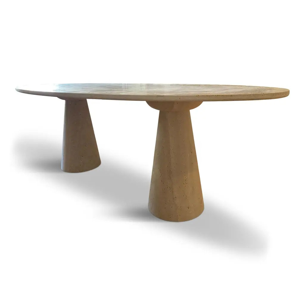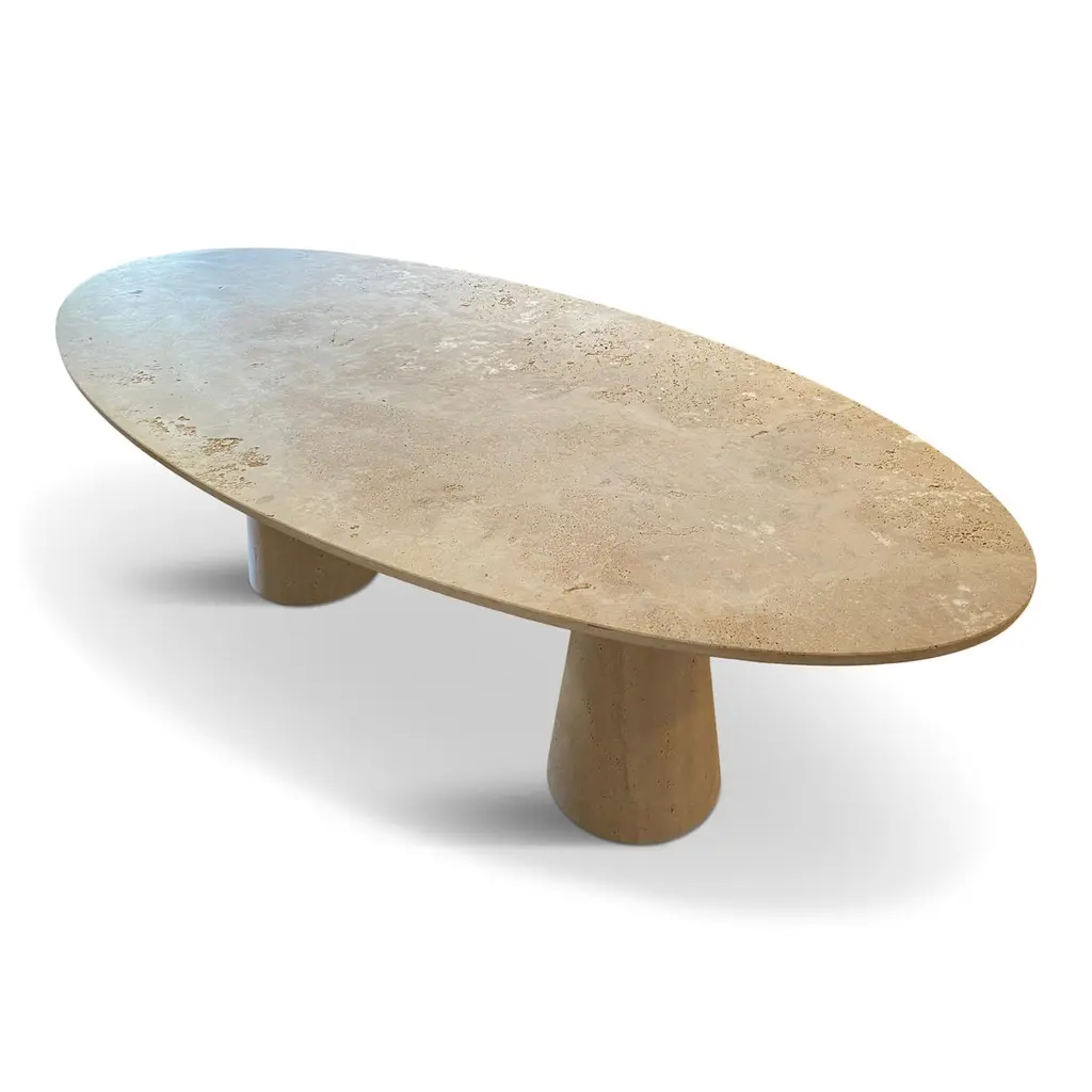 Travertine dining tableTwo pedestalsOvalMade to order in Italy.Size can be customised to a maximum length of 250cm.Can also be made in a circular one pedestal version.