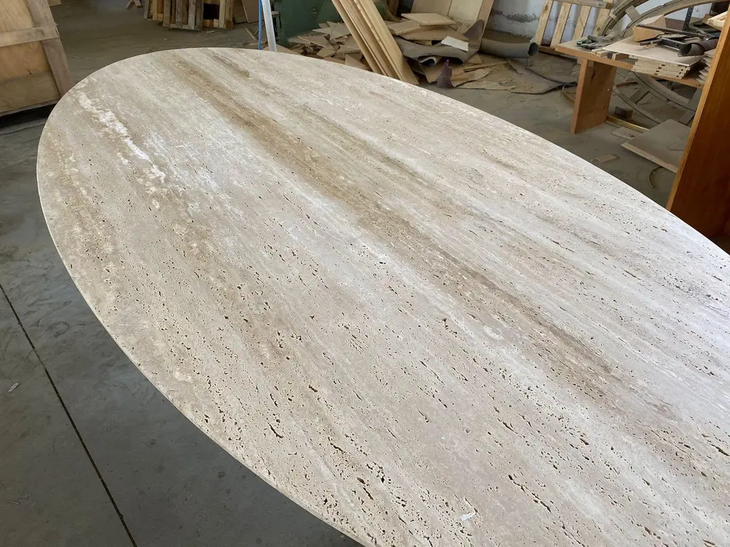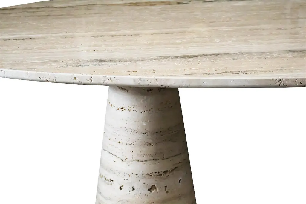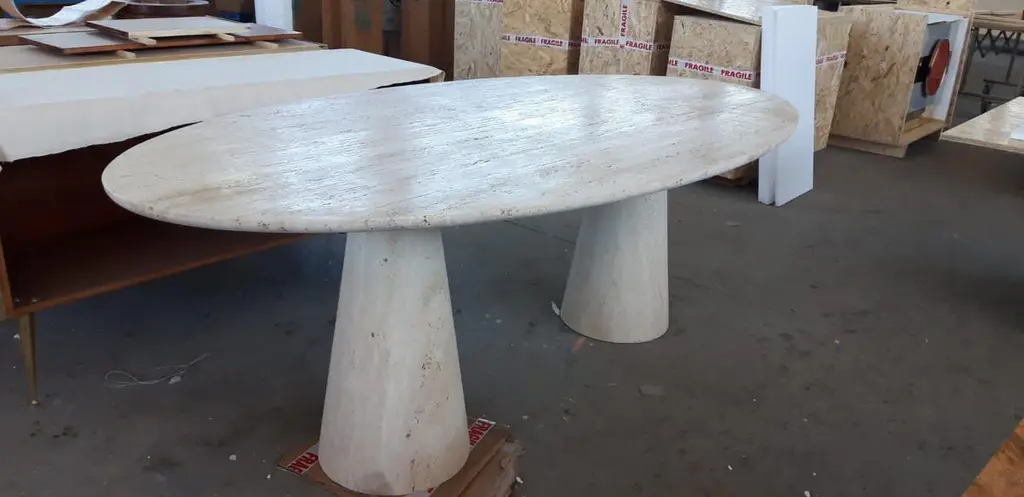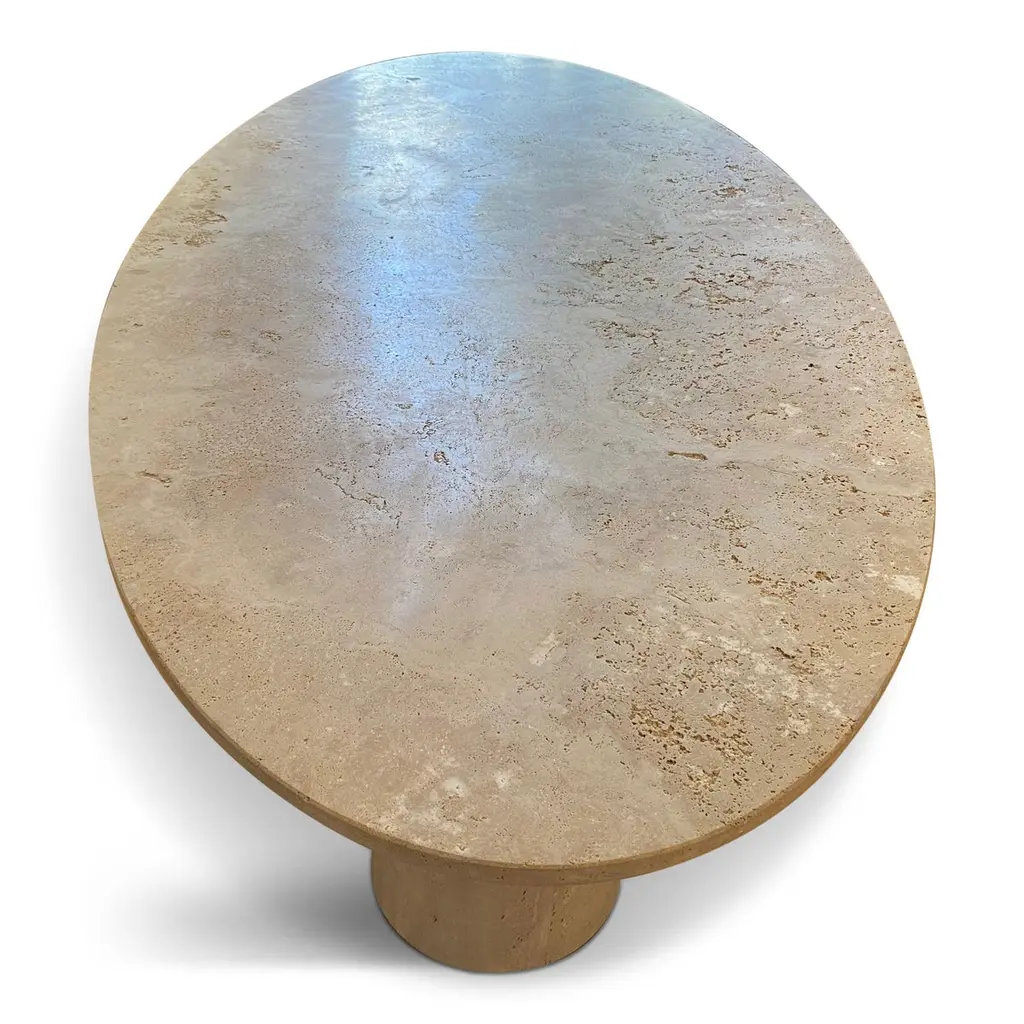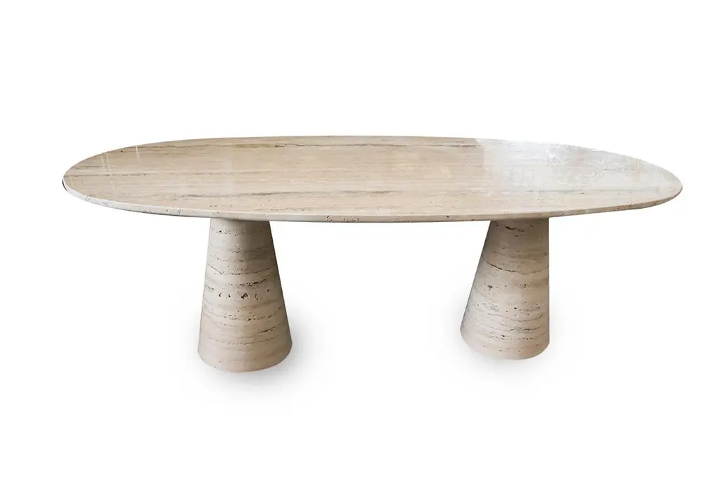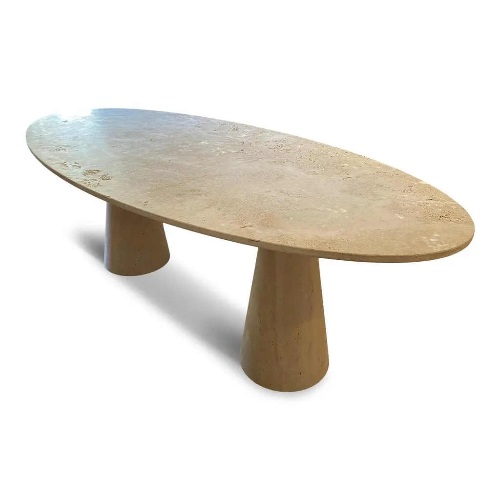 Travertine dining tableTwo pedestalsOvalMade to order in Italy.Size can be customised to a maximum length of 250cm.Can also be made in a circular one pedestal version.