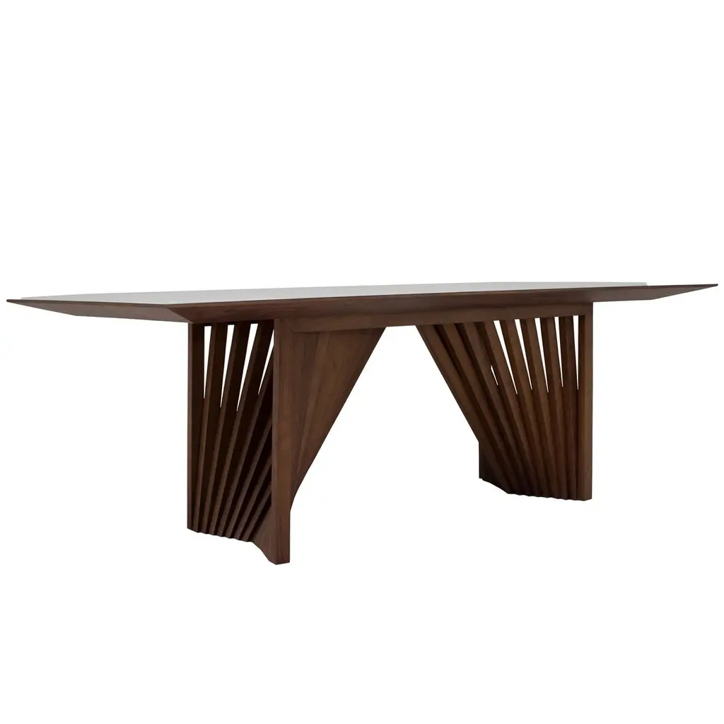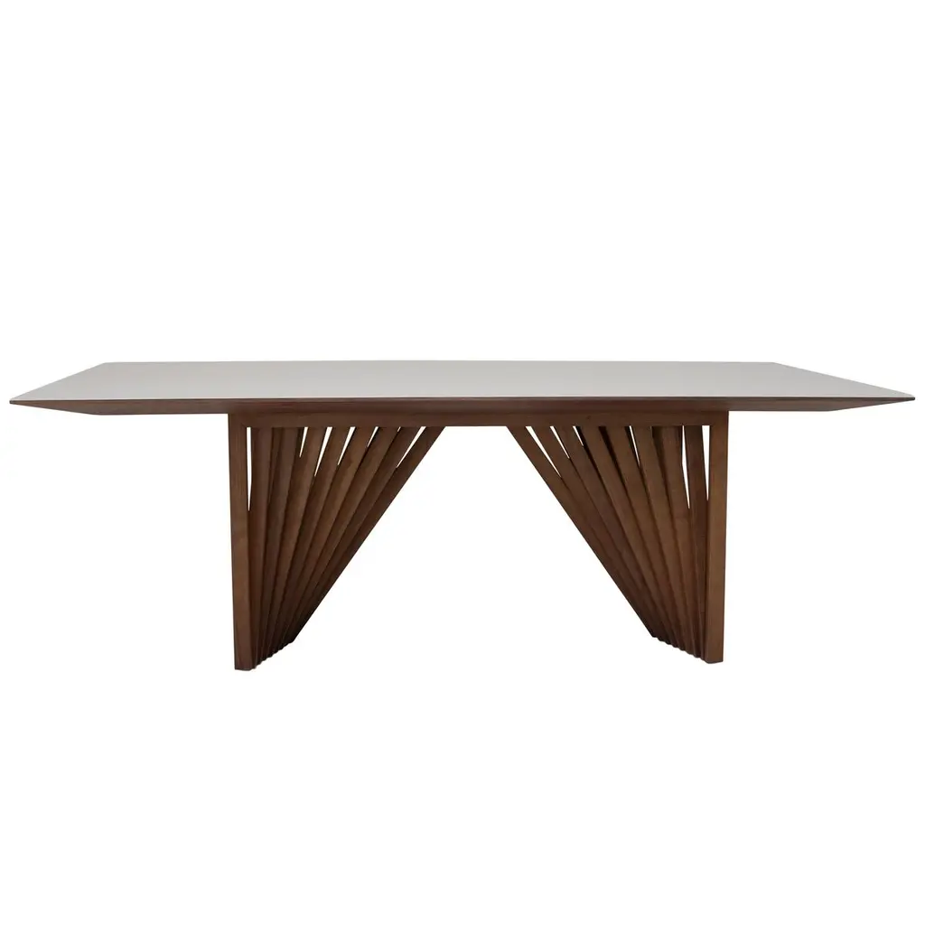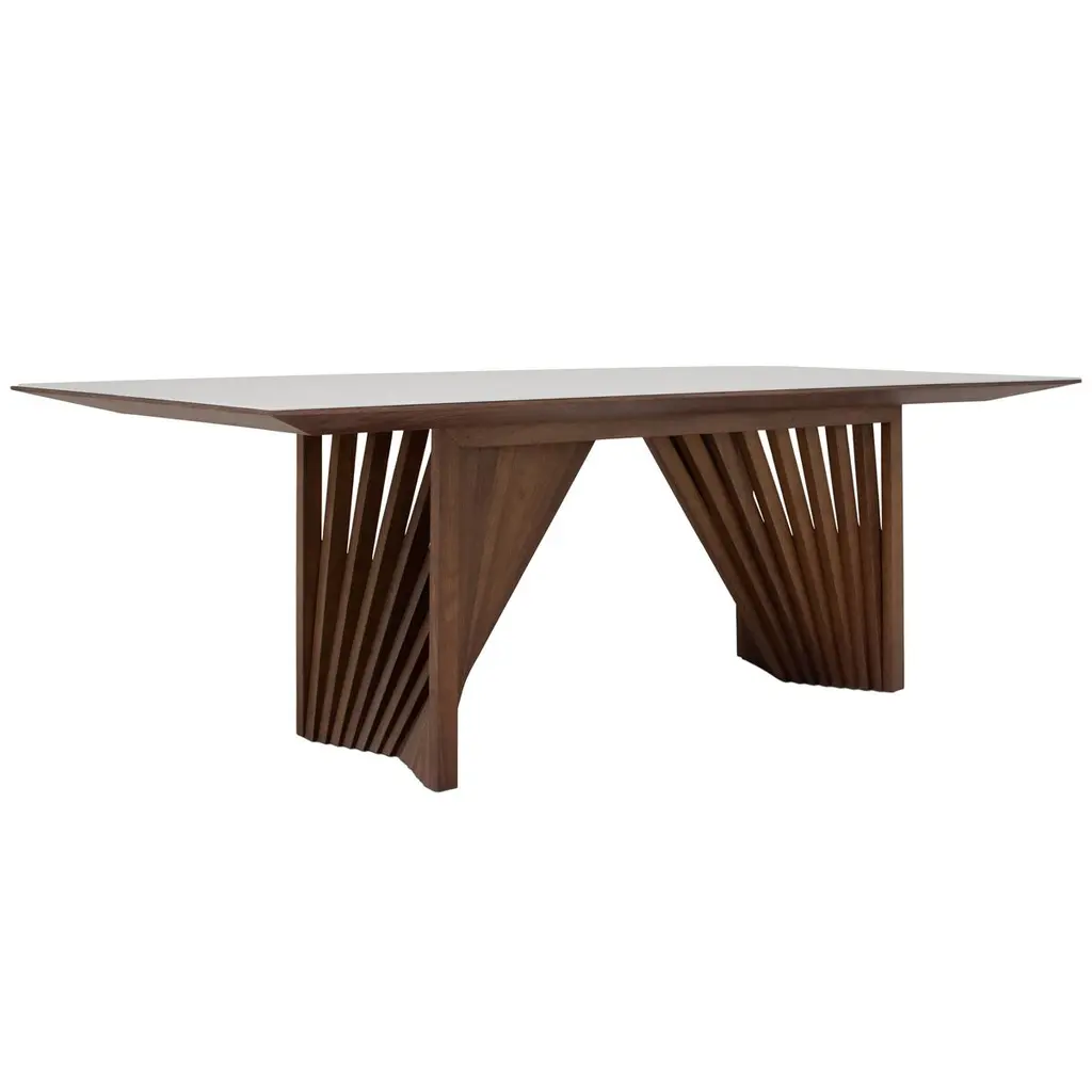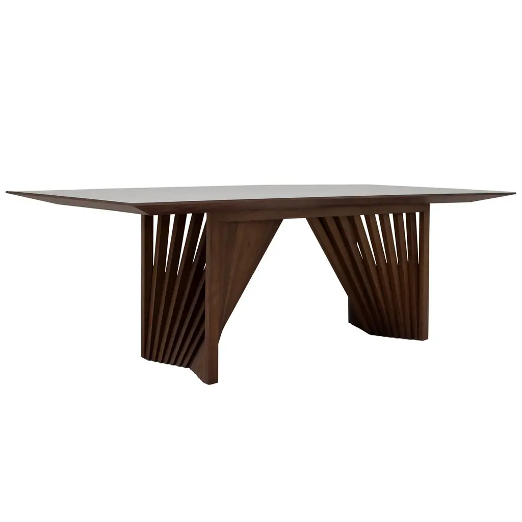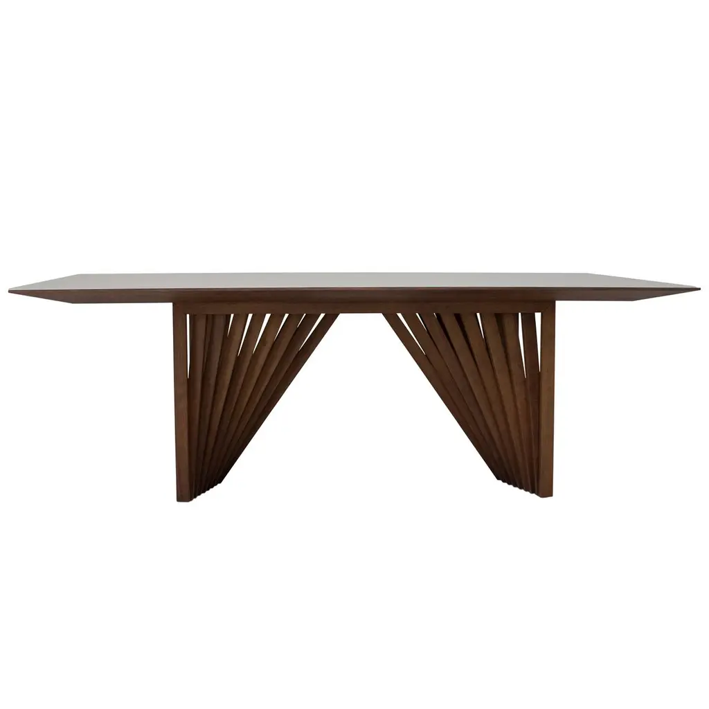Durable and beautiful tauari wood forms this dining table's eye-catching base, which creates an illusion of movement. The glass top prrovides a sleek textural complement. Crafted in Brazil, the table can seat eight people with ease.