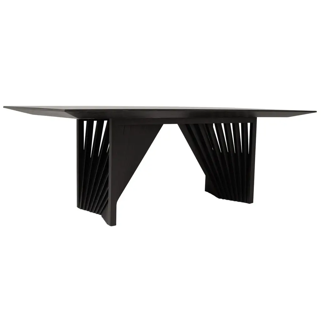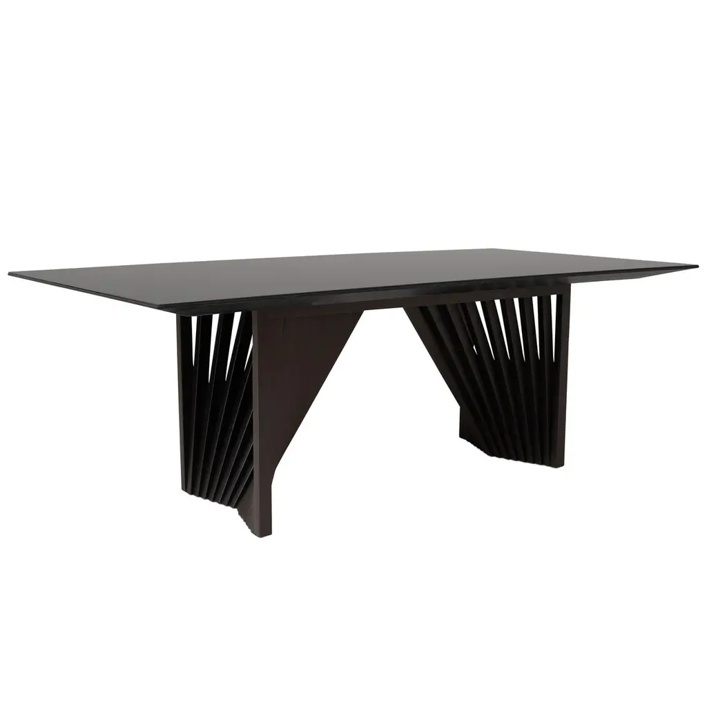 Durable and beautiful tauari wood forms this dining table's eye-catching base, which creates an illusion of movement. The glass top prrovides a sleek textural complement. Crafted in Brazil, the table can seat eight people with ease.