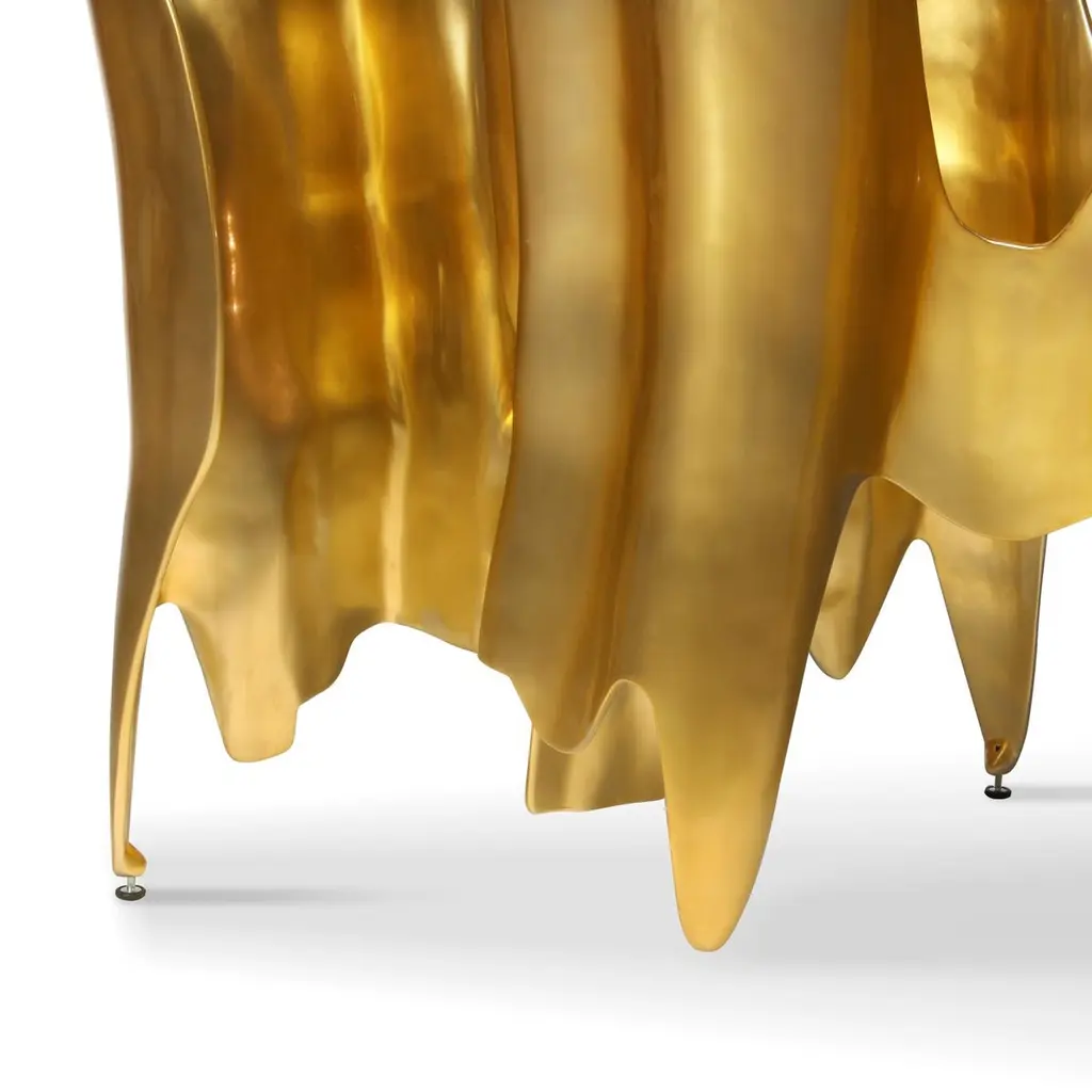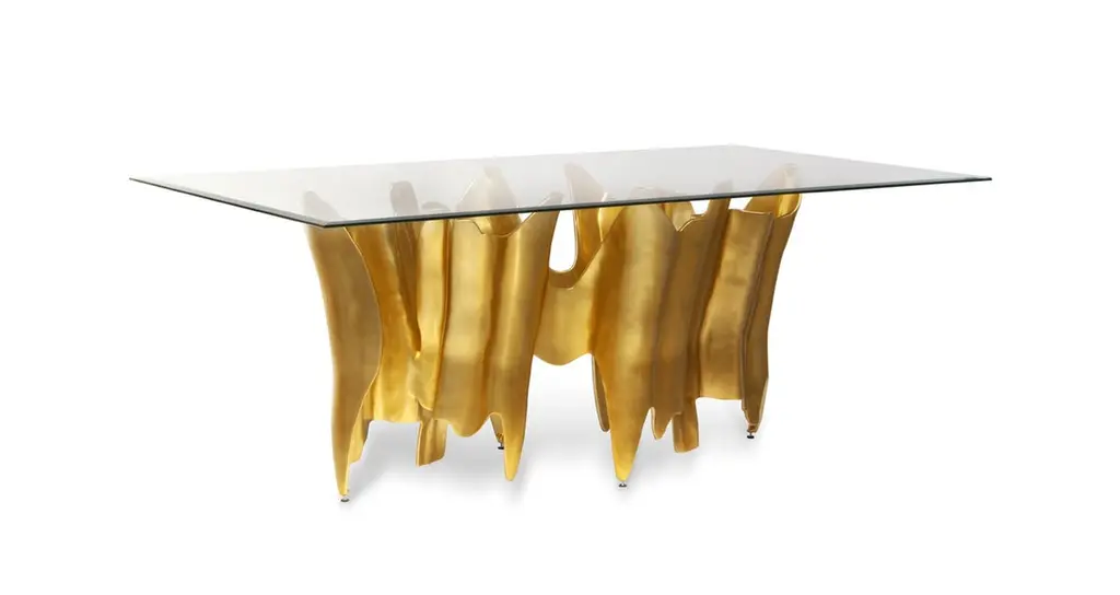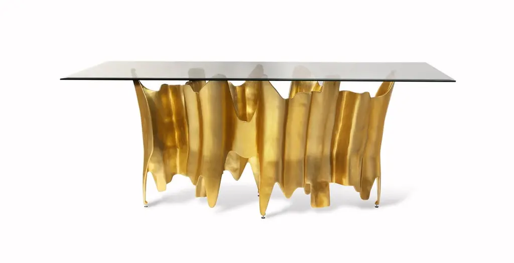 Big dinning table design "Vague" in metal and glass.Dining table cut from clear glass, it has the aluminum base in form of vogue. Perfect for a big dinning room in modern design,Made in Smoked Glass (Tempered Glass) and finish in Gold Chromium (High Gloss Finish).Measures: H : 77 cm, l: 243 cm, d: 110 cmTime of production 12 weeksref KK Obssedia.