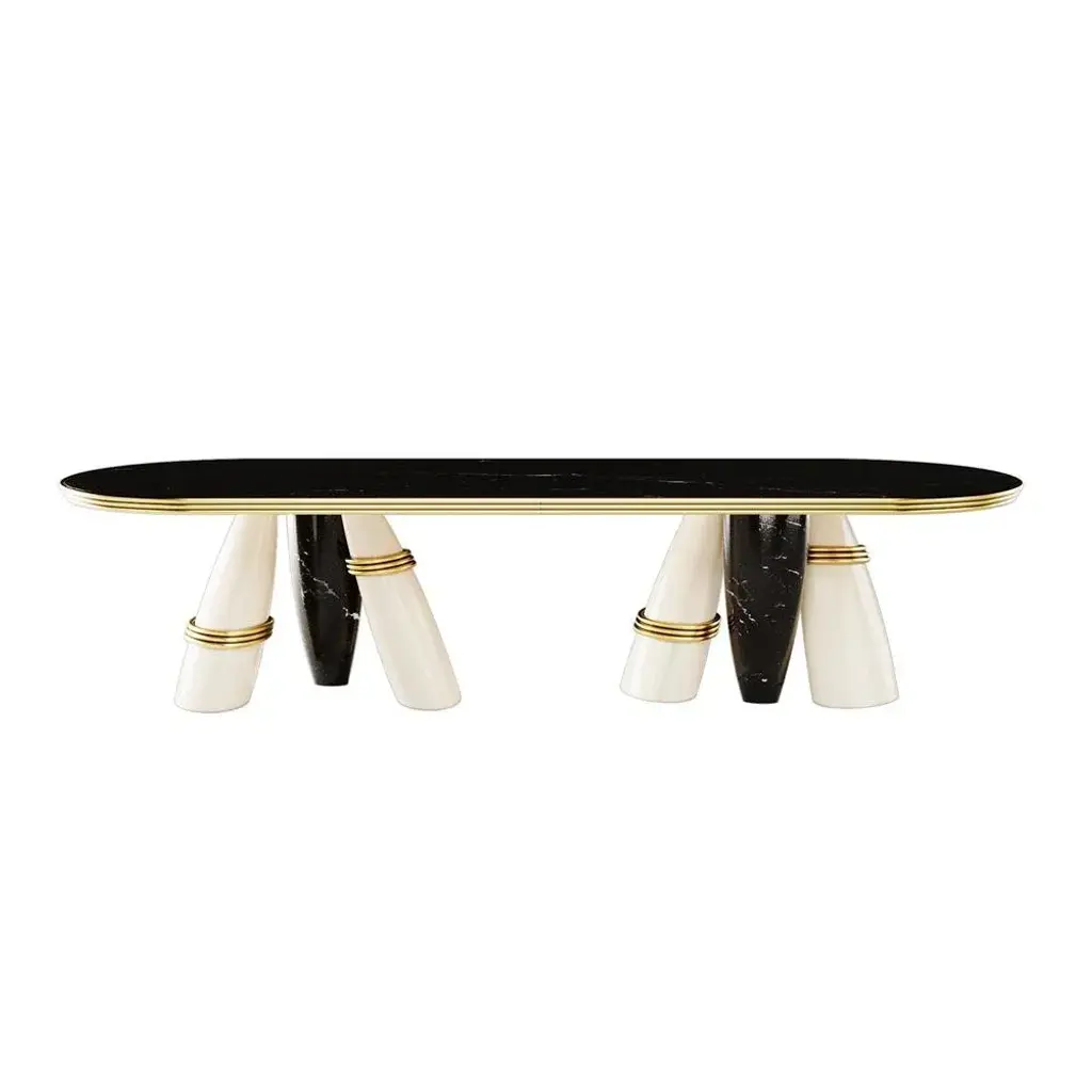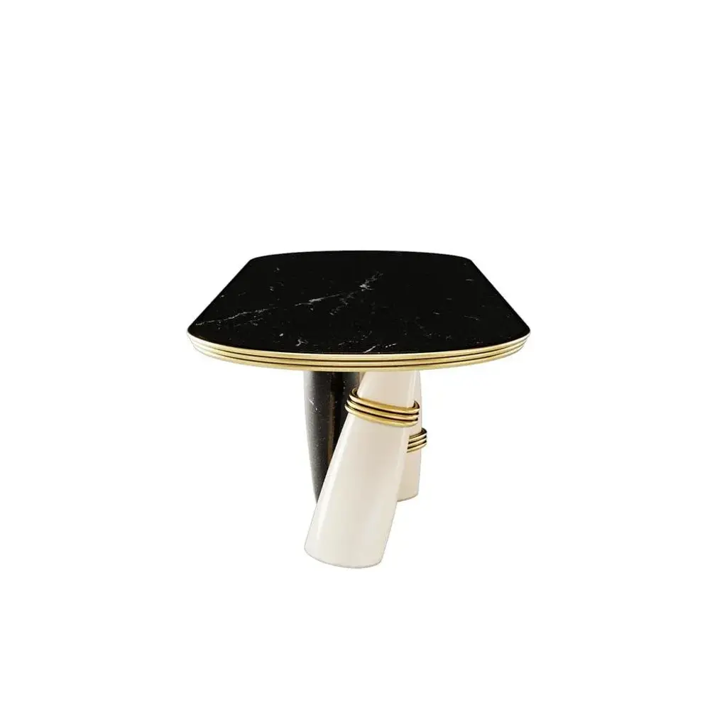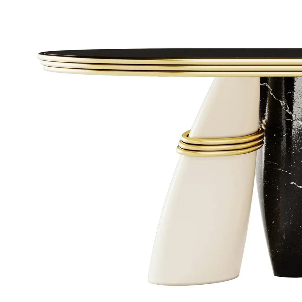 Billie Dining Table owns a striking attitude and sculptural shapes. A modern marble table with polished brass details promises to steal the show of any contemporary dining room design MATERIALS: Top in Polished Nero Marquina; Legs in Polished Nero Marquina and Gloss Light Ivory Lacquer; Details in Gold Polished Stainless Steel