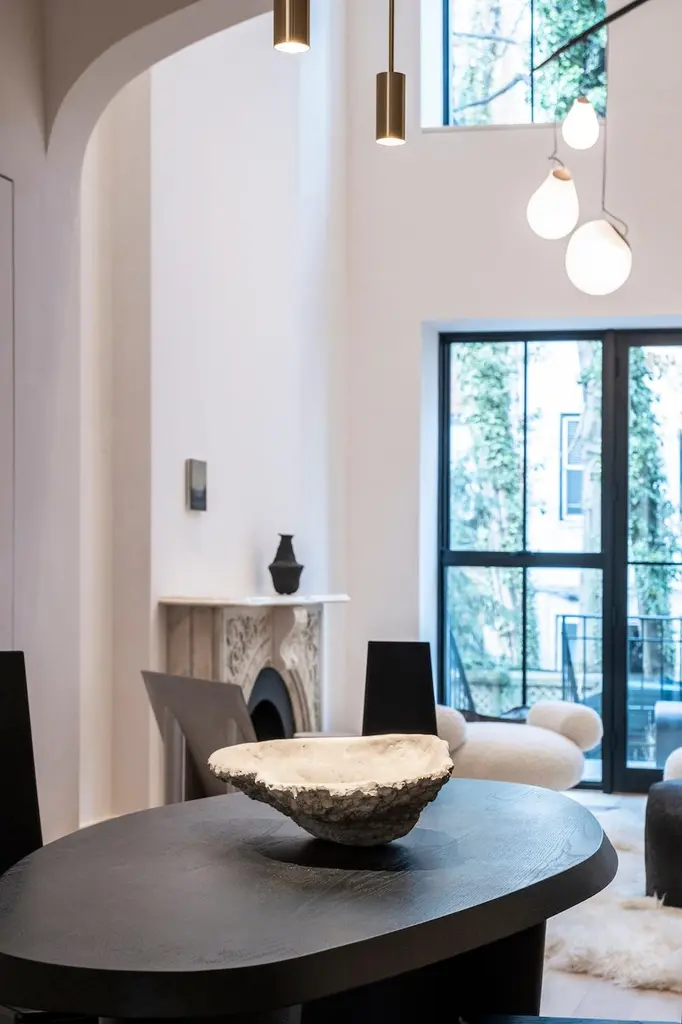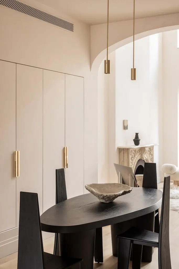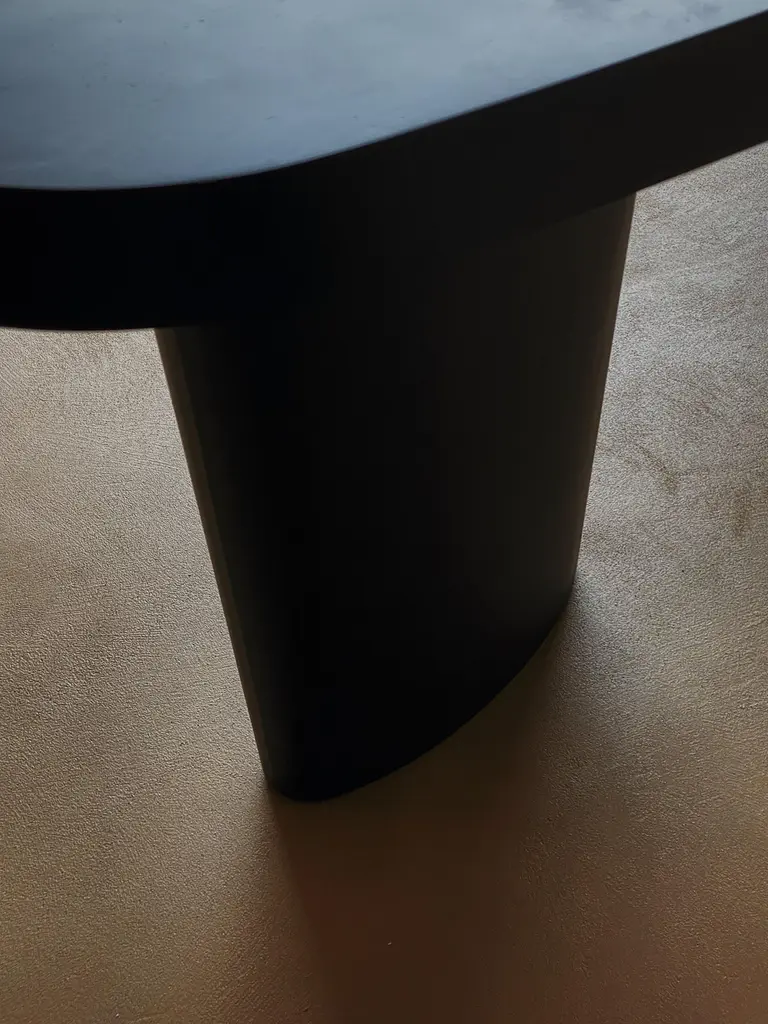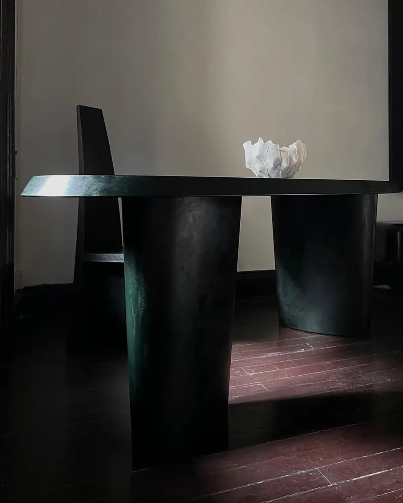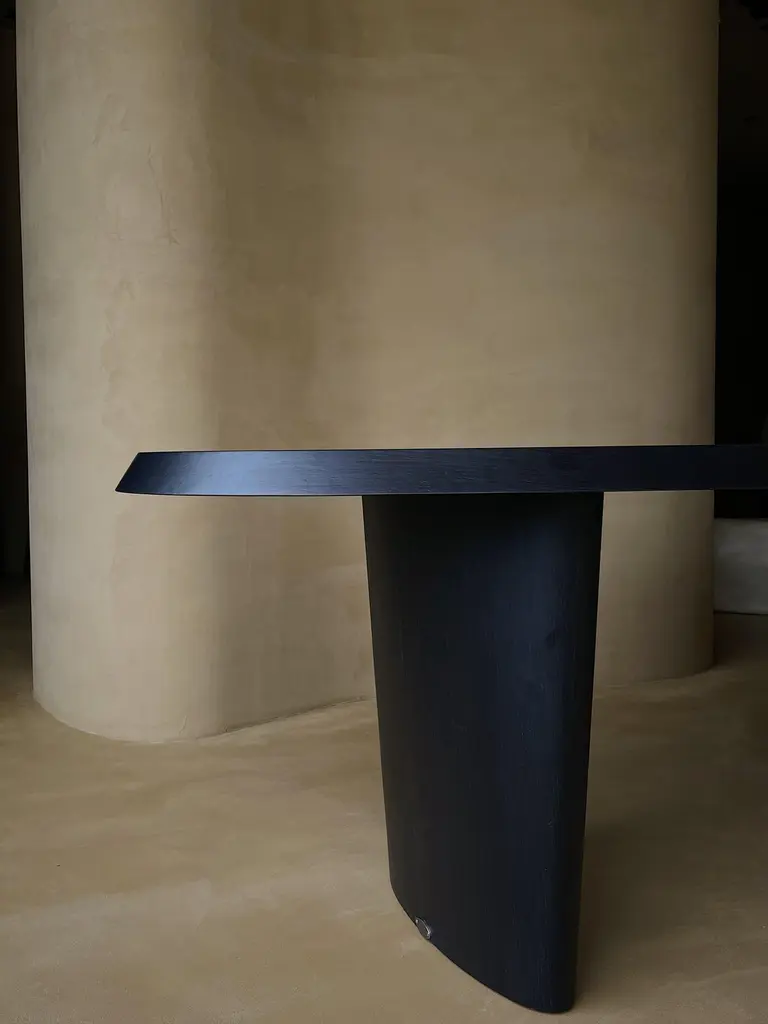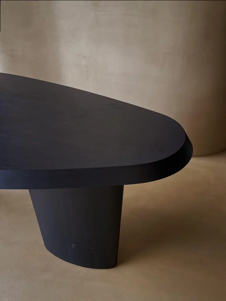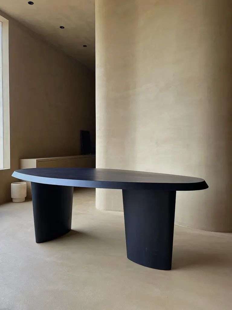 Oval dinning table by karDimensions: W 216 x D 96 x H 74 cmMaterials: Wood, Black Ash VeneerKar, is the root of Sanskrit Karma, meaning karmic repetition. We seek the cause and effect in aesthetics, inspired from the past, the present, and the future, and we create.The creation journey base on sensibility, we aim to convey emotion through the creation. From the very first kneading, the designer's current emotion, either joy or sorrow, affects the strength and trace on the clay. The overall edges and the lines are inornate and plainness, representing a true emotion, "not by intention".Due to the use of this organic material, the finish will have irregularities, those are not imperfections but part of the visual will of the designers and makers.