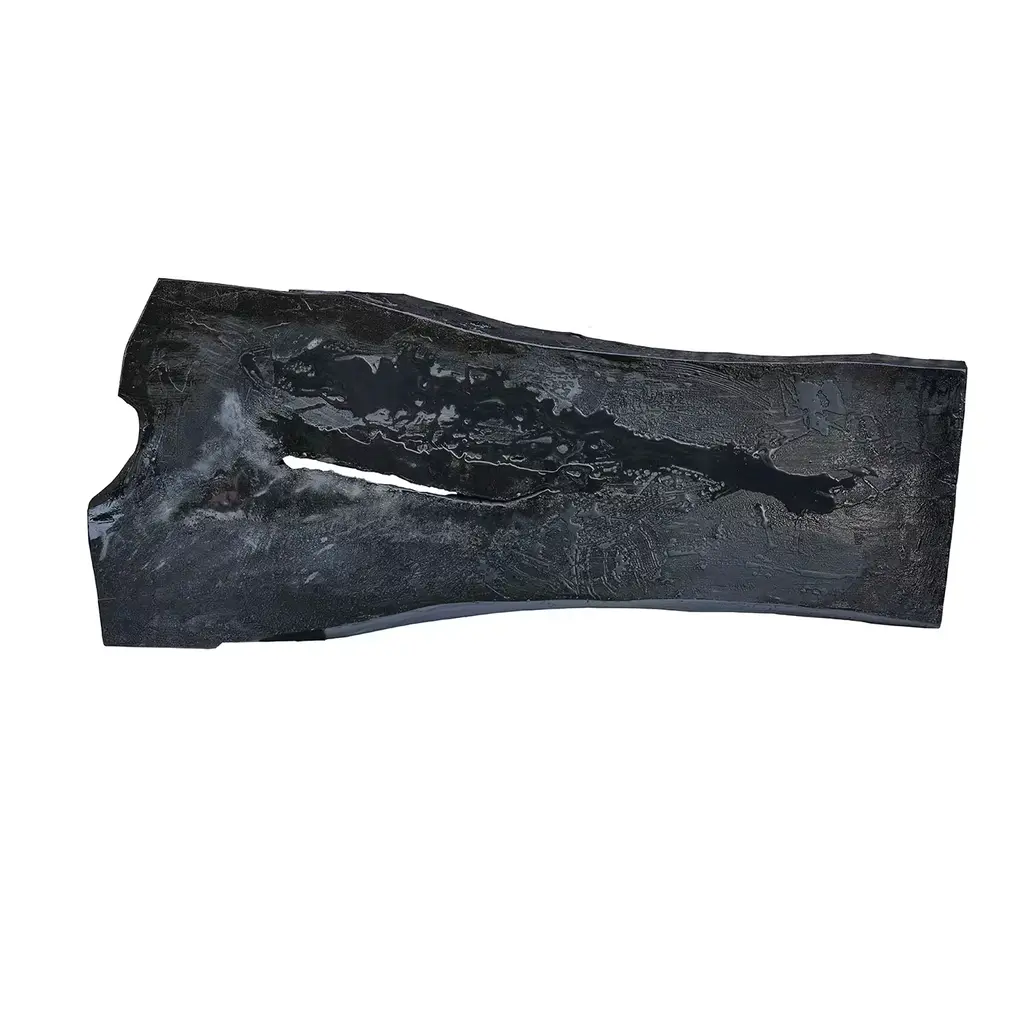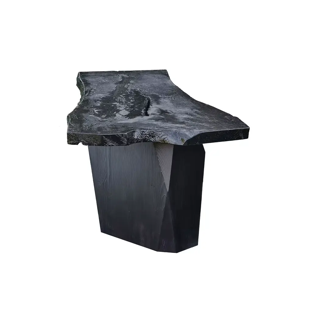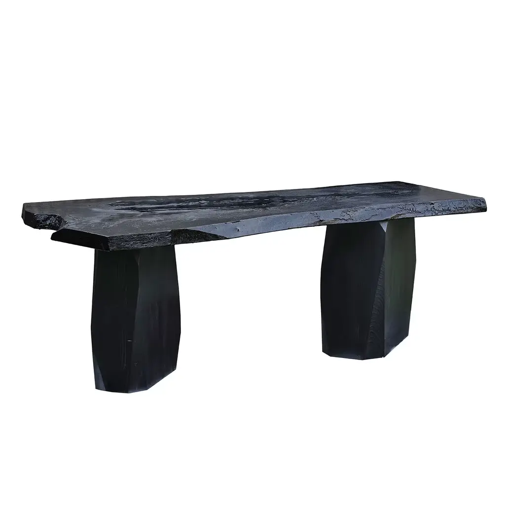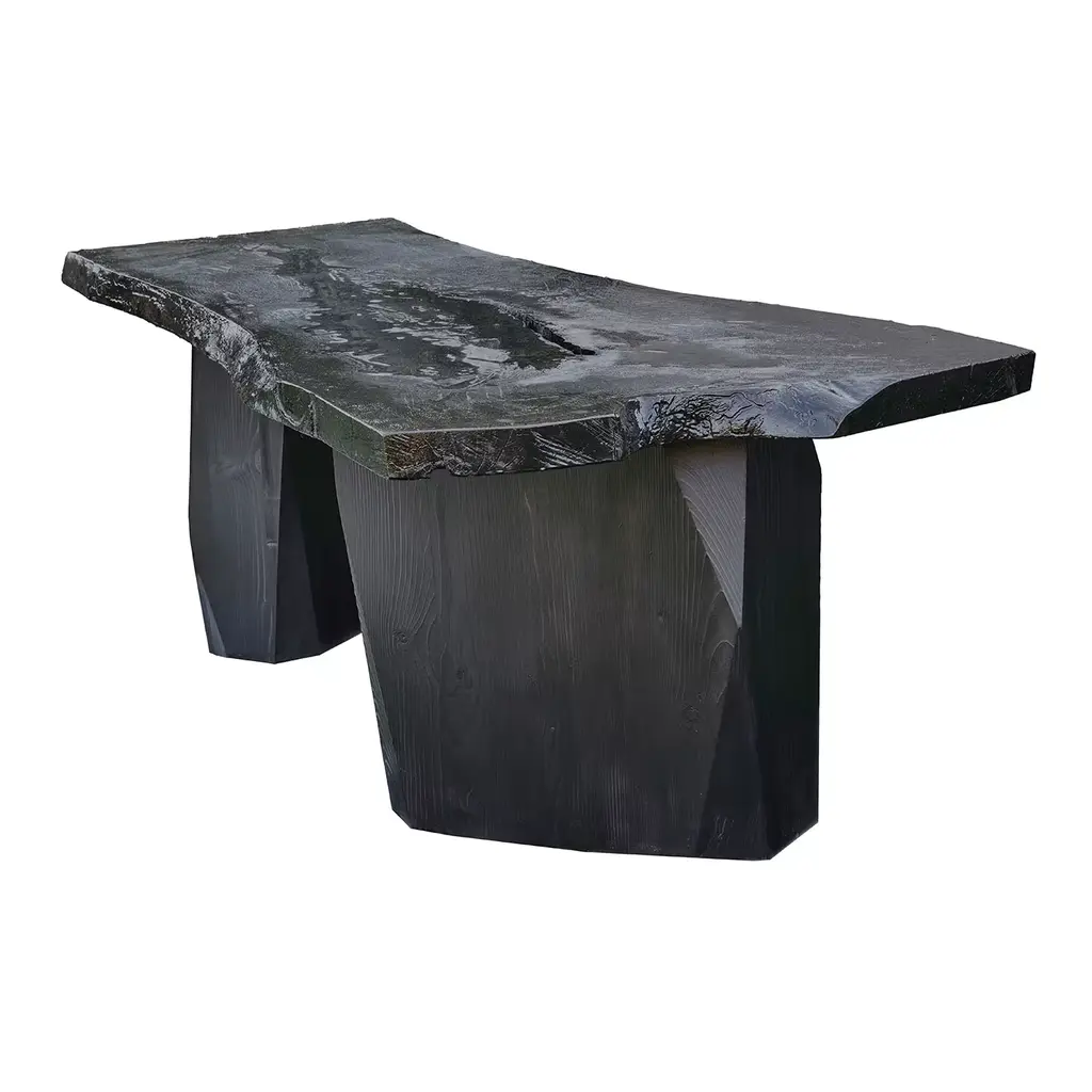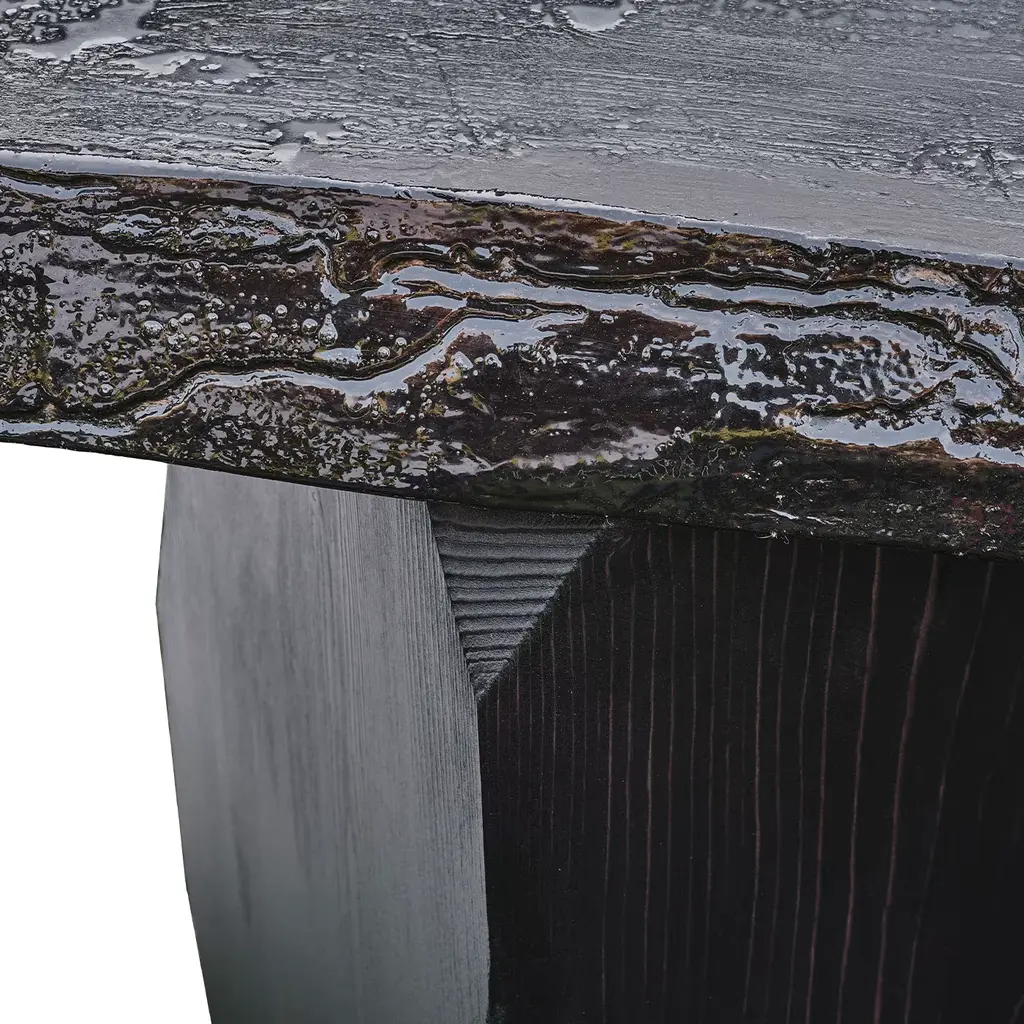 This hand-painted and resined sculptural dining table is inspired by dolmens, literally stone tables, for the prehistoric flavor of the gigantism of its feet and for the appearance of an archaeological find of the top consumed by time and in which the signs of aging become the characteristic that makes it unique. The feet are sculpted by hand. The texture is treated with many layers and resin and looks like rocks. The raw materials used in the manufacturing process differ every time, consequently, there may be natural variations that are not to be considered flaws.