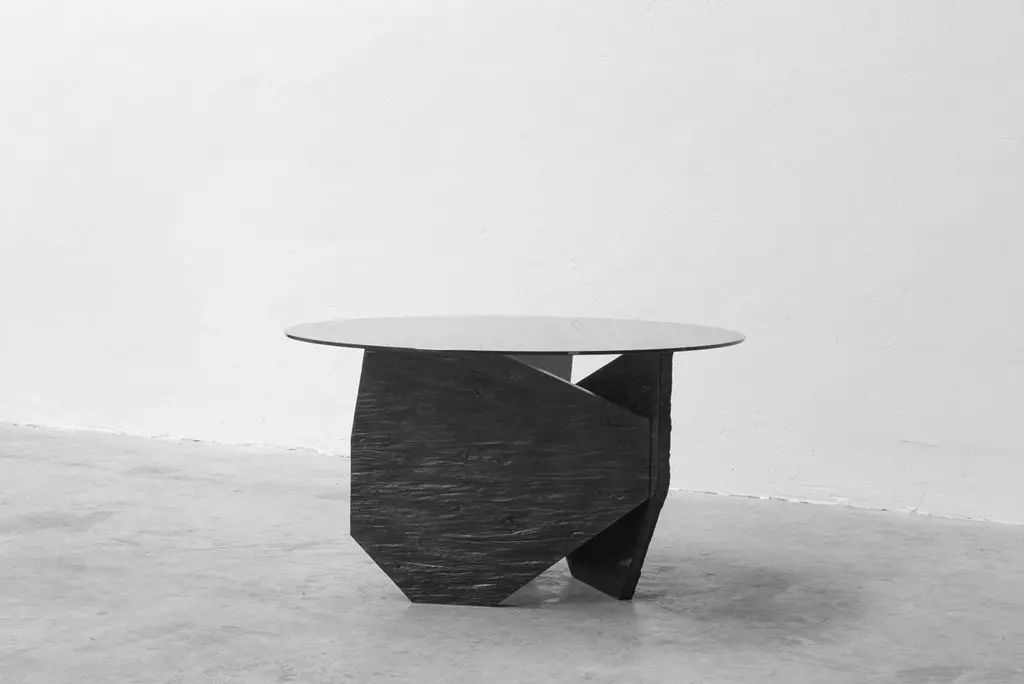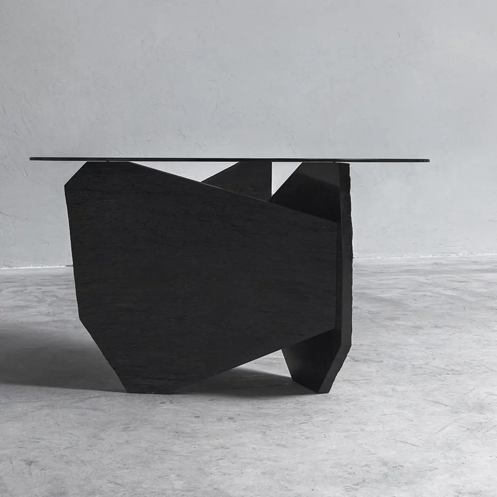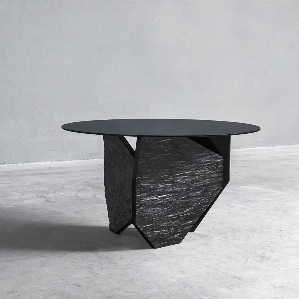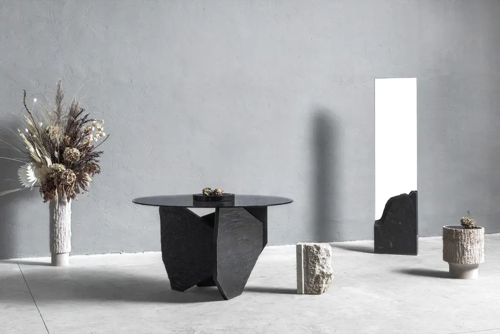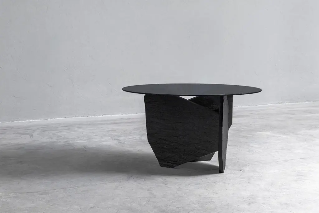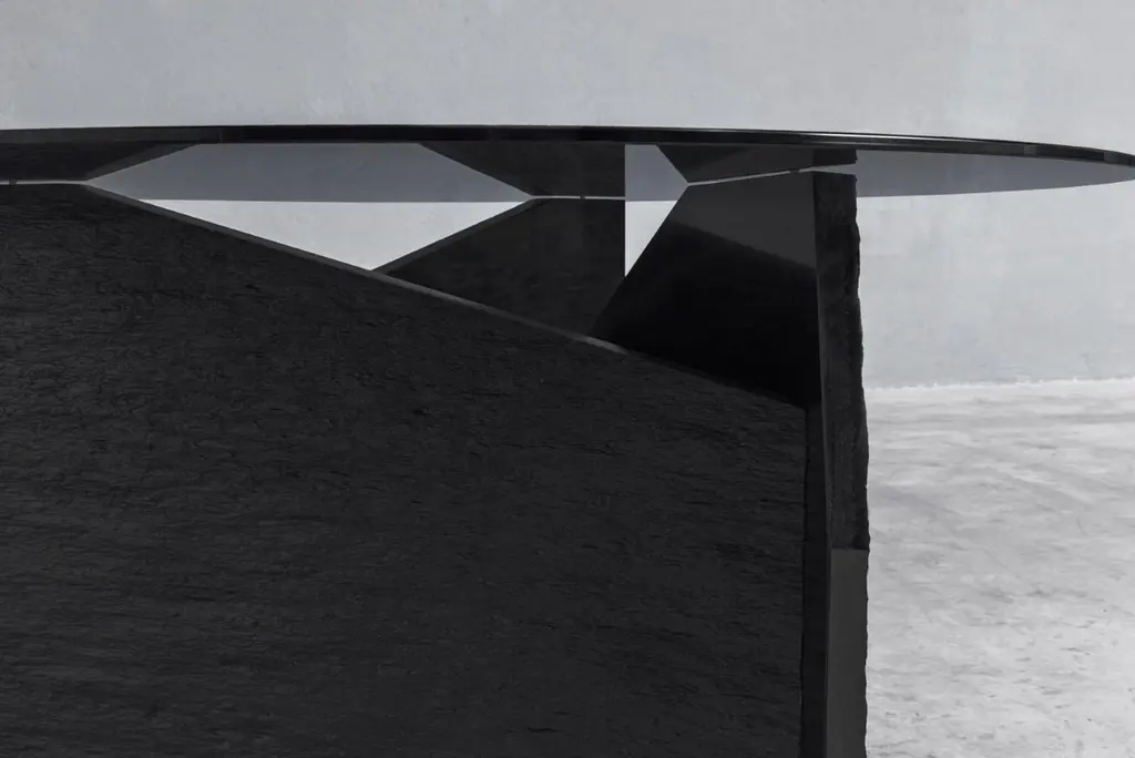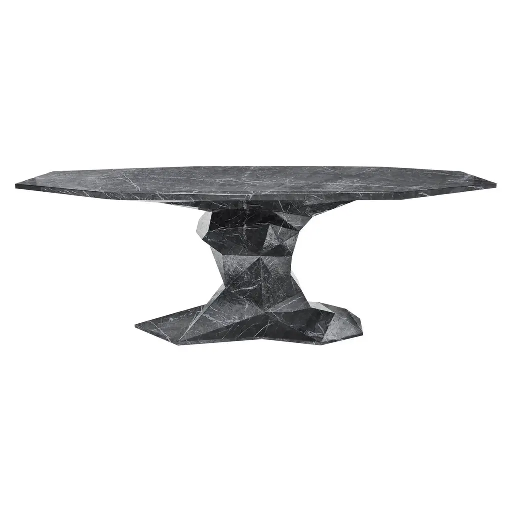 Marble slate dining table Signed by Frederic Saulou.Limited edition : 3 / 8.Designer: Frederic Saulou.Title: Fragmenté.Materials: Black Slate, grey smocked mirror.Dimensions: 75 x 130 x 130 cmEdition of eight.Signed and numbered."While wandering in the streets I have been observing buildings construction toward the sky and found myself eagerly interested in slate material and ornamental stones.I am wondering about post-Industrial heritage of local mineral material and widen the range of possibilities in creating functional objects for the house and in questioning history, material and its usual impact between art and design. Thus, I want to distort, democratize and increase the value of this material as a future heritage and above all as a food for thought. To bring traditional and Industrial know-how face to face for creative purposes, to reinterpret the material in formal and conceptual ways so as to provide it a new understanding."Frederic Saulou's sculpted design artworks introduce a series of work coming from researches andpartnerships between local ateliers and designer, and implemented to another scale: That of the object and contemporary creation.Frédéric Saulou is a proeminent French contemporary designer.Born in 1989, Frédéric Saulou, lives and works in Rennes, in France. Graduated in space and environmental design at the Institut Supérieur des Arts Appliqués (LISAA) in 2011 and in object design at the Ecole Européenne Supérieure des Beaux Arts de Rennes (EESAB) in 2013, Frédéric will continue to perfect his experience within the Eric Gizard Associés agency and with the designer Frédéric Ruyant. In 2013, he founded the studio, Frédéric Saulou Design Studio, an independent and multidisciplinary design and consulting agency that sees design as a space for research and exchange that allows him to develop a sensitive approach to forms and materials.Experimentation and research take precedence over his work in order to think of new materials and new uses. This accompanies his daily approach so that each project is conceived as a sculpture in its own right, between simplicity and technicality. His approach guides him towards a global approach but also unique in his creations, thus creating particular interactions between the user and the object, between Industrial craftsmanship. Today Frédéric works on various projects, from objects to space, in series or limited editions and collaborates with prestigious institutions and brands such as the publishing houses Ligne Roset, Drugeot Manufacture, Brossier Saderne, Vista Alegre, Esprit Porcelaine Limoges etc.