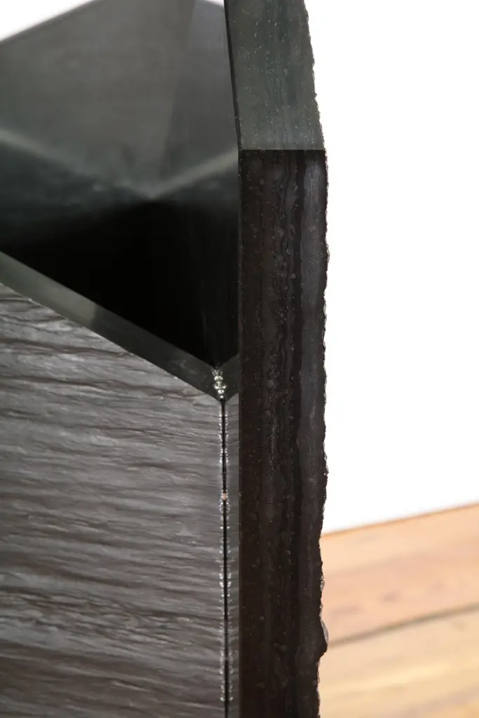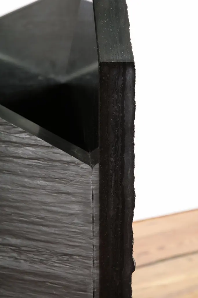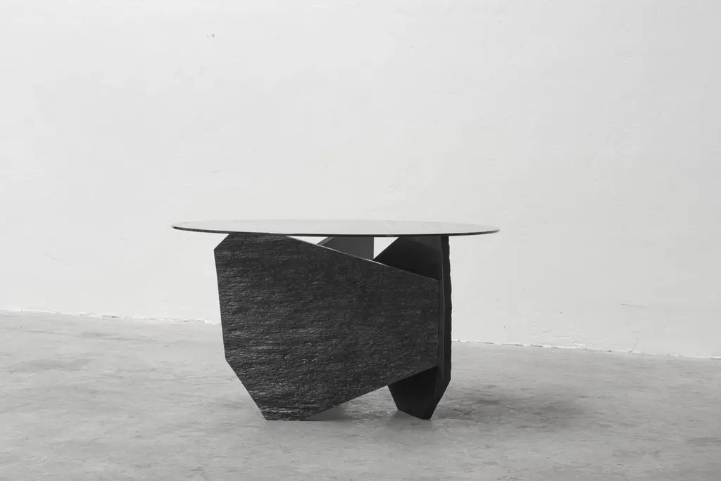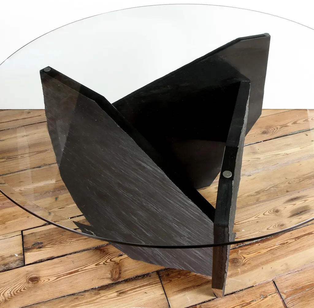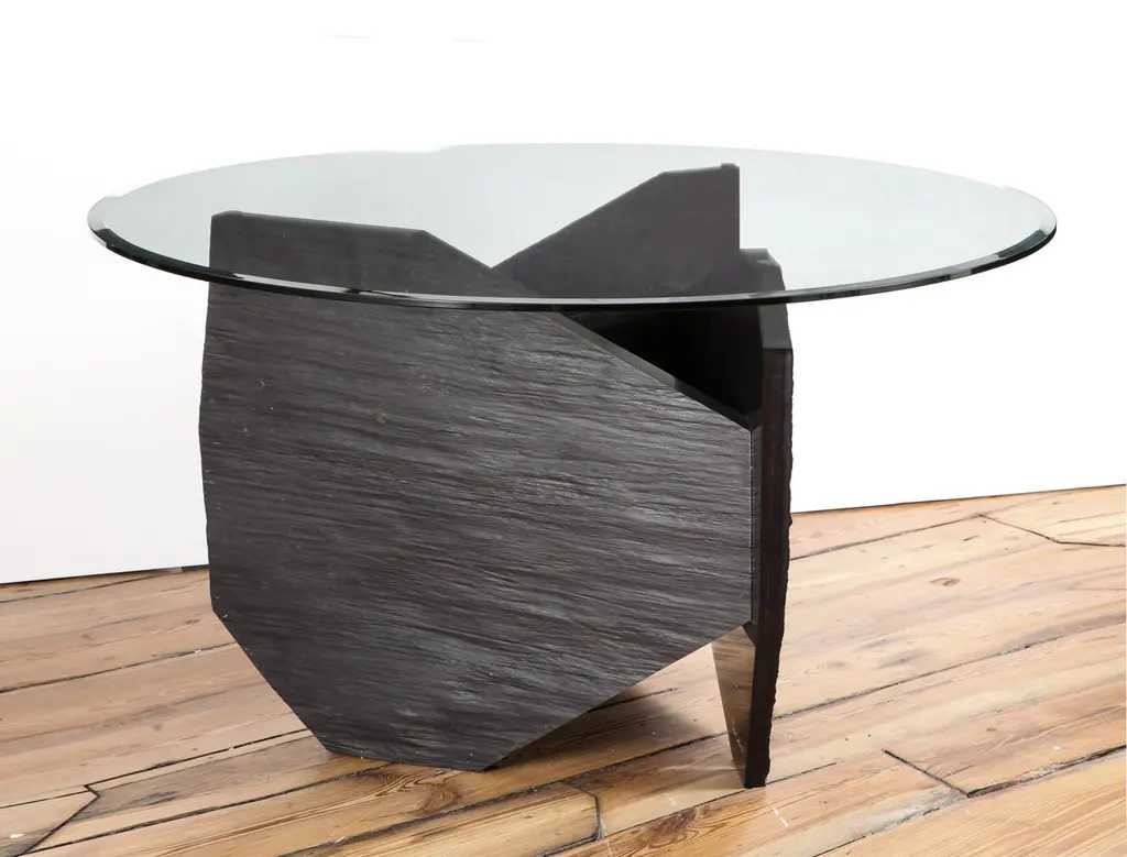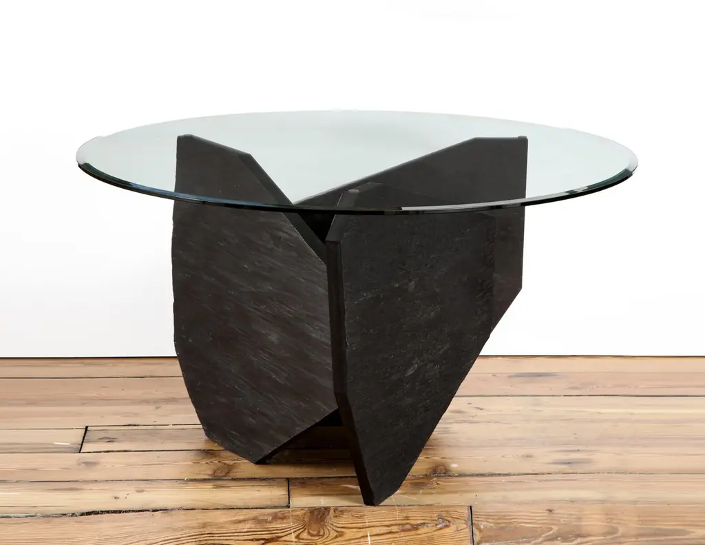 Marble slate dining table signed by Fre´de´ric SaulouDesigner: Fre´de´ric Saulou.Title: Fragmenté.Materials: Black Slate, grey smocked mirrorDimensions: 75 x 130 x 130 cmEdition of eight.Signed and numbered."While wandering in the streets I have been observing buildings construction toward the sky and found myself eagerly interested in slate material and ornamental stones.I am wondering about post-Industrial heritage of local mineral material and widen the range of possibilities in creating functional objects for the house and in questioning history, material and its usual impact between art and design. Thus, I want to distort, democratize and increase the value of this material as a future heritage and above all as a food for thought. To bring traditional and Industrial know-how face to face for creative purposes, to reinterpret the material in formal and conceptual ways so as to provide it a new understanding."Frederic Saulou's sculpted design artworks introduce a series of work coming from researches andpartnerships between local ateliers and designer, and implemented to another scale: That of the object and contemporary creation.Frédéric Saulou is a proeminent French contemporary designer.Born in 1989, Frédéric Saulou, lives and works in Rennes, in France. Graduated in space and environmental design at the Institut Supérieur des Arts Appliqués (LISAA) in 2011 and in object design at the Ecole Européenne Supérieure des Beaux Arts de Rennes (EESAB) in 2013, Frédéric will continue to perfect his experience within the Eric Gizard Associés agency and with the designer Frédéric Ruyant. In 2013, he founded the studio - Frédéric Saulou Design Studio - an independent and multidisciplinary design and consulting agency that sees design as a space for research and exchange that allows him to develop a sensitive approach to forms and materials. Experimentation and research take precedence over his work in order to think of new materials and new uses. This accompanies his daily approach so that each project is conceived as a sculpture in its own right, between simplicity and technicality. His approach guides him towards a global approach but also unique in his creations, thus creating particular interactions between the user and the object, between industrial craftsmanship. Today Frédéric works on various projects, from objects to space, in series or limited editions and collaborates with prestigious institutions and brands such as the publishing houses Ligne Roset, Drugeot Manufacture, Brossier Saderne, Vista Alegre, Esprit Porcelaine Limoges etc.