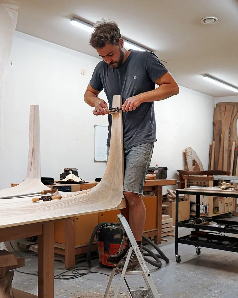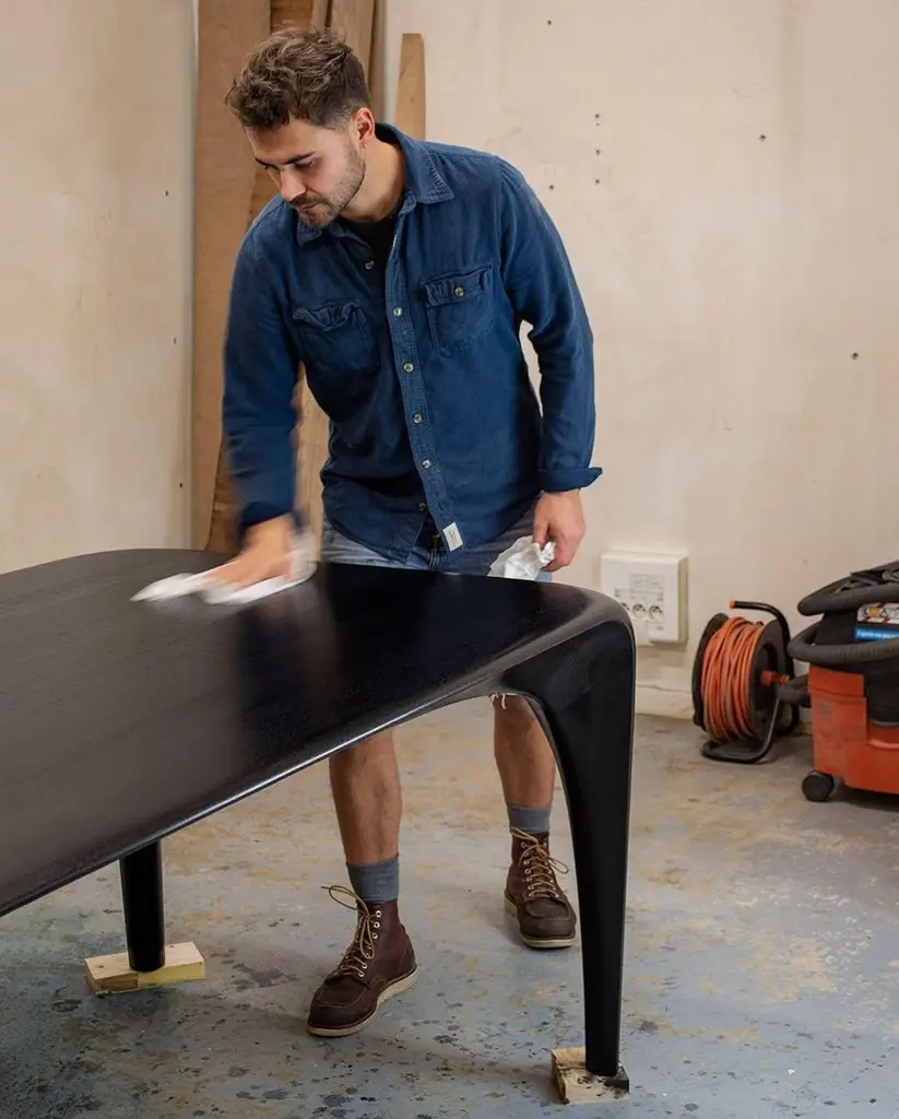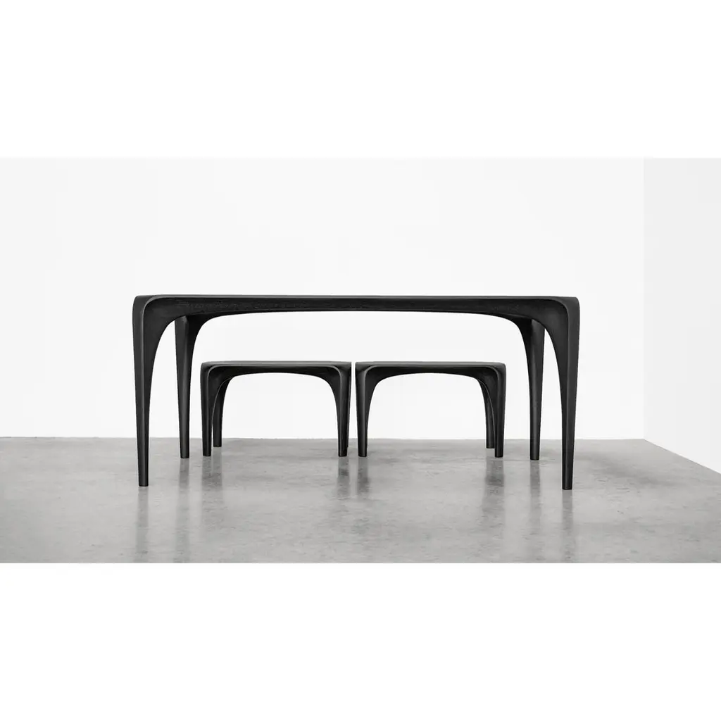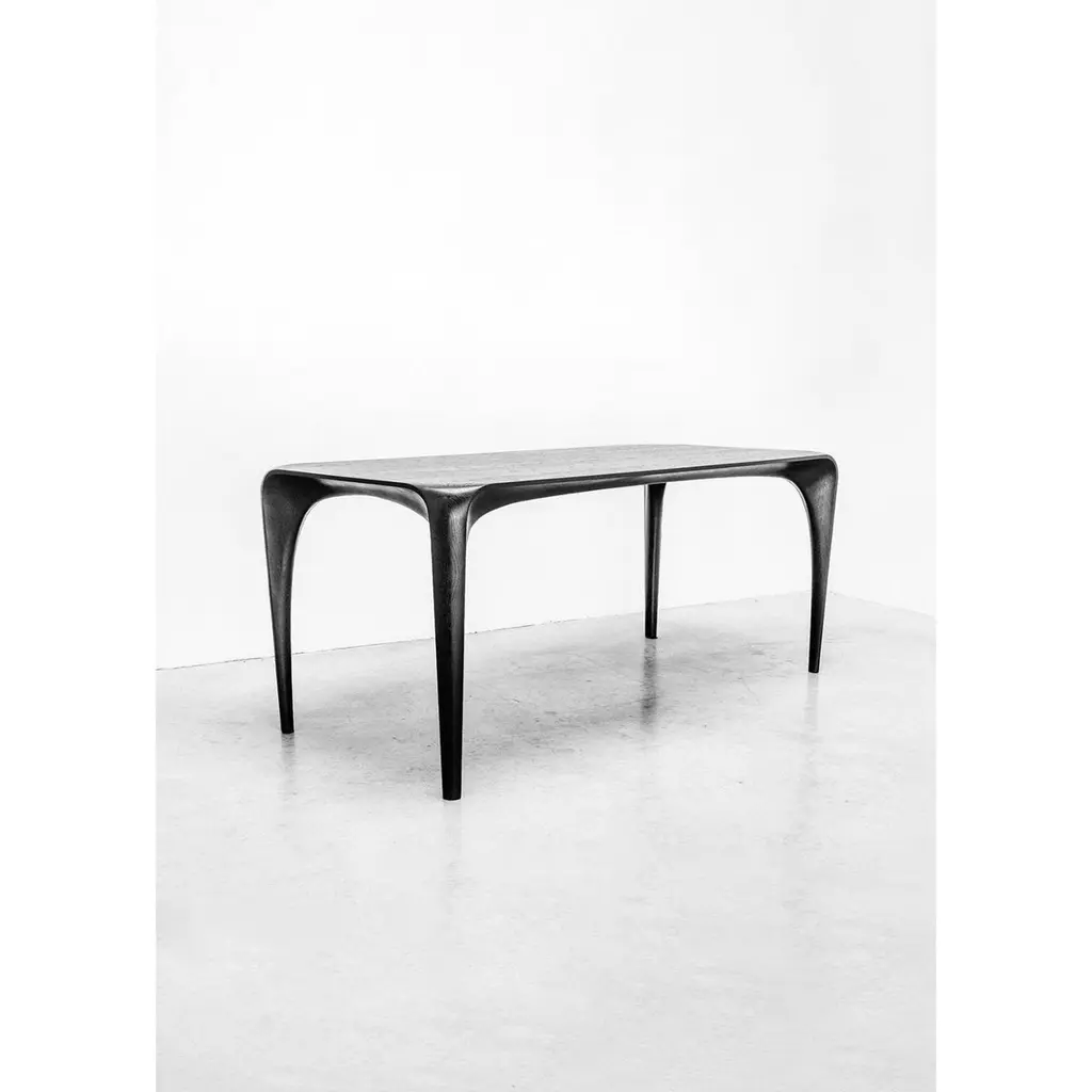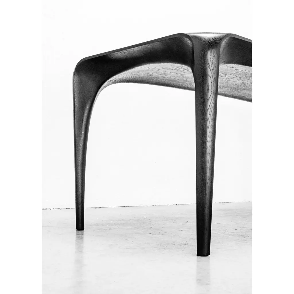 Black Stained Ash Dining Table Spline Hand-Carved and Signed by Maxime GoléoUnique PieceDimensions: W 180 x D 83 x H 76 cmMaterials: French walnutEach piece is unique, handmade, signed and dated.Other dimensions and types of wood on request.Designer, cabinetmaker and sculptor, Maxime Goléo creates contemporary furniture in solid wood, in unique pieces or in limited editions. Objects halfway between furniture and sculpture. He is interested in nature, tension, articulation and movement. He moves away from geometric and rectilinear shapes to tend towards organic, sensual and refined lines. His creations are to be seen, to be touched and to be felt. His objects, through their bold and expressive shapes, provoke emotions, which invite to a sensory experience, particularly visual and tactile. They interact with the user beyond the functional aspect. He is interested in the radiation of objects and their influence on the individual.