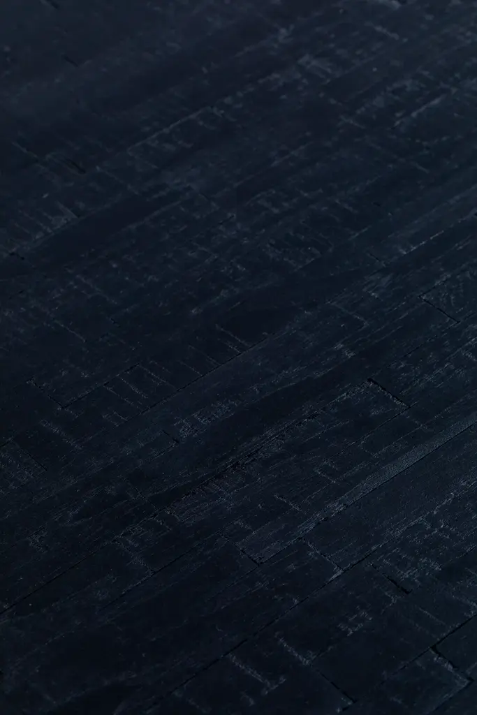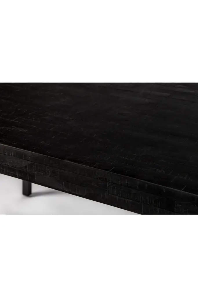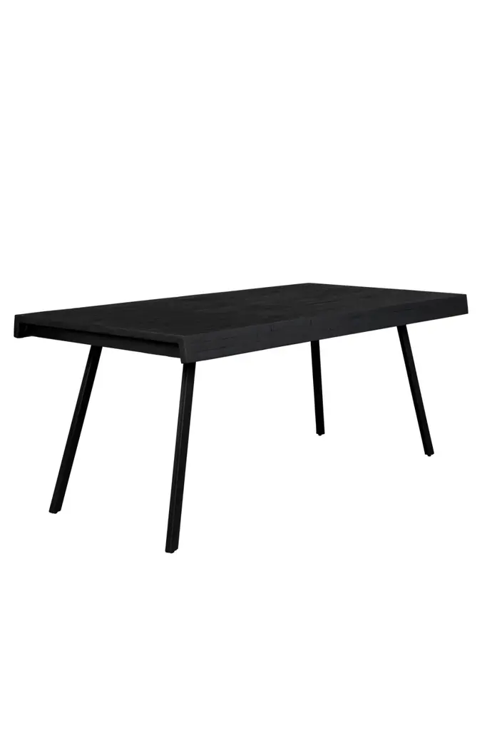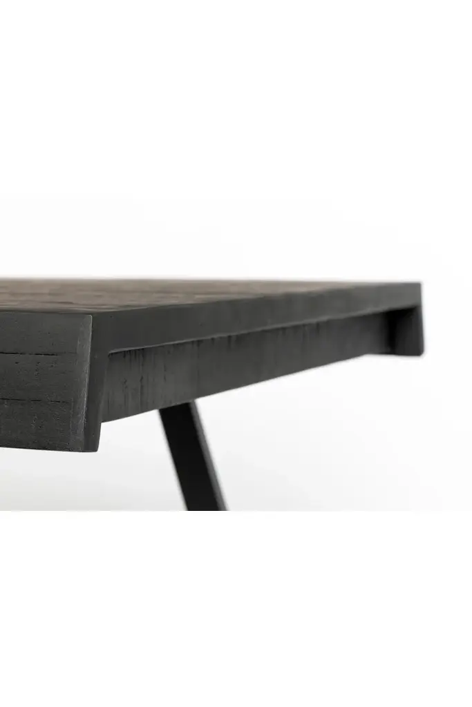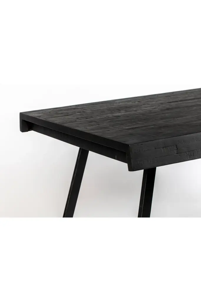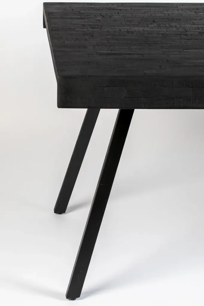 Chic meets sustainable style, the Suri Dining Table by DF breathes new life into recycled teak wood. Its rectangular tabletop dazzles with a matte black finish and a clear nitro lacquer coating, allowing the wood's inherent beauty to shine through. Supported by black diagonal steel legs, this table seamlessly blends eco-conscious design with a contemporary edge.