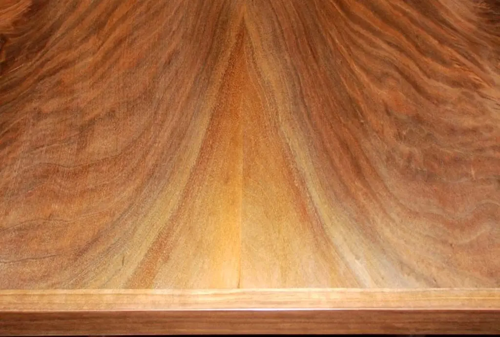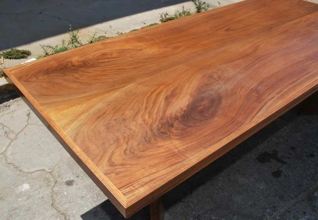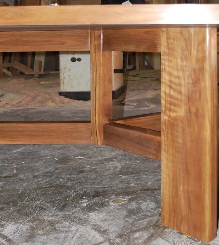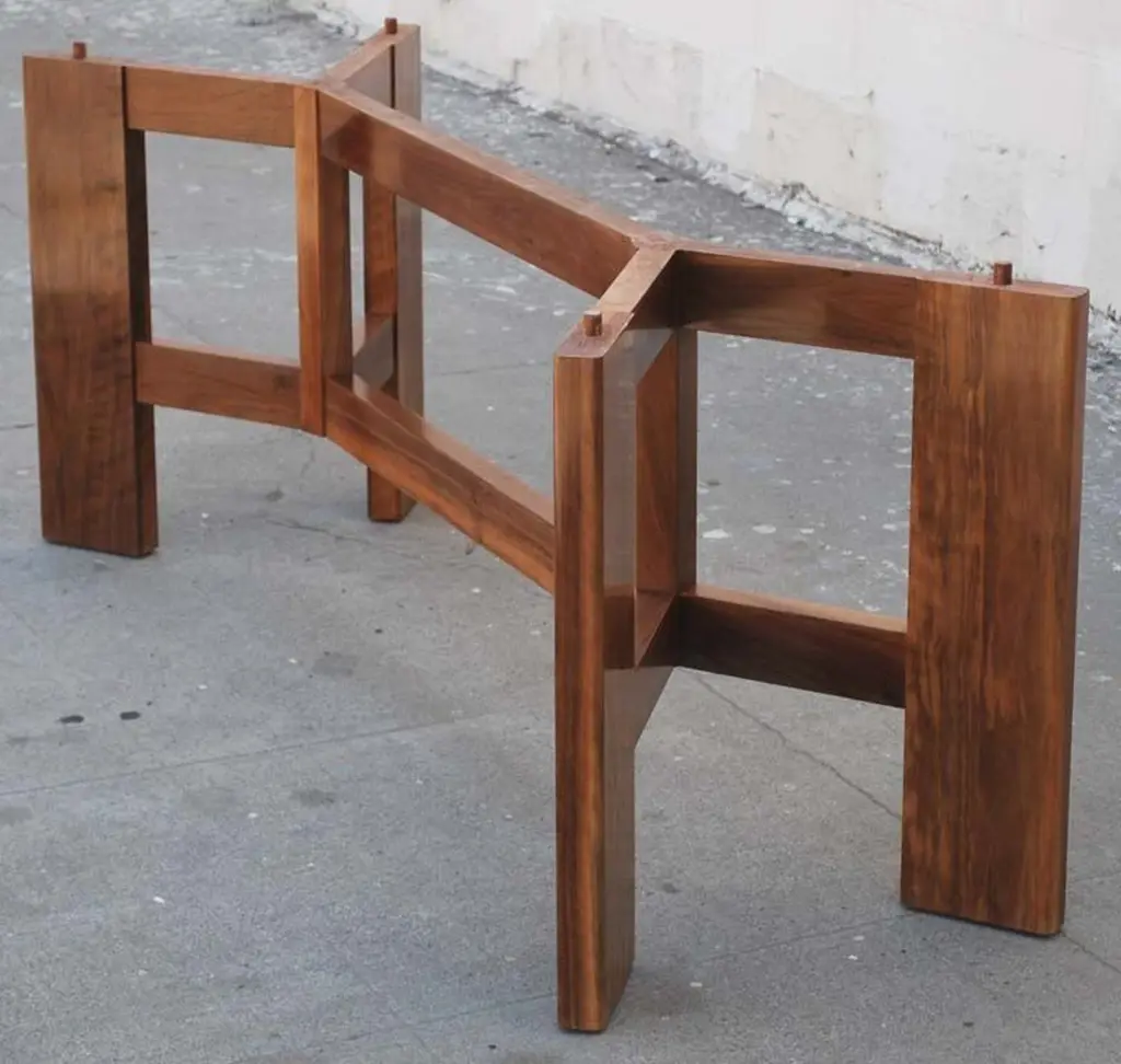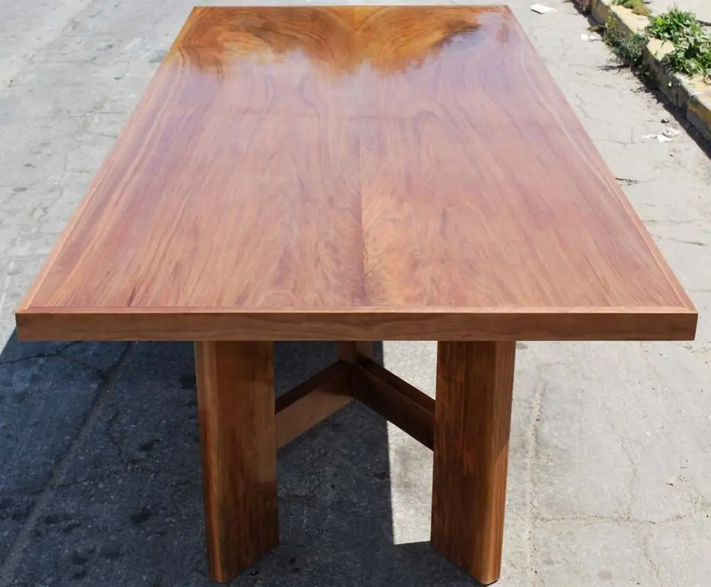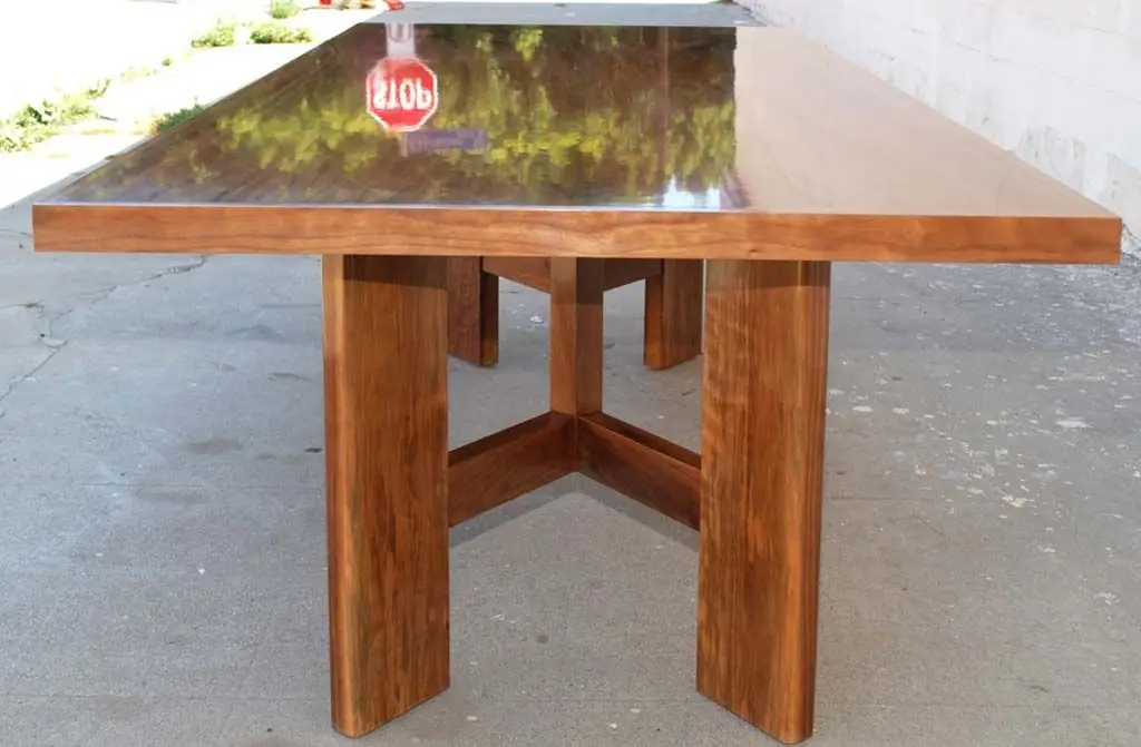 This modern dining table is made from vintage, book-matched, black walnut sister flitches with beautiful figuring and flame. Because each table is bench-made in our own Los Angeles workshop you can influence all aspects of design, including size, wood species and finish. We use only traditional carpentry techniques, no nails or metal fasteners of any kind, just mortise and tenon construction reinforced with hand-cut wooden dowels. If you require customized overhang dimensions please stipulate with order.