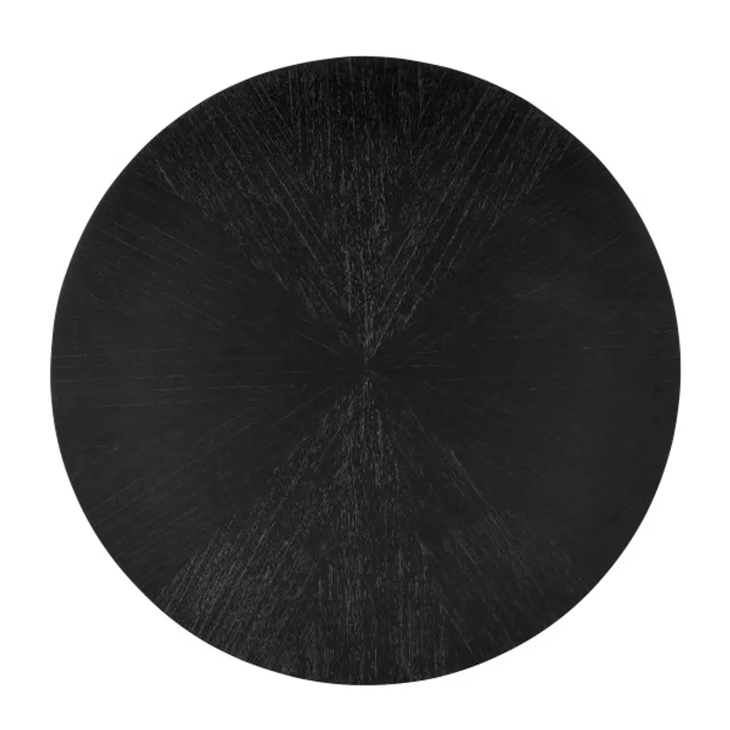 The dining table is made of Mindi wood with a matte finish. The legs that curve up from the bottom hold a round top that has a subtle starburst pattern on the Mindi wood veneer. The feet are capped with polished brass ferrules. Because of its sleek lines, the table is stylistically contemporary.