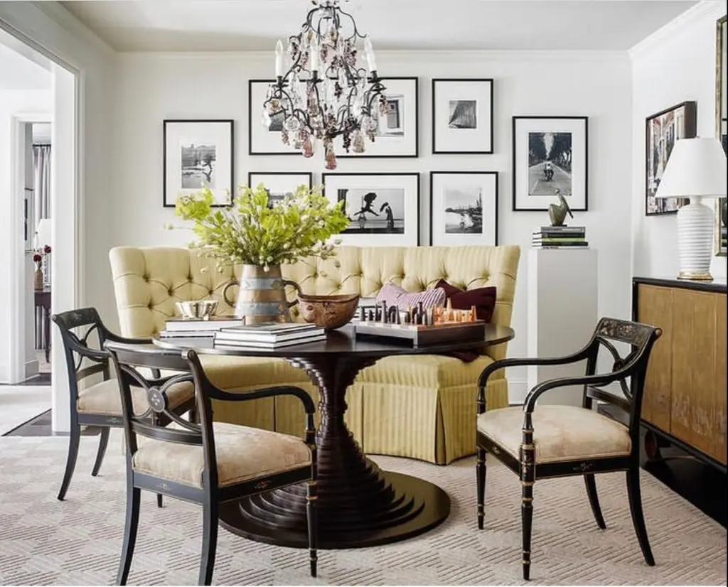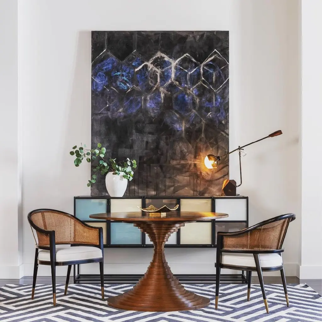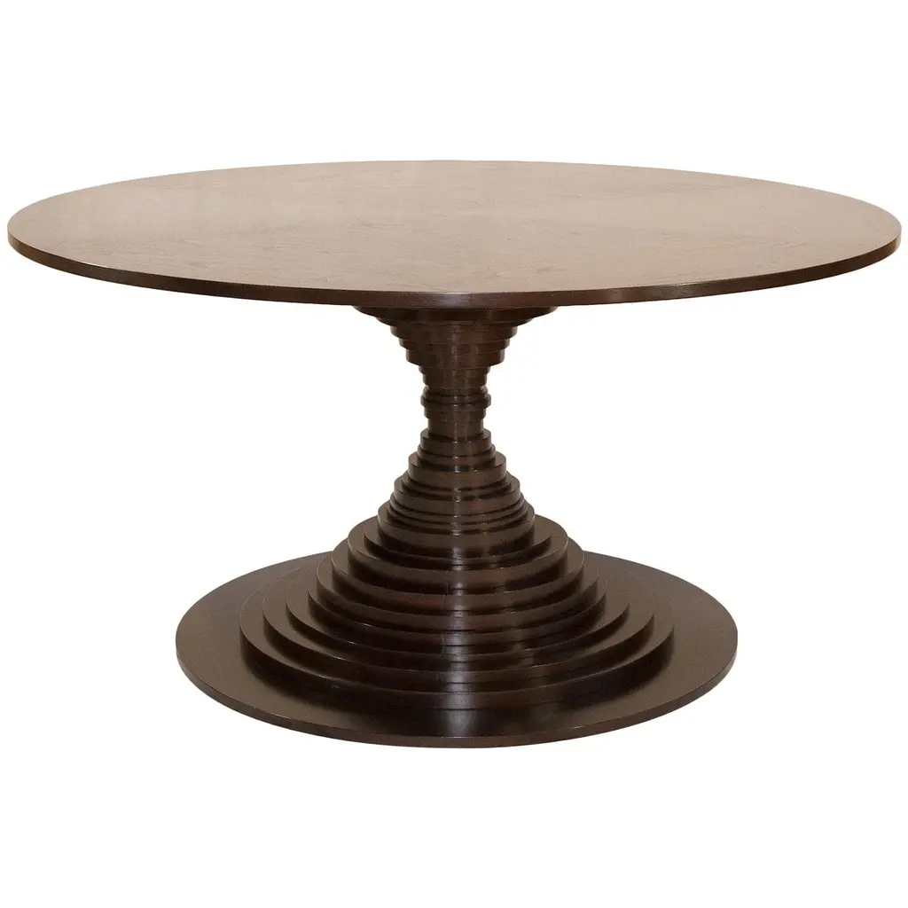 A handcrafted dining or center table. It is artfully composed of 33 individual discs. The impressive top is constructed of multiple sections of walnut or rosewood veneer creating an extraordinary Sunburst pattern. The table is engineered with traditional joinery. Custom sizes and finishes available.