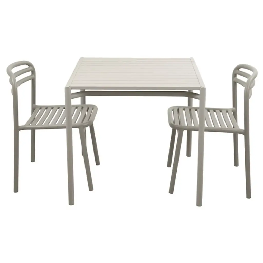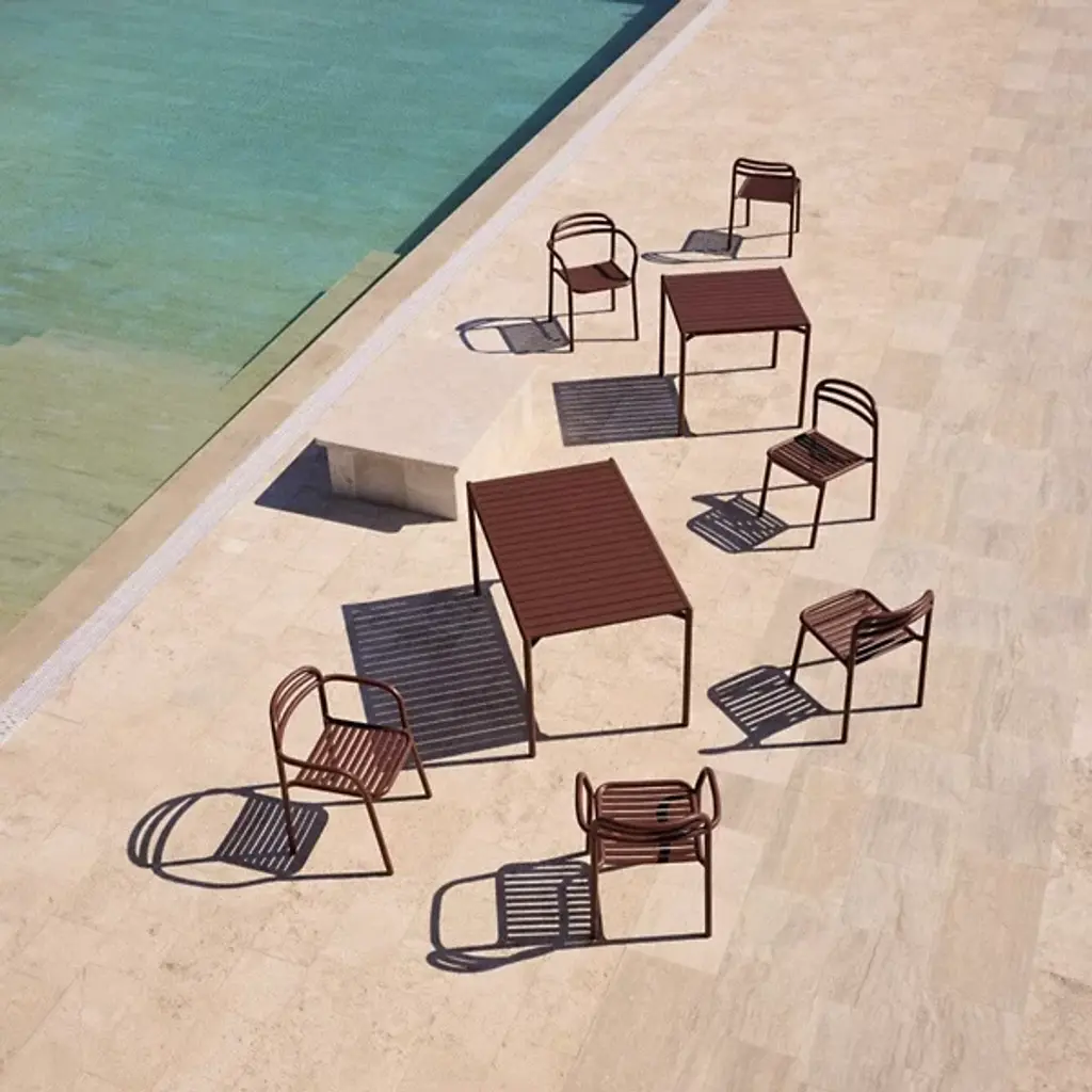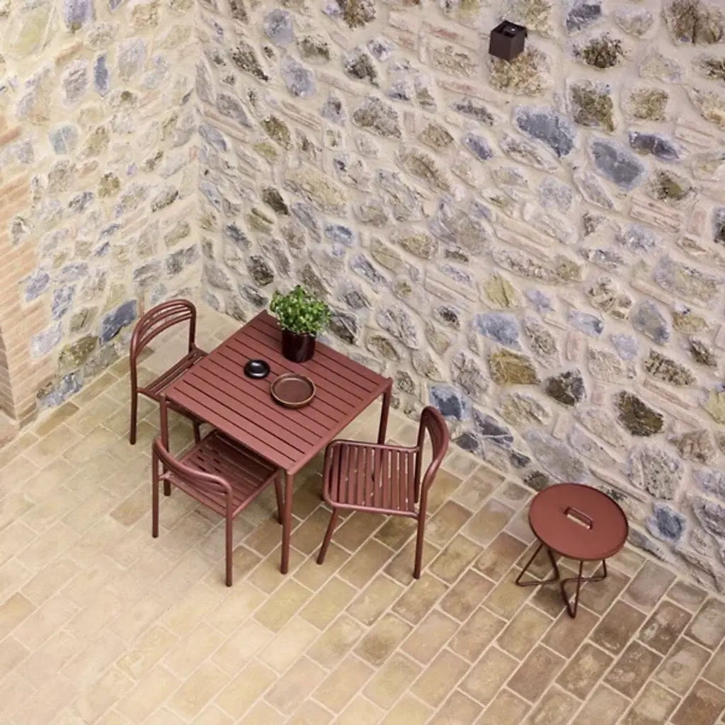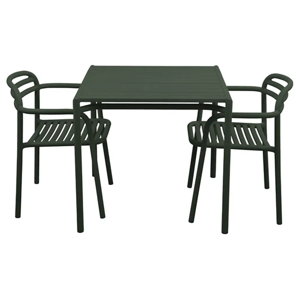 The Bliss Outdoor Dining Table from Cane-line accommodates four people comfortably with its square surface area while maintaining a compact footprint suitable for smaller outdoor spaces. The slatted tabletop design promotes drainage and air circulation, preventing water accumulation after rain exposure. Its powder-coated aluminum construction matches the Bliss seating collection, creating visual continuity across complete dining sets designed by Foersom & Hiort-Lorenzen. The table legs feature subtle cross-bracing that enhances stability without compromising the overall minimalist appearance. This dining table works particularly well on patios, balconies, or deck areas where space optimization matters.