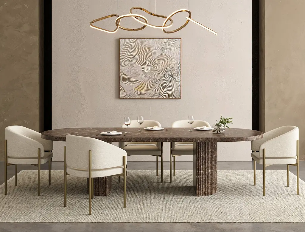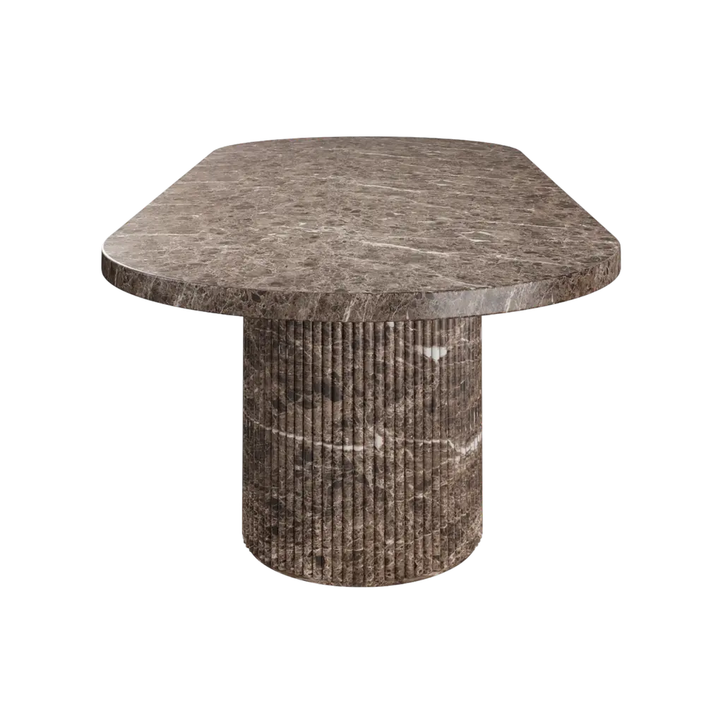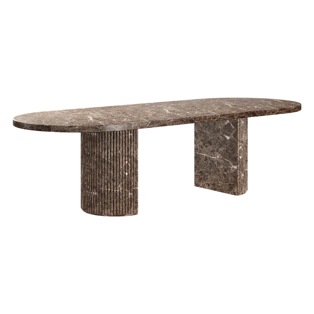 The Bloom Dining Table is a striking and modern addition to any dining space, crafted from durable concrete with a sophisticated Brown marble-like finish. Its sleek, oval tabletop is supported by two elegantly fluted pedestal bases, offering a blend of industrial strength and refined aesthetics. The unique texture and natural veining of the finish add depth and character, making it a perfect centerpiece for both casual meals and elegant gatherings.