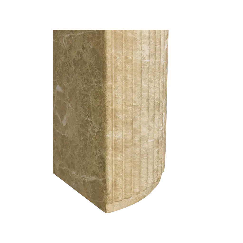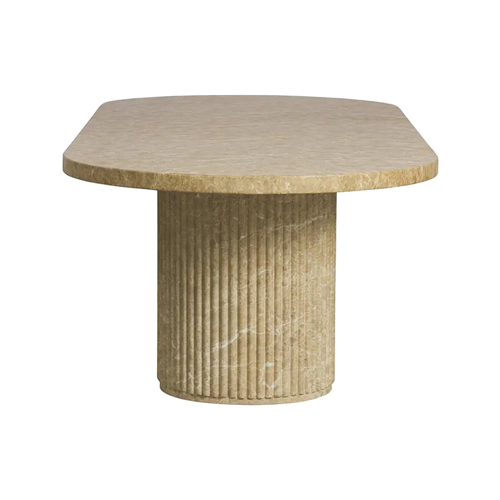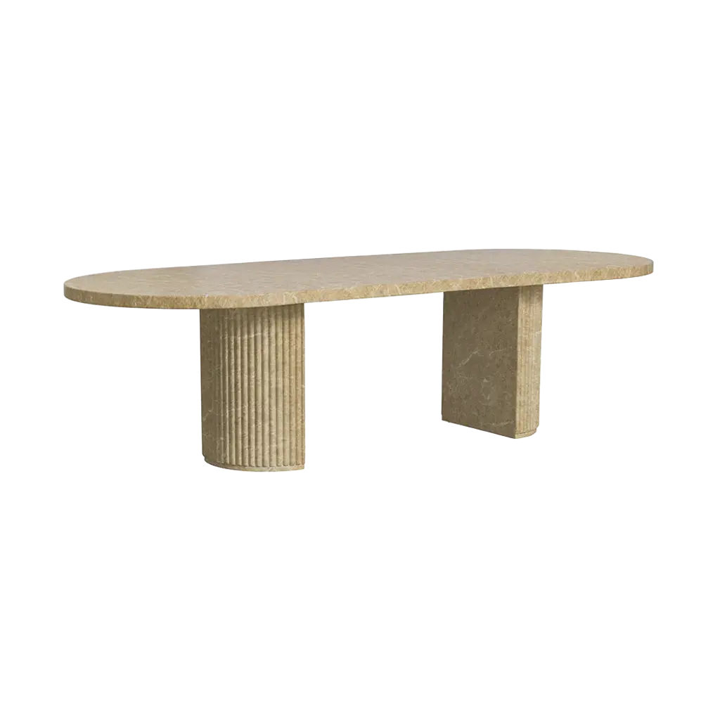 The Bloom Dining Table is a striking and modern addition to any dining space, crafted from durable concrete with a sophisticated Gold marble-like finish. Its sleek, oval tabletop is supported by two elegantly fluted pedestal bases, offering a blend of industrial strength and refined aesthetics. The unique texture and natural veining of the finish add depth and character, making it a perfect centerpiece for both casual meals and elegant gatherings.