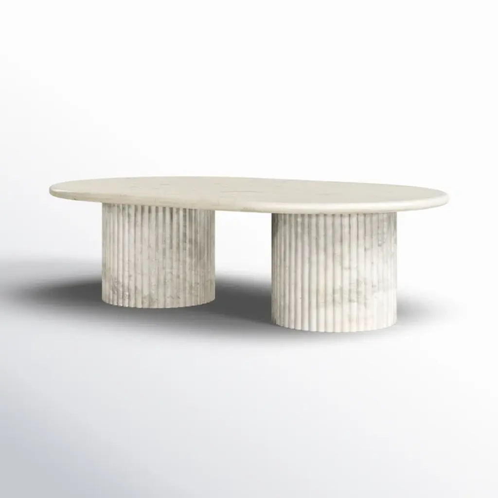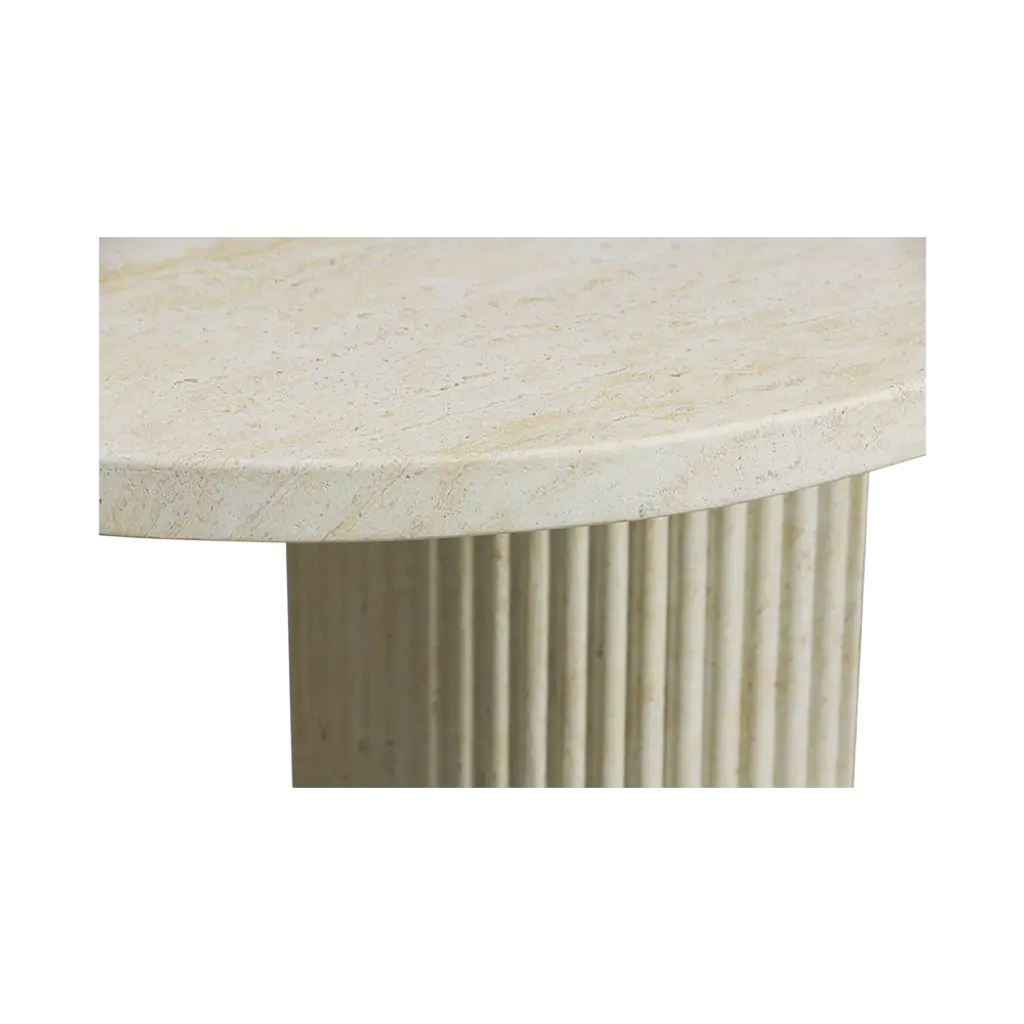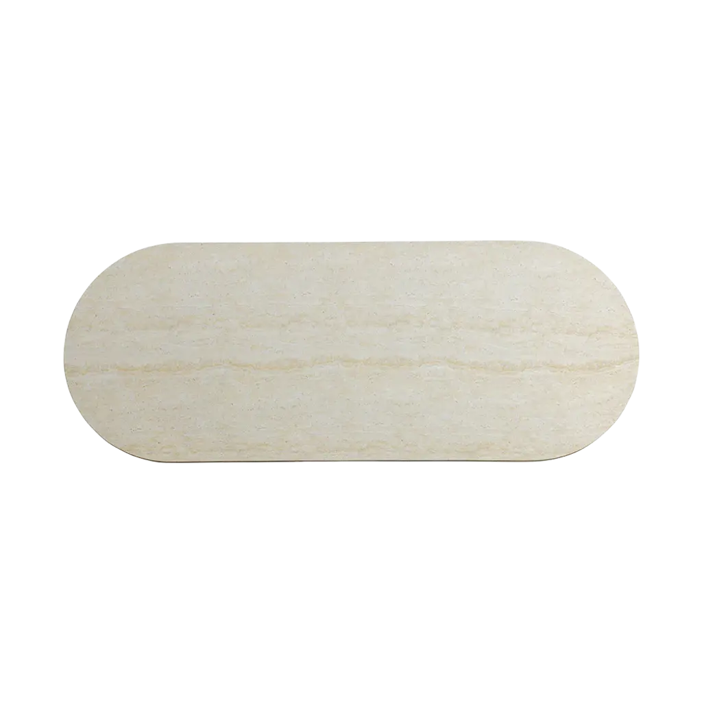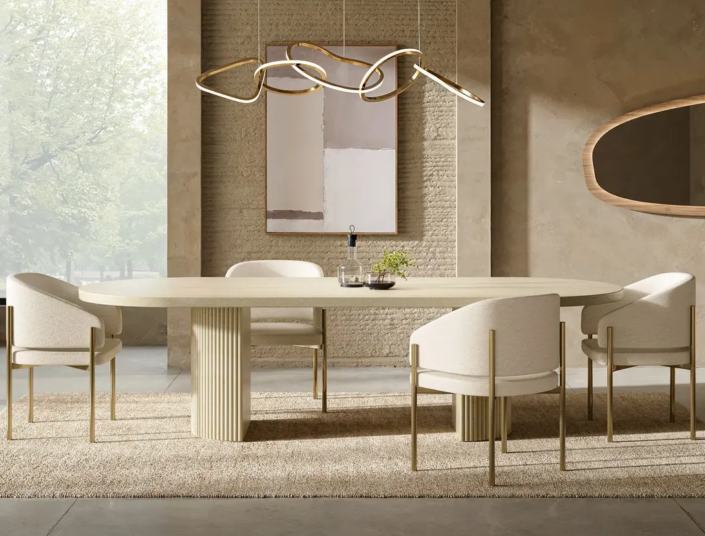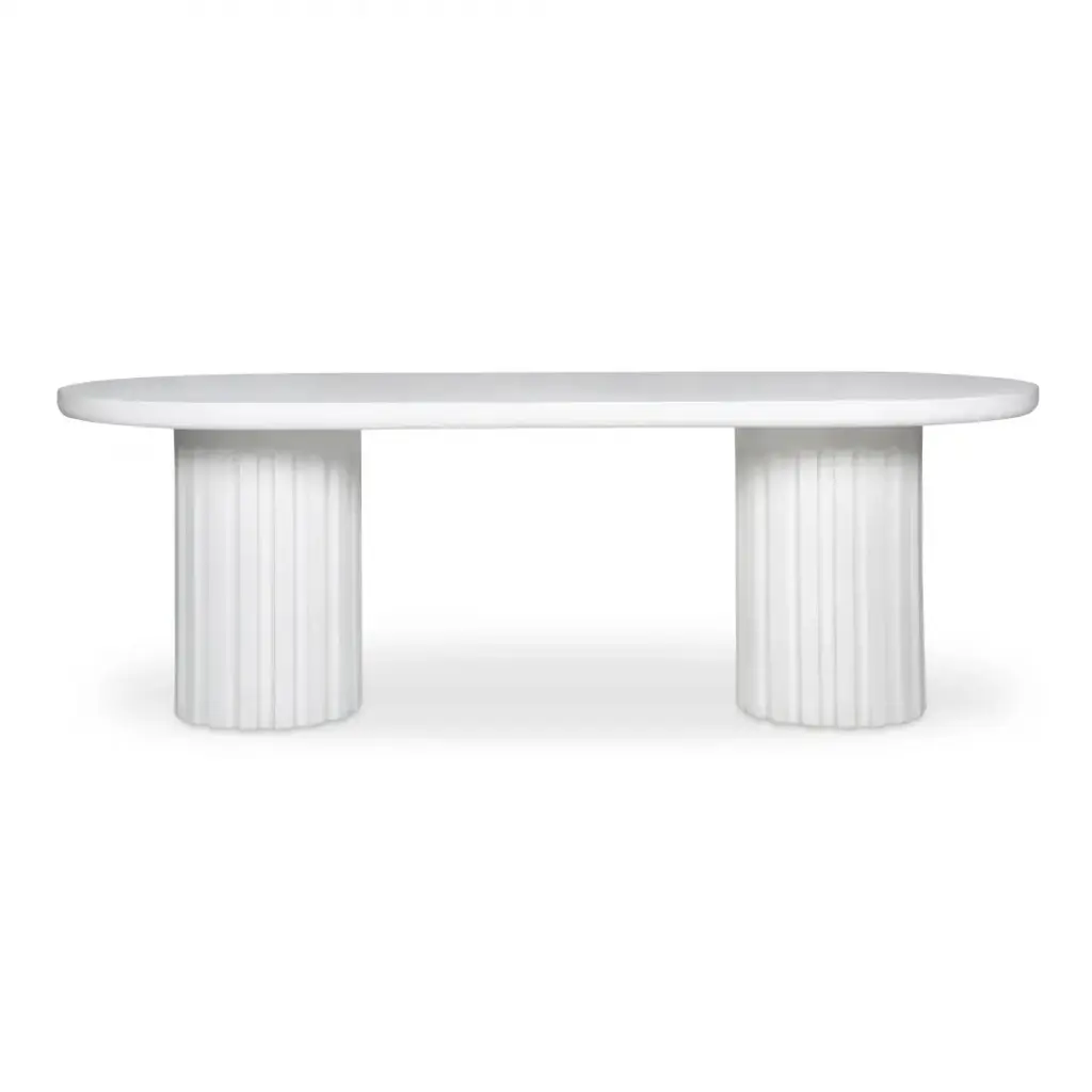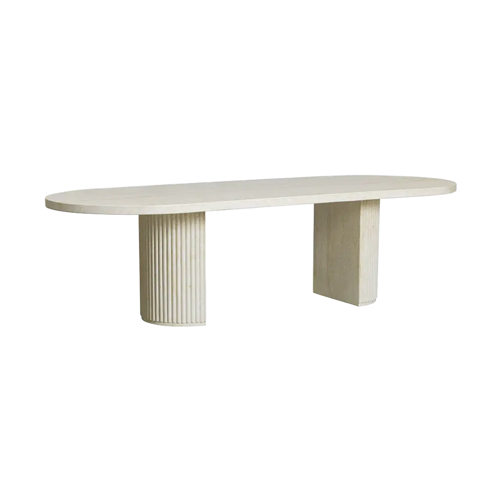 The Bloom Dining Table is a striking and modern addition to any dining space, crafted from durable concrete with a sophisticated Travertine finish. Its sleek, oval tabletop is supported by two elegantly fluted pedestal bases, offering a blend of industrial strength and refined aesthetics. The unique texture and natural veining of the finish add depth and character, making it a perfect centerpiece for both casual meals and elegant gatherings.