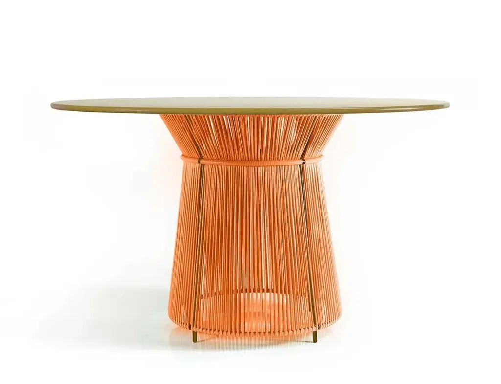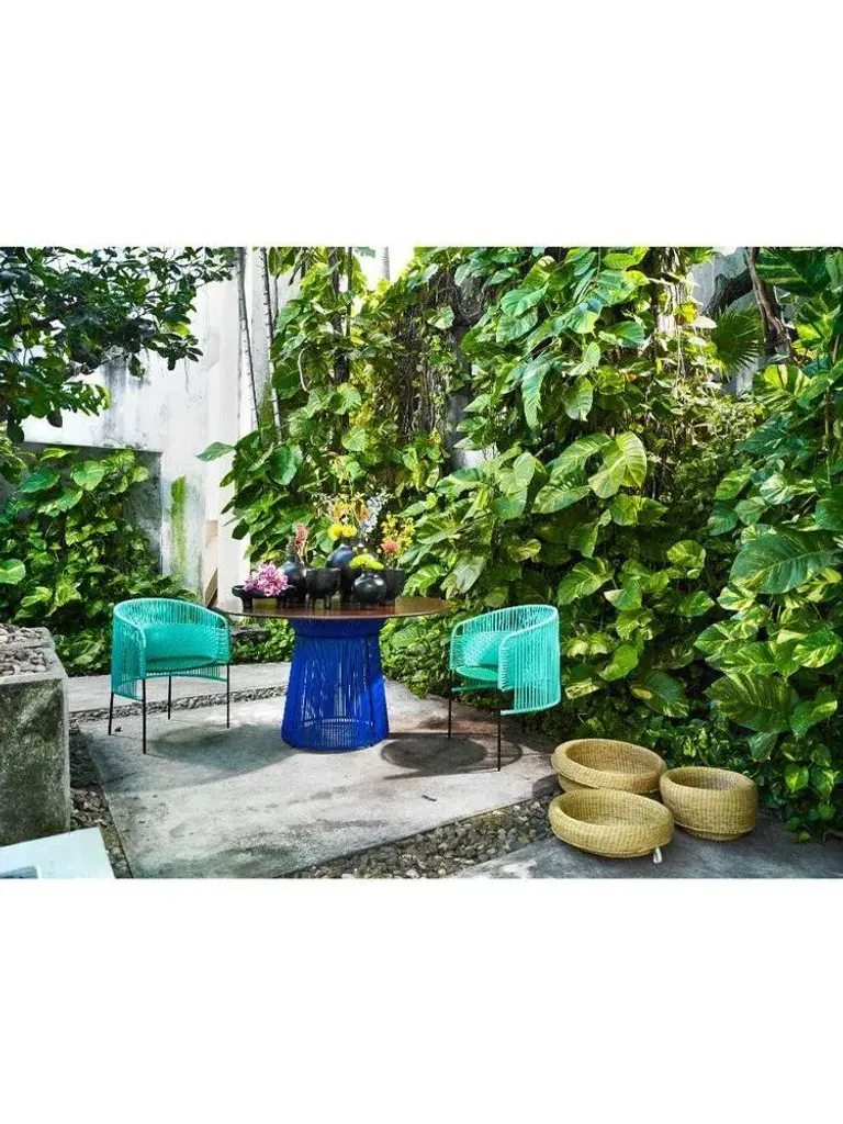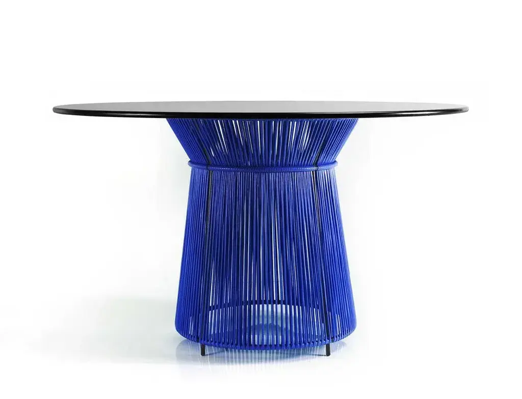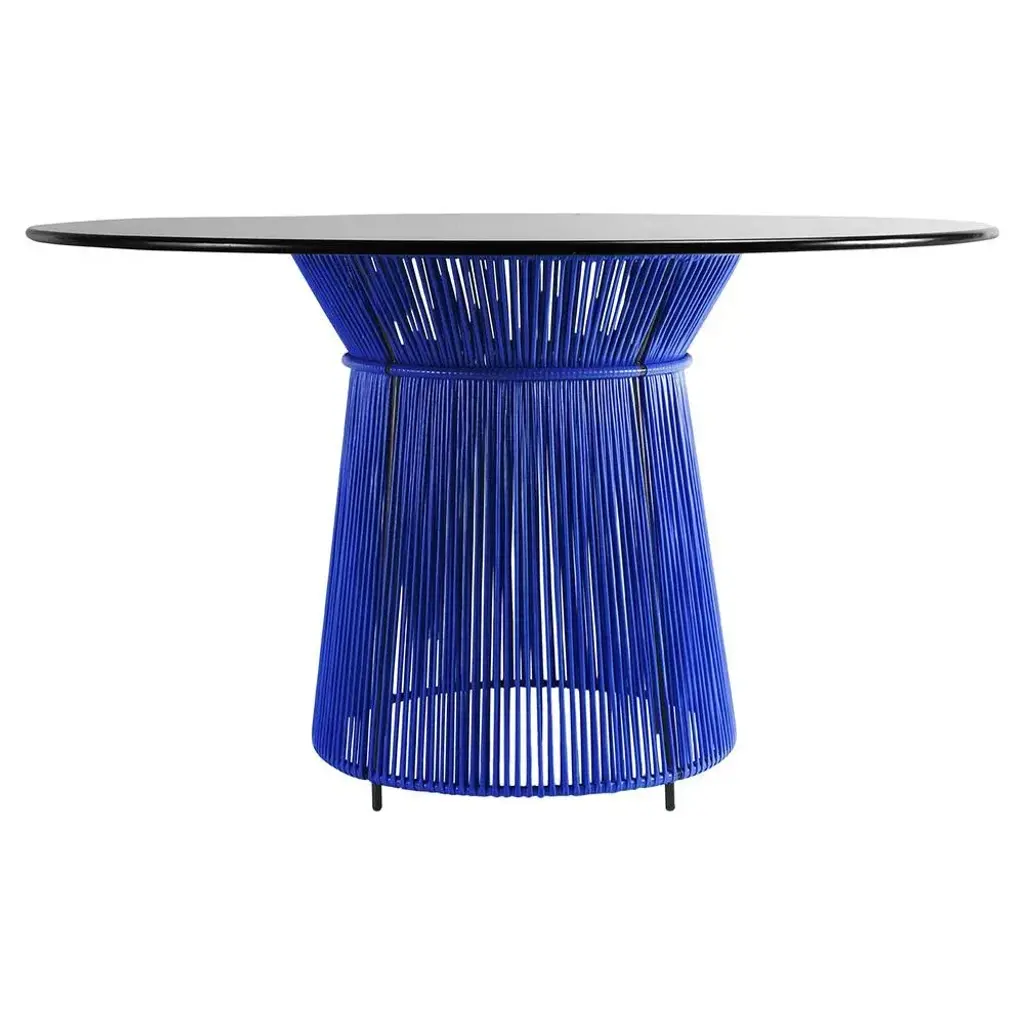 Blue Caribe dining table by Sebastian Herkner Materials: Galvanized and powder-coated tubular steel. PVC strings are made from recycled plastic. Technique: Made from recycled plastic and weaved by local craftspeople in Colombia. Dimensions: Top Diameter 135 cm Base Diameter 59 x H 75 Also available colors: blue/ black, mint/ grey white, orange/ curry. The elegant Caribe dining table is an elegant design for in- and outdoor seating arrangements, featuring a base with hard-wearing PVC strings and a metal tabletop. It’s part of the Caribe collection, designed by Sebastian Herkner for ames.