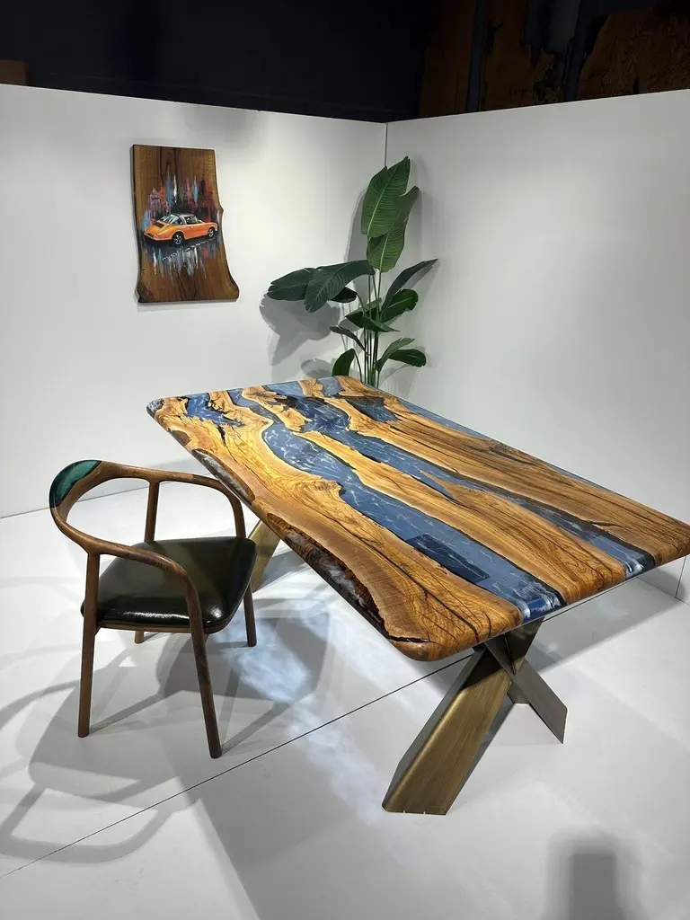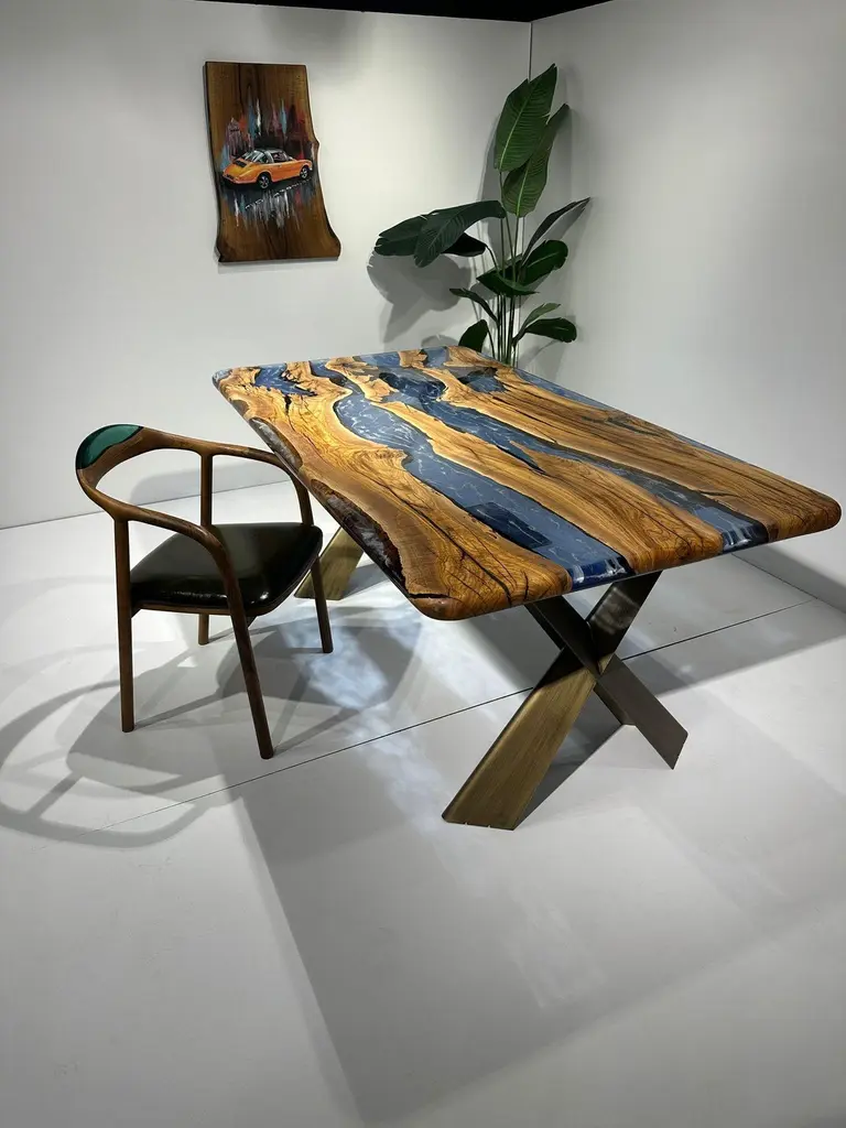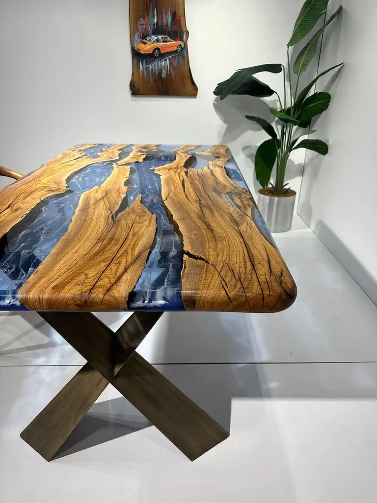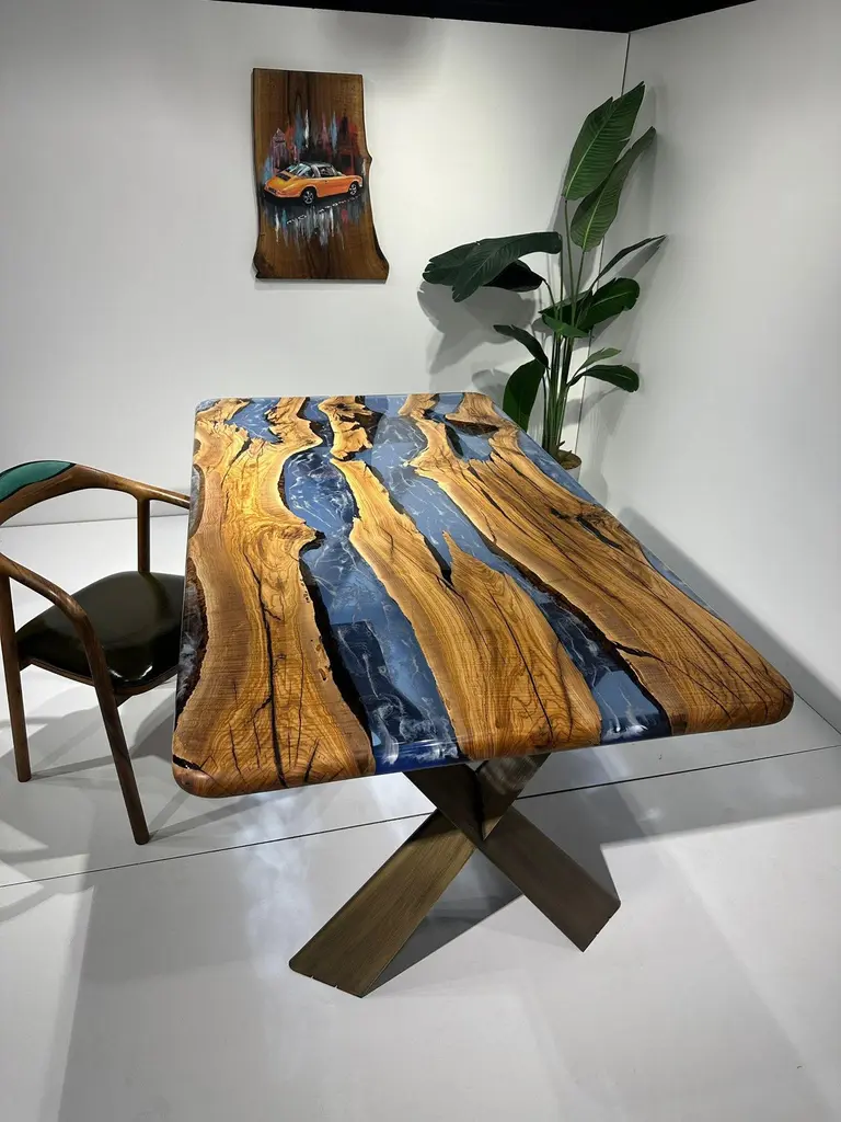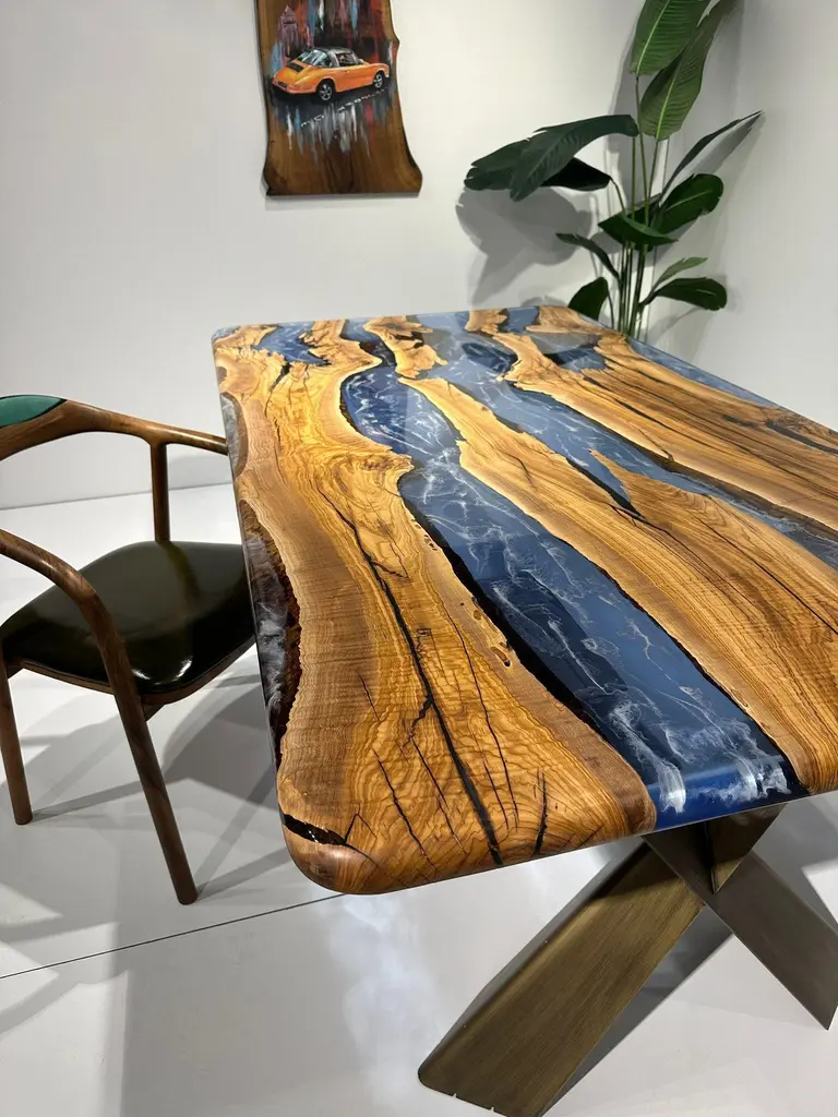 Custom Olive Epoxy TableThis stunning table is made of Mediterranean Olive wood. The unique beauty of the natural curves of olive wood combined with blue epoxy is seen in this table.All woods have its own natural shape. Therefore, each one has its own natural textures. Custom sizes, colours and finishes are available for this product.
