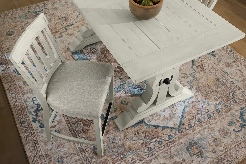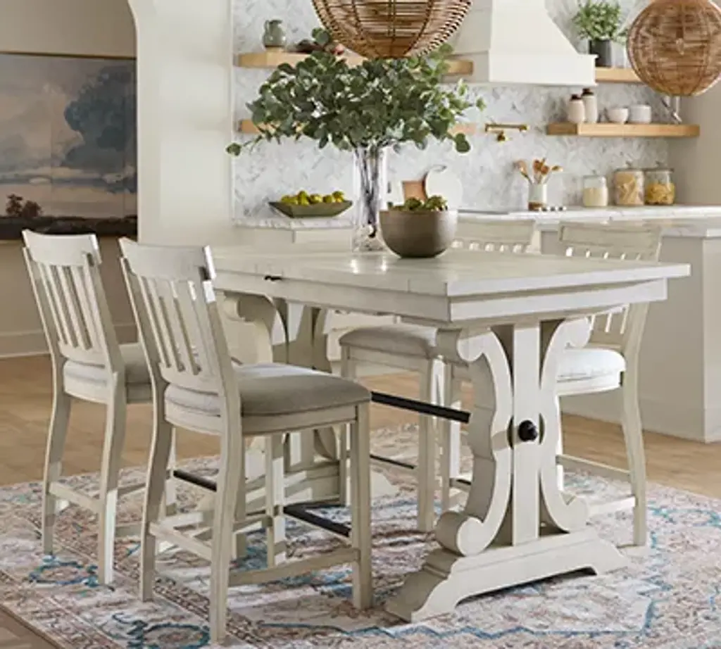 Take your dining experience to new heights with our Blue Ridge counter-height table. This gorgeous table gives traditional appeal an upgrade with a masterfully carved base, alabaster finish and charming distressed detailing. Expand the table with a leaf so more family and friends can enjoy refreshments and conversation.