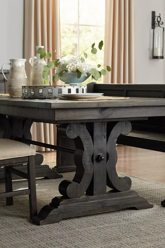 Our Blue Ridge dining table is a handsome addition to your dining space. This trestle-style table boasts a weathered charcoal finish with distressing and beautifully carved detailing on its legs. Expand the table with its self-storing butterfly leaves to make more rooms for guests and hearty cuisine.
