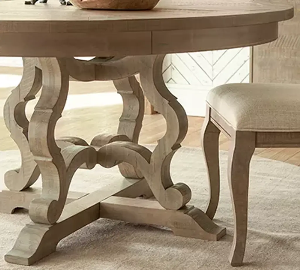 Our Blue Ridge round dining table is an elegant, rustic addition to your dining space. This pedestal-style table boasts a dovetail grey finish with distressing and beautifully carved detailing on its legs. Available in 54" or 48", this piece is the perfect spot for guests and hearty cuisine.