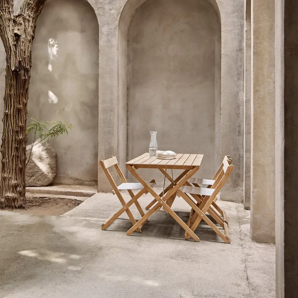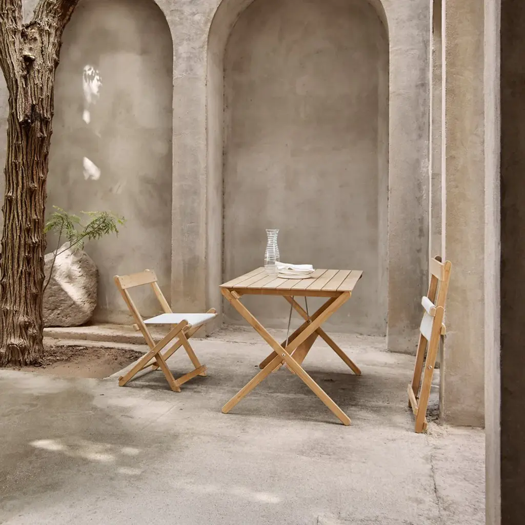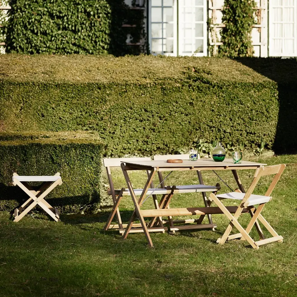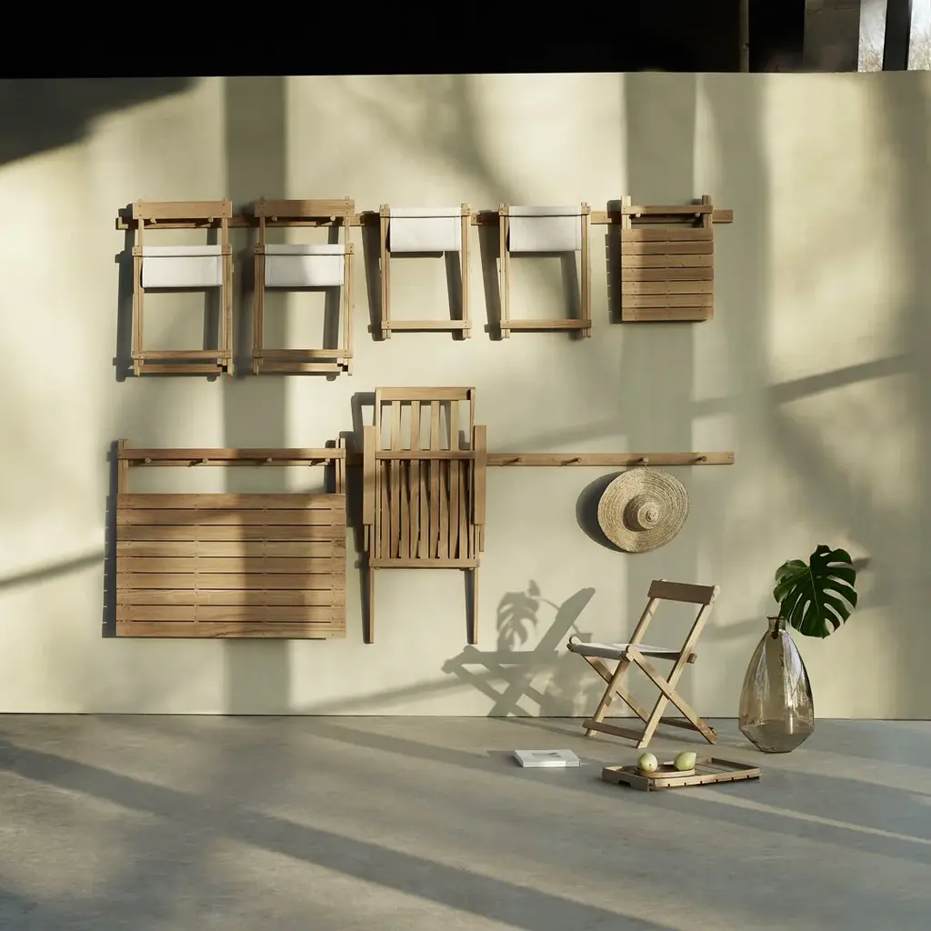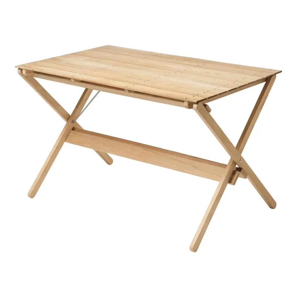 In the late 1960s, Danish furniture designer Børge Mogensen conceived his Deck Chair Series of outdoor furniture, which included the perfectly proportioned BM3670 Dining Table. Reissued by Carl Hansen & Søn, the purposeful design helps to bring people and nature together in thoughtful and inspiring ways. The straightforward silhouette in solid, untreated and FSC®-certified teak features carefully considered details that include gently rounded ends and identically spaced rivets. Originally conceived for Mogensen's private balcony, the table folds flat when not in use and can be neatly hung on the series' corresponding wall mount as a decorative, architectural object in its own right.