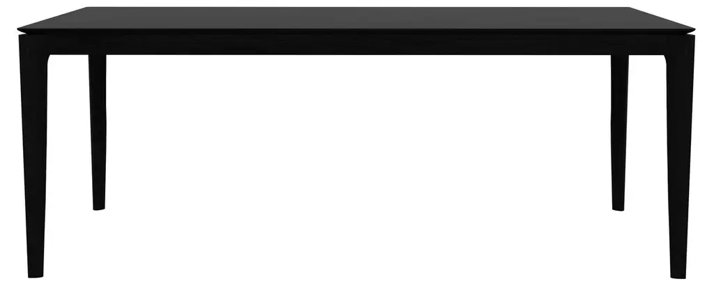 Crafted of solid oak, a hardwood known for its prominent grain and resistance to scratching and dust, this dining table features a thin top set on a sturdy base with subtly tapered legs. A sleek black finish adds to its allure.