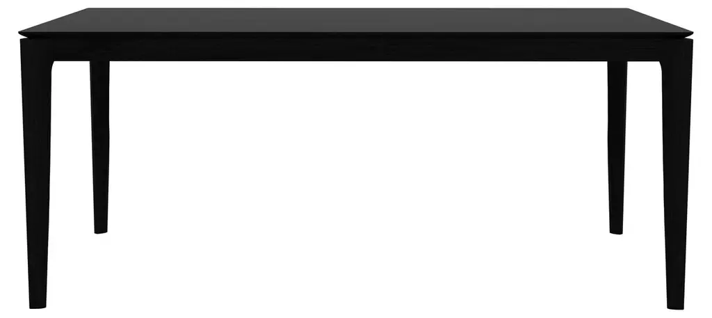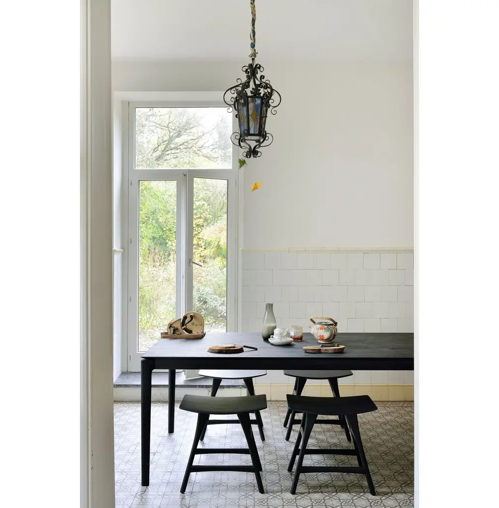 Crafted of solid oak, a hardwood known for its prominent grain and resistance to scratching and dust, this dining table features a thin top set on a sturdy base with subtly tapered legs. A sleek black finish adds to its allure.