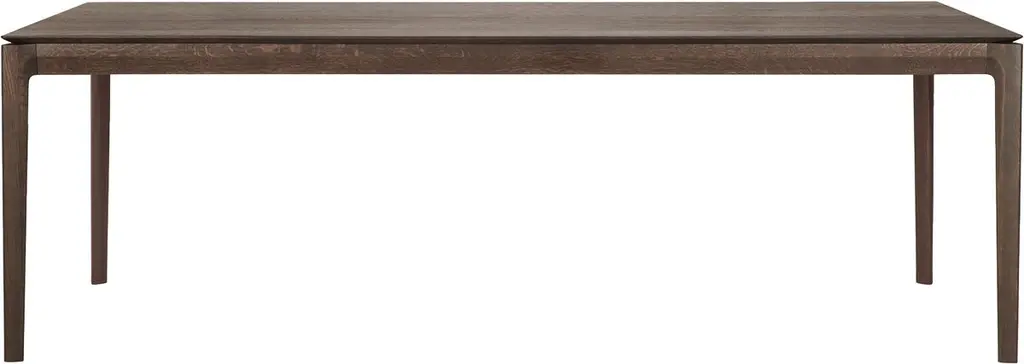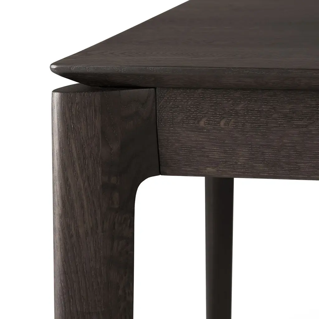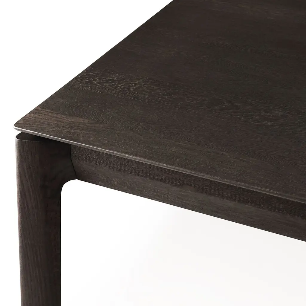 One of Ethnicraft's signature designs, this dining table rests a beveled, planked top on subtly tapered legs. It's crafted of oak, a hardwood prized as much for its strength as for its distinctive grain, which is enhanced by the dark brown finish.