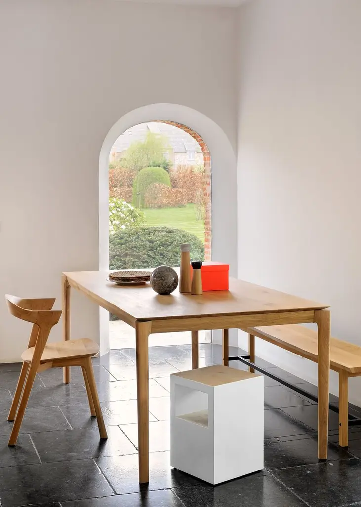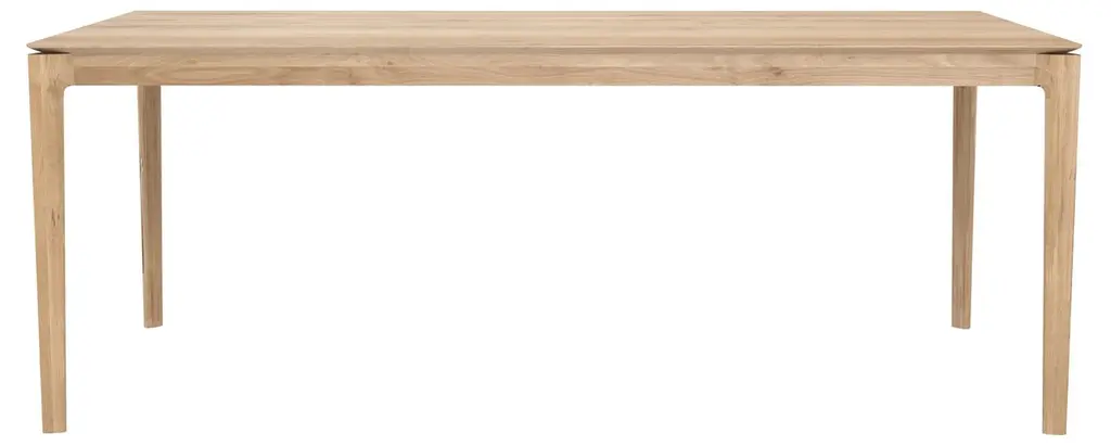 Crafted of solid oak, a hardwood known for its prominent grain and resistance to scratching and dust, this dining table features a thin top set on a sturdy base with subtly tapered legs.