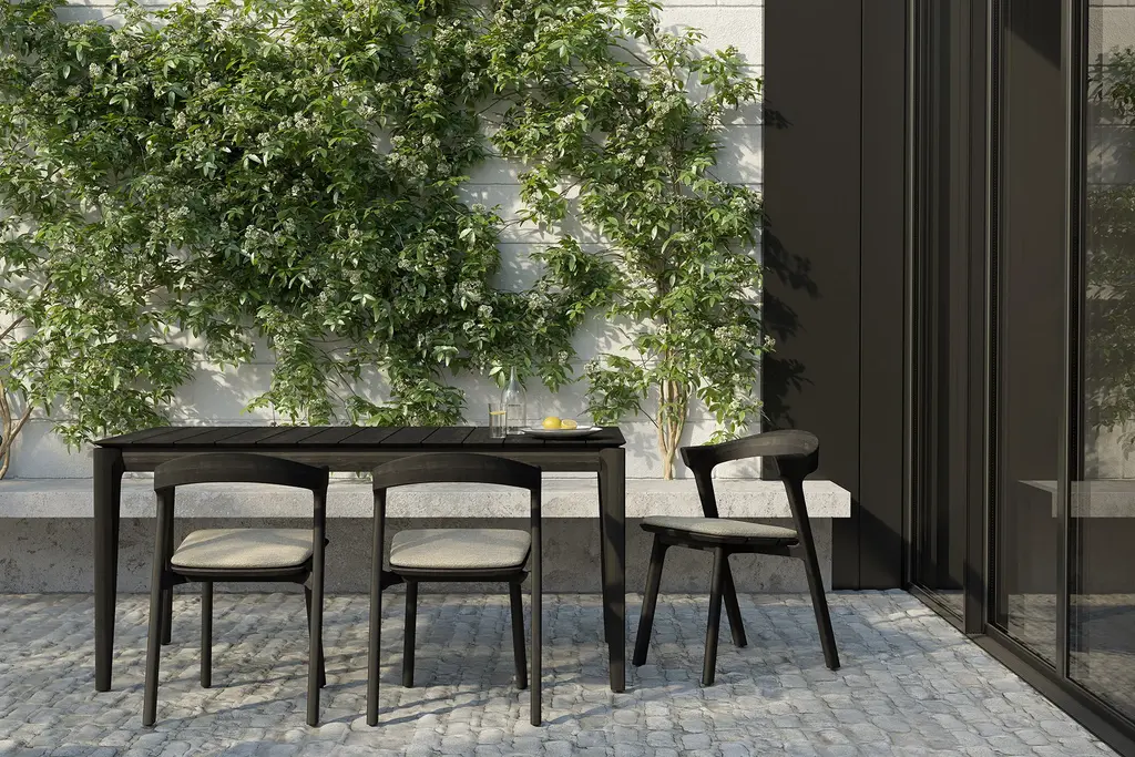 Reminiscent of a goat's curved horns, the Bok collection combines sculptural elegance and contemporary crafting into a graceful and airy form. Just like its matching chair, the Bok dining table is another signature design. Its airy shape yet rock-solid construction make this piece a timeless and remarkable design to enjoy for all the years to come, while the adapted grooved tabletop in solid teak makes outdoor life a simple pleasure.