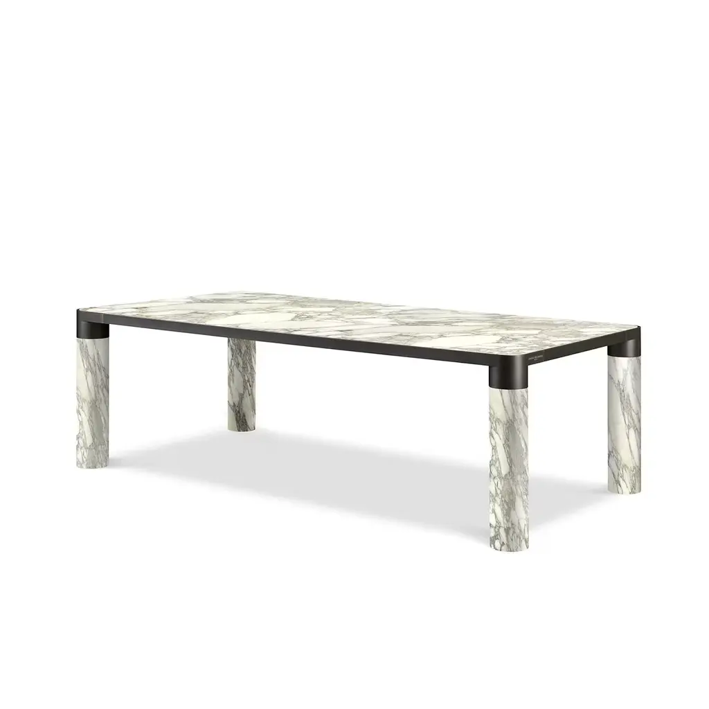 A stunning combination of noble materials and elegant hues, this dining table flaunts a minimalist and bold silhouette that will be an eye-catching focal point in a contemporary dining room. Marked by a classic rectangular shape, it features four sturdy cylindrical legs and a large top entirely crafted of Calacatta Gold Marble enriched with black satin-finished brass details.