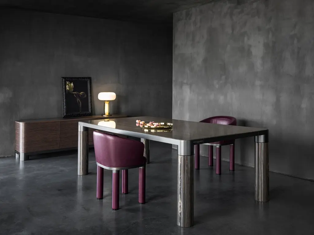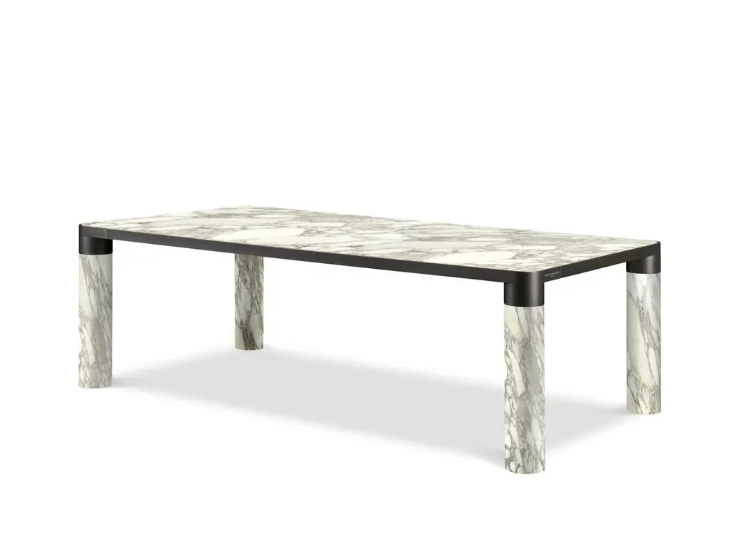 This family of products makes a bold statement with its generous cylindrical foot, connecting its structural perimeter while delimiting the objects that compose it. The distinctive metal rim that supports the seats, the tables, the cabinets, graphically encompasses the material with which they are made. This is beautifully portrayed in the tables, where the marble tabletop matches with the legs in turned marble, or with the armchairs featuring leather seats and legs of the same color. With the massive dimensions and the softness of the fittings, the materials are enhanced in their characteristics creating a sculptural effect and giving a distinct personality to each element of the collection.Structure: Die casted aluminum on the angular elements and extruded aluminum for the supporting structure on the perimeter. Legs: marble, wood.Top Finishes: 20mm marble, 20mm wood.Additional information:Materials: Brass, Calacatta gold marbleFinish: Black goldDimensions: W 240 x D 120 x H 75 cmAvailable in other top options: Emperador dark, sahara noir, carrara white, eramosa brown, woodAvailable in other size options: Small and LargeAvailable in other finish options: Polished brass, satin brass, light burnished brass, brown burnished brass, dark burnished brass