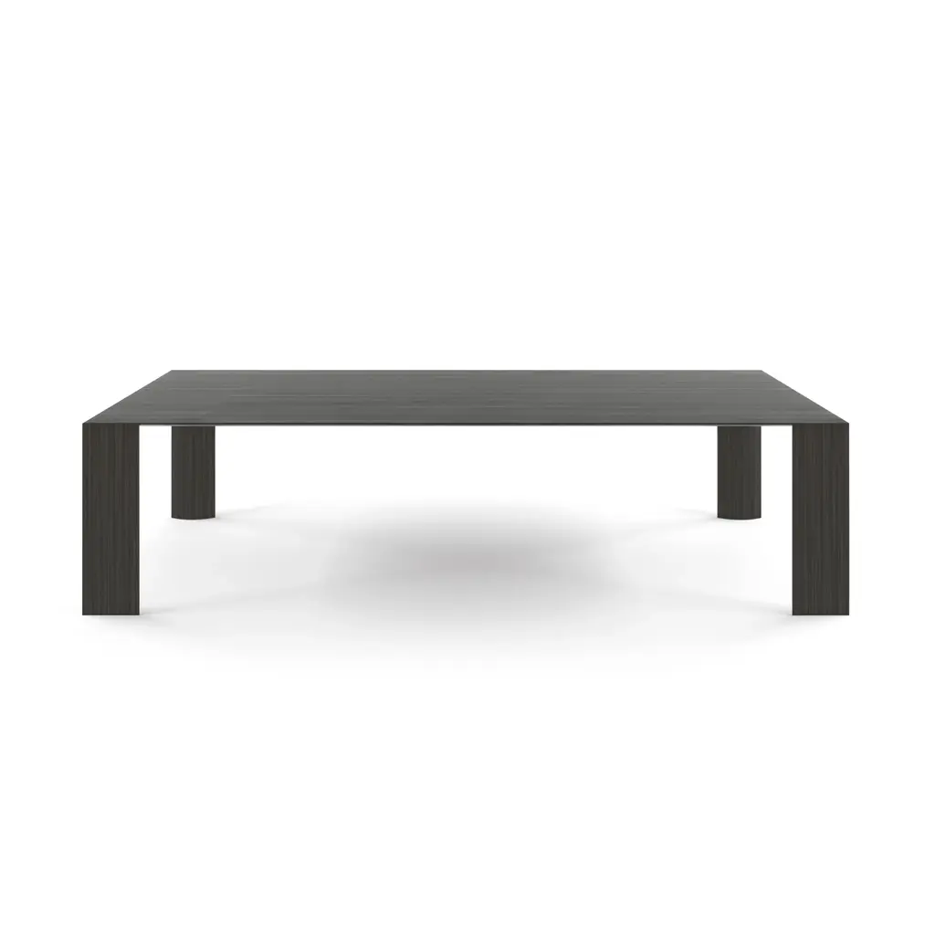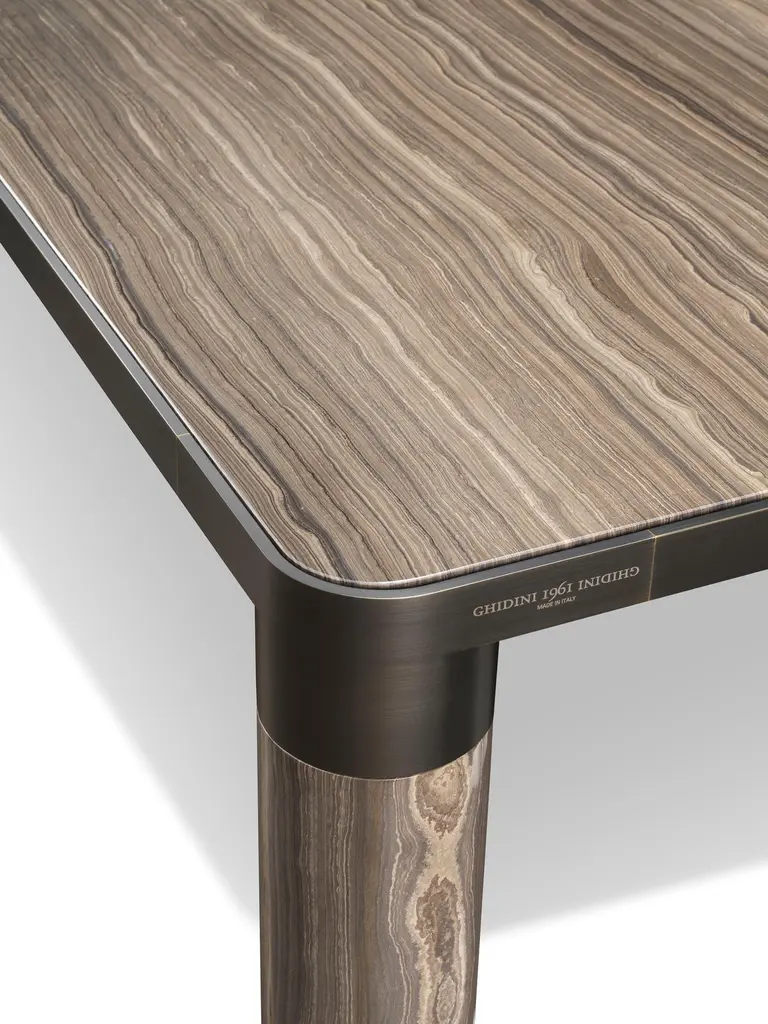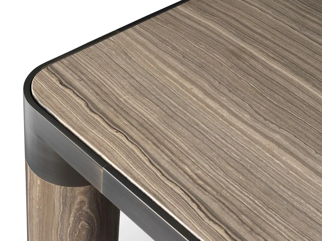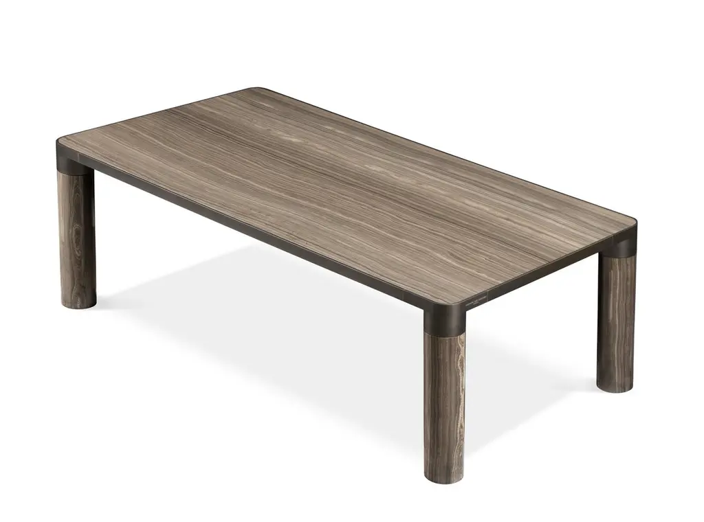 This family of products makes a bold statement with its generous cylindrical foot, connecting its structural perimeter while delimiting the objects that compose it. The distinctive metal rim that supports the seats, the tables, the cabinets, graphically encompasses the material with which they are made. This is beautifully portrayed in the tables, where the marble tabletop matches with the legs in turned marble, or with the armchairs featuring leather seats and legs of the same color. With the massive dimensions and the softness of the fittings, the materials are enhanced in their characteristics creating a sculptural effect and giving a distinct personality to each element of the collection.Structure: Die casted aluminum on the angular elements and extruded aluminum for the supporting structure on the perimeter. Legs: marble, wood.Top Finishes: 20mm marble, 20mm wood.Additional information:Materials: Brass, Eramosa brown marbleFinish: Black goldDimensions: W 240 x D 120 x H 75 cmAvailable in other top options: Calacatta gold, emperador dark, sahara noir, carrara white, woodAvailable in other size options: Small and LargeAvailable in other finish options: Polished brass, satin brass, light burnished brass, brown burnished brass, dark burnished brass