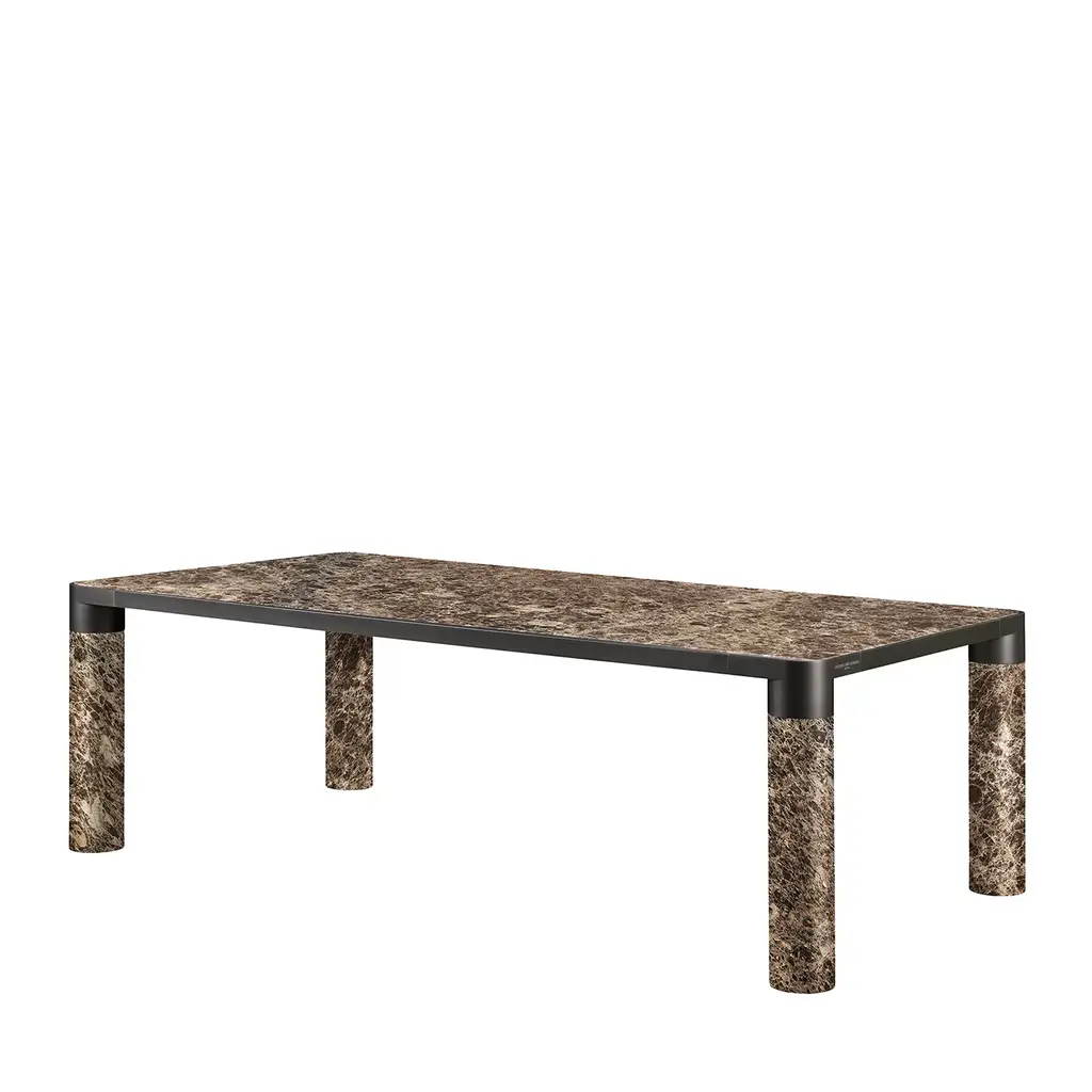 A statement piece that will infuse modern dining rooms with pure luxury, this dining table strikes with the minimalism of its clean lines and preciousness of prized brown marble, here offered in a version characterized by singular, intricate traceries. Bold cylindrical legs sustain the top, which is marked by rounded corners that quietly soften the rigor of its geometry. A wooden variant is available, please check the Artemest catalog.