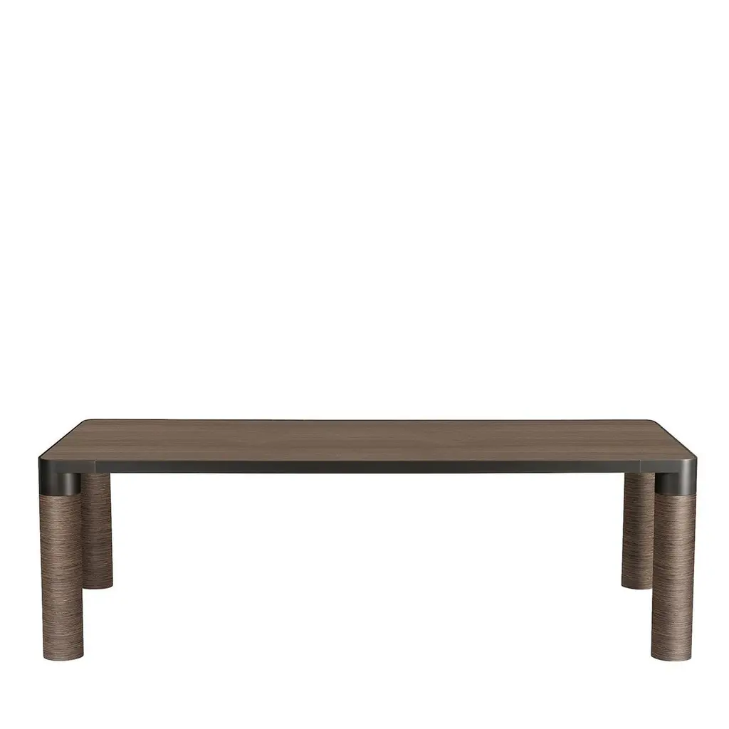 This refined dining table will impeccably complement modern dining rooms with a prevalence of neutrals. Its name is coherent with the essential yet stately silhouette, borrowing the reassuring charm of nature thanks to extensive use of wood that surprises with the unpredictable aesthetic of its grain. Cylindrical legs sustain the top, whose rounded corners make for quiet, softening details.