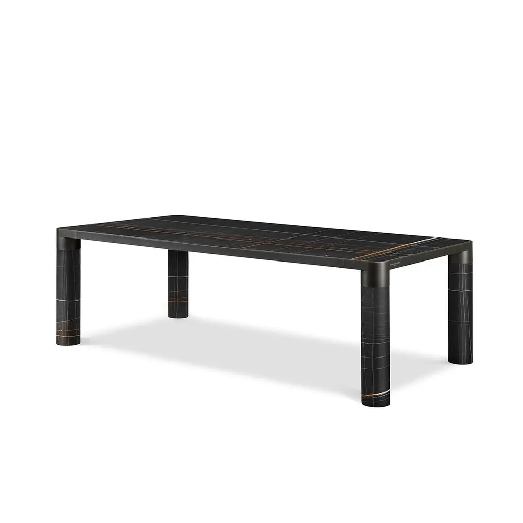 A superb combination of Minimalist design and functional aesthetic, this splendid dining table will have a bold and stately presence in a contemporary dining room. Boasting a Classic rectangular shape resting on four sturdy legs, the piece is entirely handcrafted of Fine Sahara Noir Marble, enriched with durable, black-hued, satin-finished brass details.