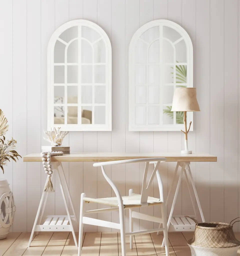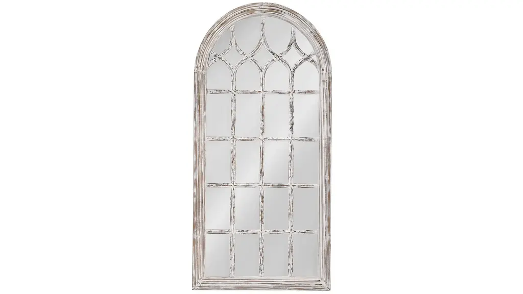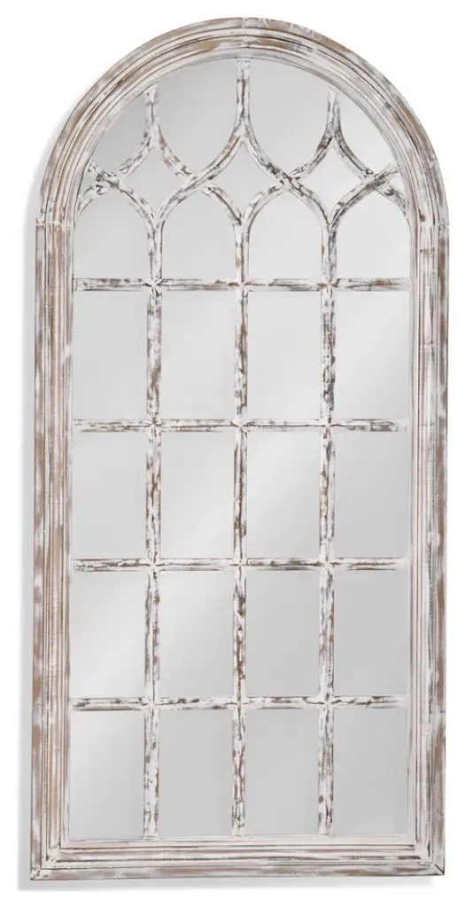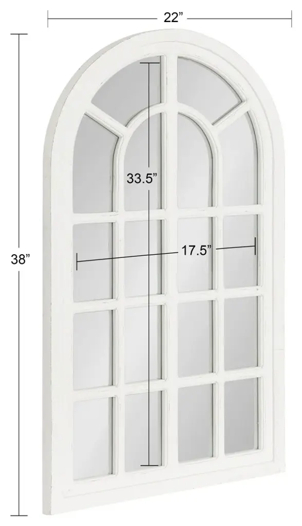 Create a rustic, farmhouse aesthetic within your home with the Boldmere rustic wall mirror. This mirror has a distressed white wood frame with an interlocked wood pattern in the front. Inspired by traditional vintage windowpanes, this accent mirror is a decadent feature to hang in your living room, bedroom, entryway, dining room, or even your master bathroom. Adding an accent mirror opens up your space and brings dimension and light to your home. This is a more compact version of our original Boldmere mirror, standing at 38 inches tall by 22 inches wide by 1.25 inches deep. This is an excellent size for featuring your new mirror over a console table or other furniture. You can also mount it over a mantle, over a couch or love seat, or in multiples over your nightstand. This shabby-chic mirror is an excellent opportunity to purchase multiples for a symmetrical, dynamic wall display. Hang the Boldmere mirror in only a matter of seconds with metal D-ring hangers, creating an excellent piece of home decor in a matter of seconds.• RUSTIC FARMHOUSE WINDOW MIRROR: This mirror includes a distressed farmhouse windowpane-inspired wood frame• TRENDY ARCHED SHAPE: The Boldmere''s trendy shape brings its rustic design into the 21st century• MORE COMPACT SIZE: This accent mirror stands at 38 inches high by 22 inches wide by 1.25 inches deep• TRANSITIONAL STYLE: Feature it over your mantle, a console table, or dining table • EASY TO HANG: Metal D-ring hangers allow this mirror to mount in seconds