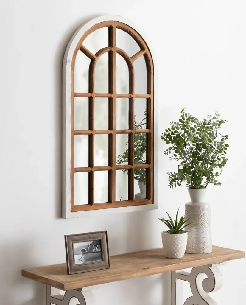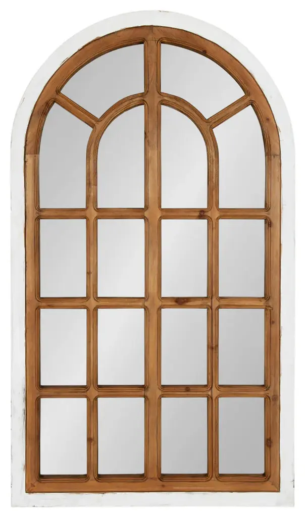Create a rustic, farmhouse aesthetic within your home with the Boldmere Rustic Accent Mirror. This mirror has a distressed white and brown wood frame with an interlocked wood pattern in the front. Inspired by traditional vintage windowpanes, this accent mirror is a decadent feature to hang in your living room, bedroom, entryway, dining room, or even your master bathroom. Adding an accent mirror opens up your space and brings dimension and light to your home. This is a more compact version of our original Boldmere Mirror, standing at 38 inches tall by 22 inches wide by 1.25 inches deep. This is an excellent size for featuring your new mirror over a console table or other furniture. You can also mount it over a mantle, over a couch or love seat, or in multiples over your nightstand. This shabby-chic mirror is an excellent opportunity to purchase multiples for a symmetrical, dynamic wall display. Hang the Boldmere Mirror in only a matter of seconds with metal D-ring hangers, creating an excellent piece of home decor in a matter of seconds.• RUSTIC FARMHOUSE DECOR: This mirror includes a distressed farmhouse windowpane-inspired wood frame • MORE COMPACT SIZE FOR VERSTILITY: This accent mirror stands at 38 inches high by 22 inches wide by 1.25 inches deep• EASY TO HANG: Metal D-ring hangers allow this mirror to mount in seconds• TRENDY ARCHED SHAPE: The Boldmere''s trendy shape brings its rustic design into the 21st century• TRANSITIONAL STYLE: Feature it over your mantle, a console table, or dining table