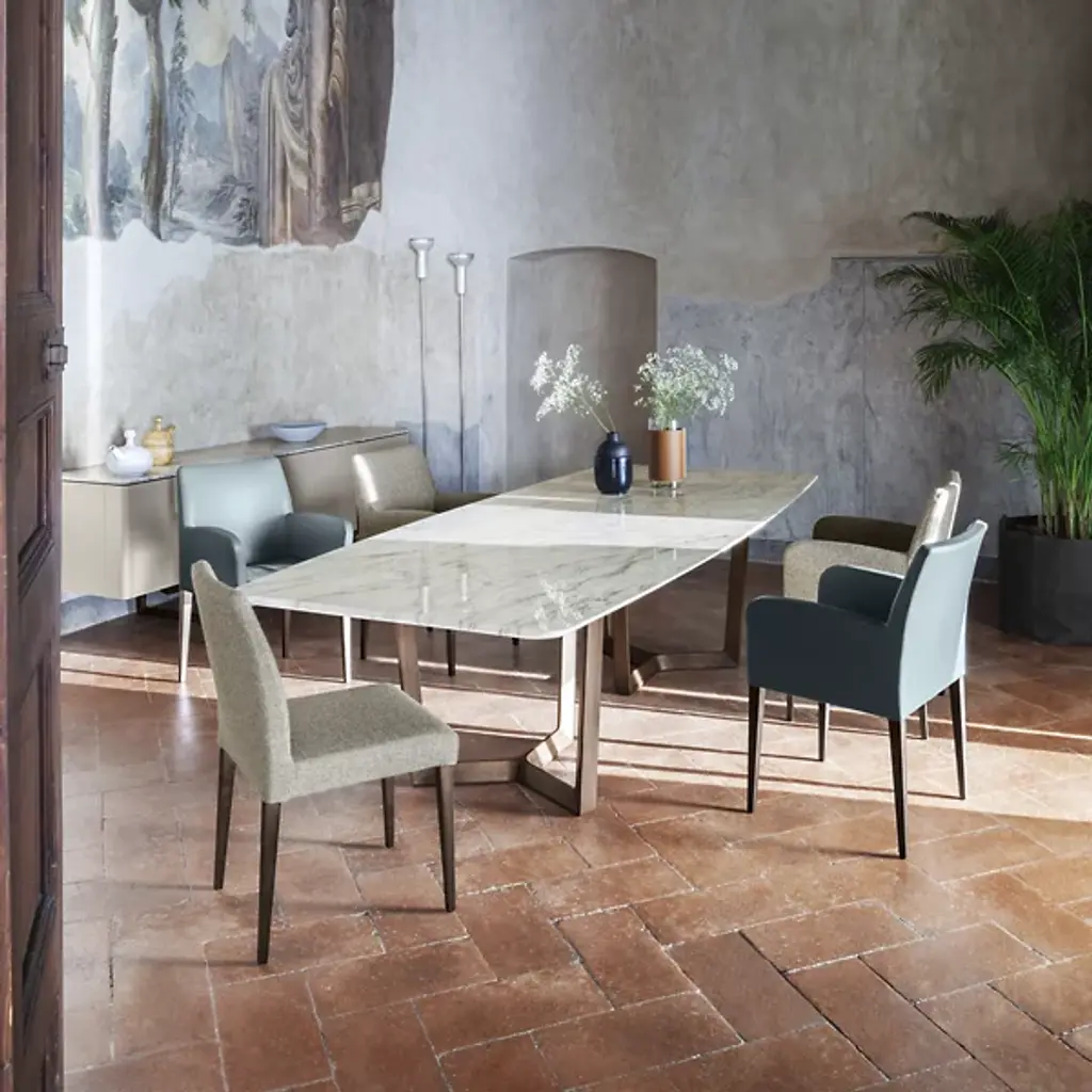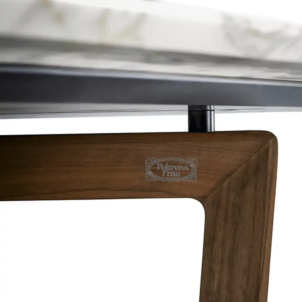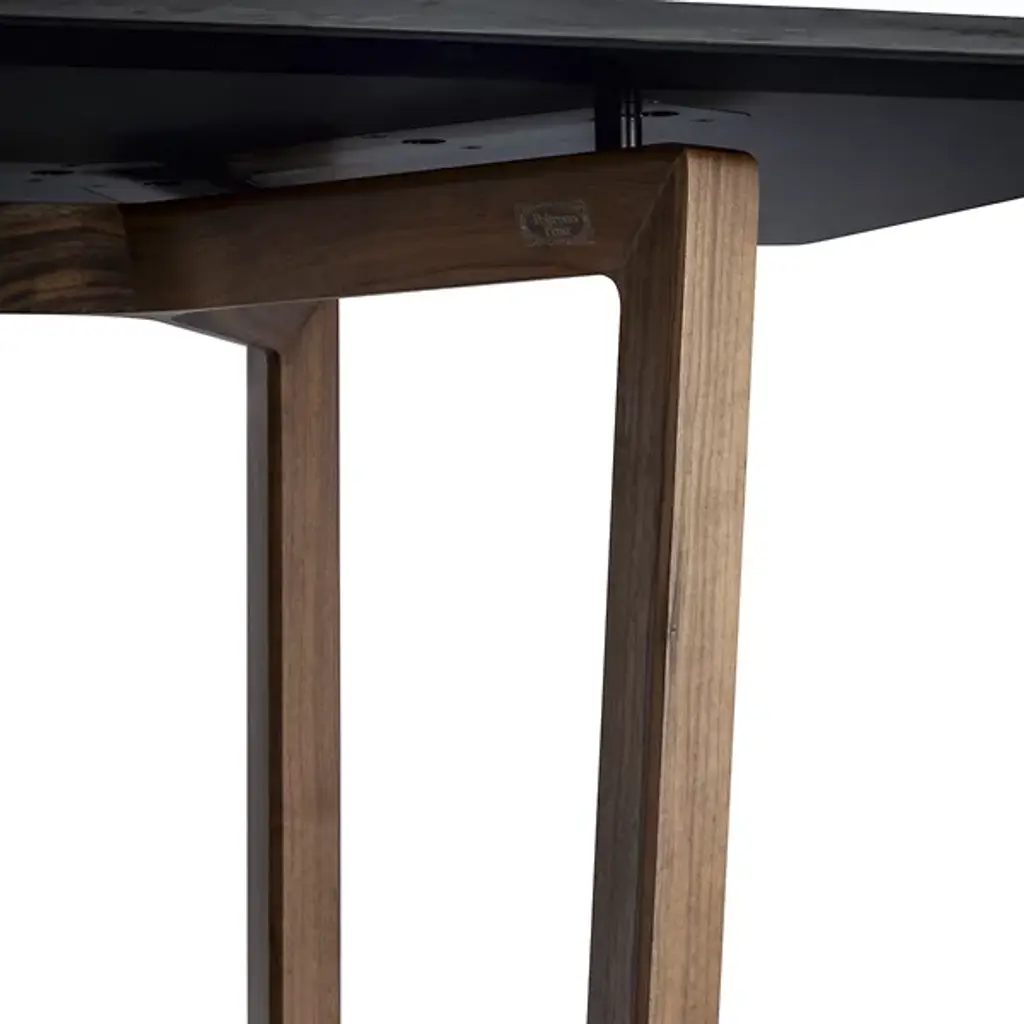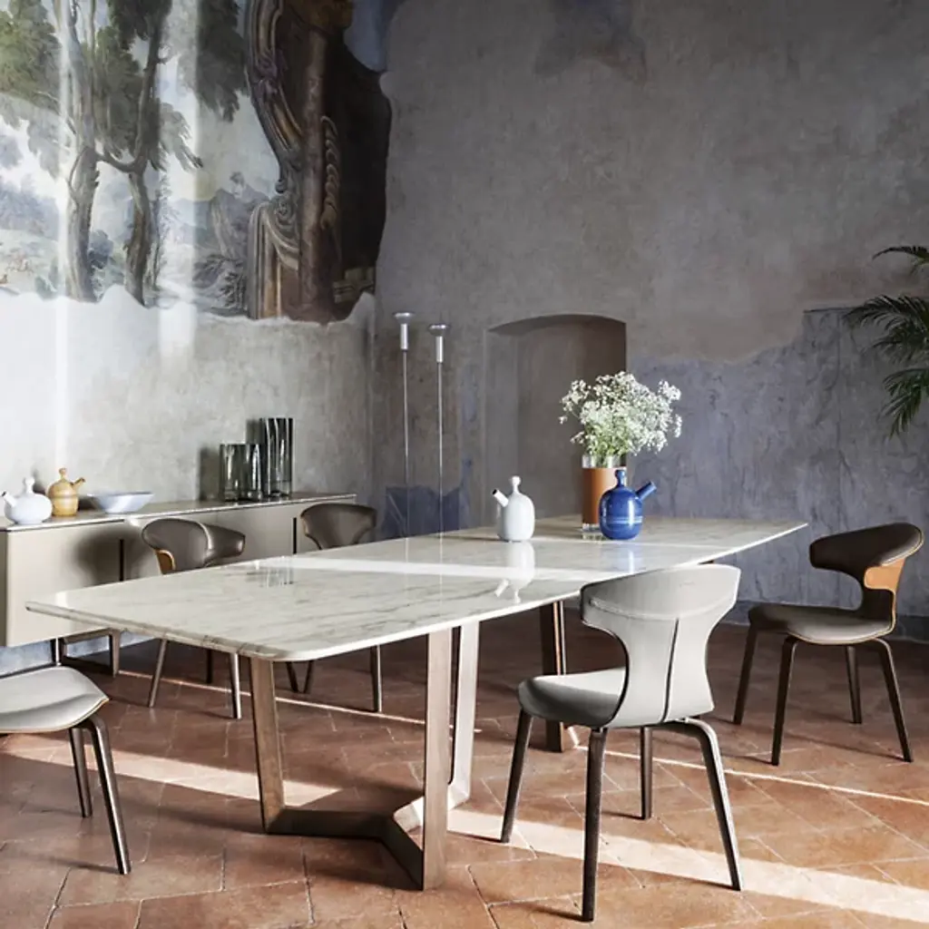 The Bolero Dining Table from Poltrona Frau lets you dine in contemporary style. This dining table was expertly crafted in 2013 by Roberto Lazzeroni, who finds the middle ground between statement-making and intentional discretion. This beautiful table features a streamlined, wooden tabletop that extends beyond the width of the sturdy wood legs, giving this piece its character. The legs of your table are geometrically shaped with open frameworks which showcase elegant silhouettes. Bolero’s flat surface facilitates the placement of your plates and cocktail glasses.