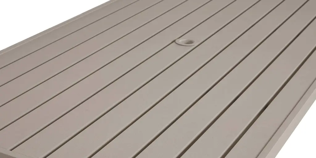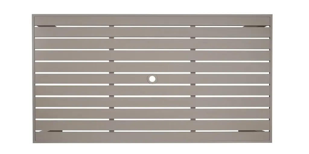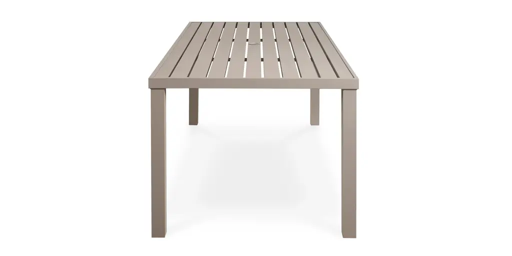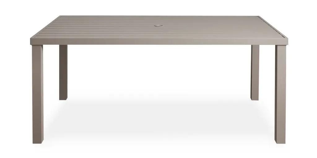 On the deck or by the pool, outdoor dining is always an occasion with the Bonavista 72 Rectangular Outdoor Dining Table. In clean-lined aluminum, with slender legs and aprons and a solid top thats grooved to simulate slats, the table is designed to match your mood, whether casual or sophisticated. Its easy transitional style mingles with industrial chairs as well as it does with rattan or wicker. Umbrella opening and plug included. Seats 6. Crafted in Alabama. Available in your choice of powder-coated finish colors.