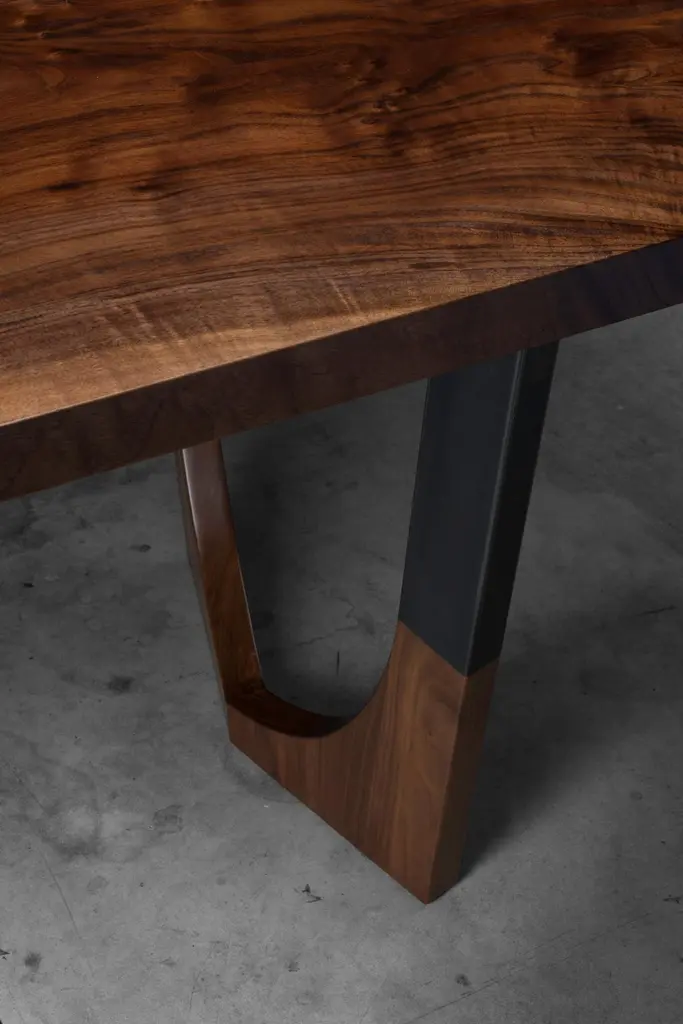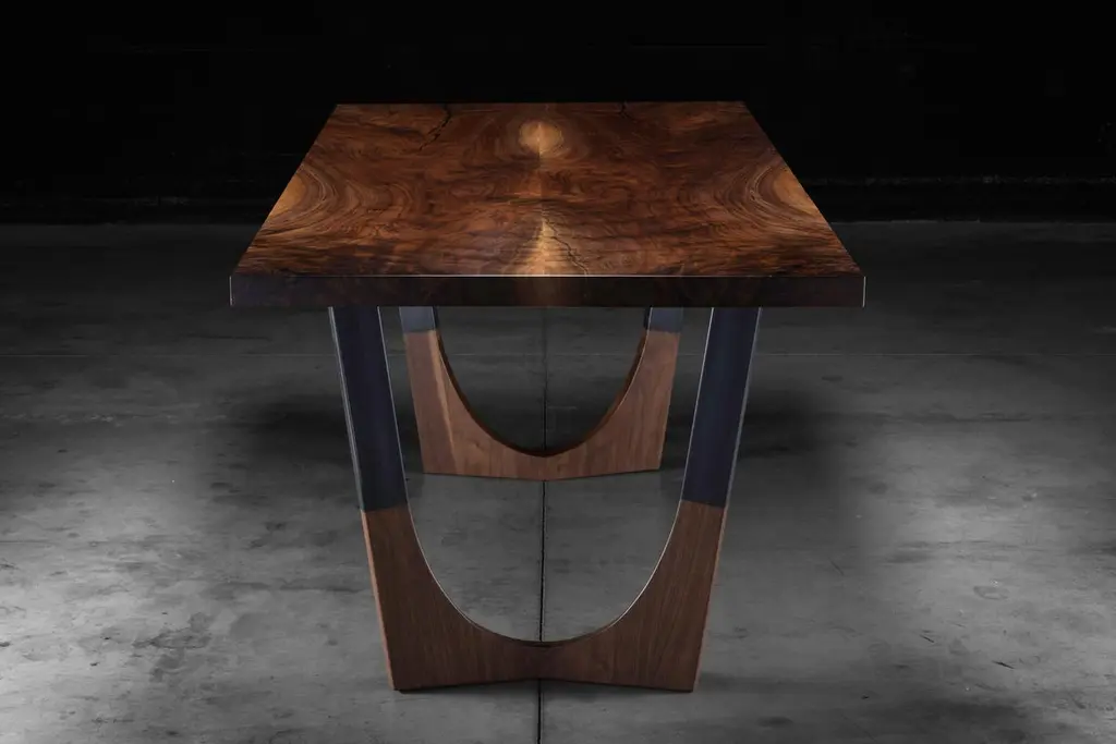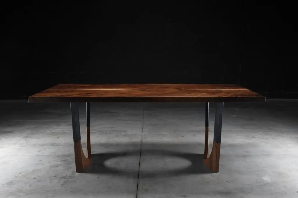 The Lafayette dining table is made of a book-matched claro walnut top with a blackened steel base with walnut inserts. This piece has been finished in an extremely durable matte conversion varnish. The dark tone of the claro walnut top is brought out by the black steel base and creates a modern high-quality table to fit a variety of needs.This is a made to order item &custom sizing and materials options are available upon request.