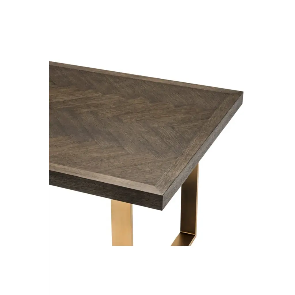 Reminiscent of Danish design furniture from the 1950s, the Melchior Dining Table grants your home interior a genuine retro look and feel. The brown oak veneer tabletop features a beautiful herringbone pattern. It rests on a metal base with a brushed brass finish to ensure it effortlessly blends in a variety of decors.