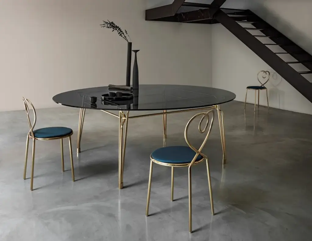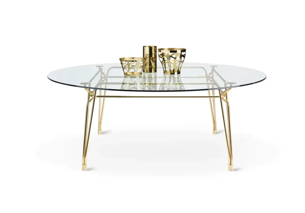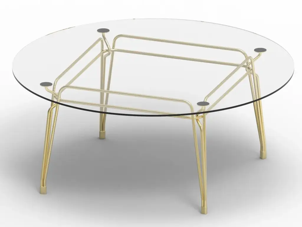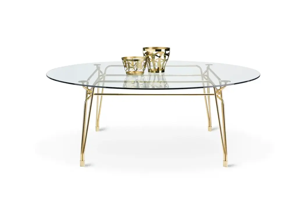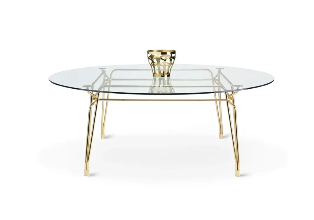 Botany Dining TableStructureGilded metal rod with diameter 18mm supporting the structure, with 4 supporting elements for the table top. Satin gold finish.Top 12mm glass.Family of tables characterized by the elegant sophisticated metal structure supporting the glass tabletop.Inspiration from turn of century outdoor furniture meets modern high-quality metal crafting.Intricate weaving of steel rods creates a beautiful visually light three-dimensional ornament.