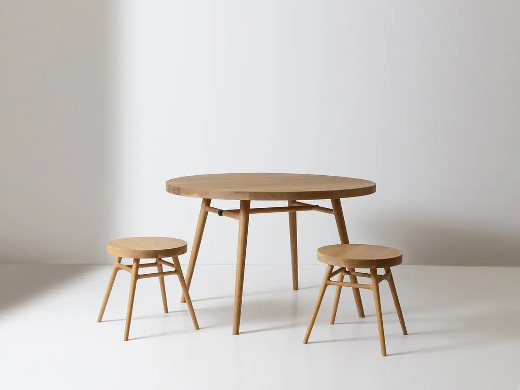 The Bough Table Round is a trestle-style table constructed of solid American hardwoods (Ash, Black Walnut, and White Oak). Features complex, concealed joints of surprising strength and blackened steel hardware detailing on the cross beam. Our first round table, this design is intended to work in less formal dining spaces and smaller interiors. Available in two sizes. Wood is hand-rubbed and finished with Kalon Bare Finish, a natural oil/wax finish painstakingly developed to preserve the delicate and luminous beauty of raw wood.