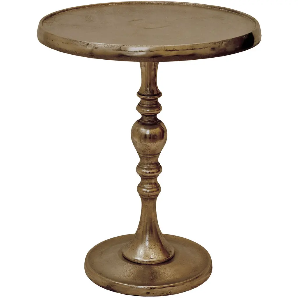 The turned, bulbous column and edge details are finished in Parisian silver, while the apron rail is inset with antiqued mirror tiles, above which there is a foxed mirror top.