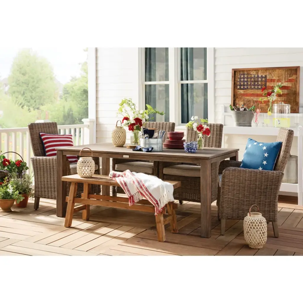 This outdoor dining table makes it easy to gather family and friends for a memorable meal. It's made from solid eucalyptus wood that is naturally water- and weather-resistant, so you can leave it outside if a rainstorm cuts dinner short. Four slim legs support the table, while the planked tabletop has an umbrella hole that lets you keep yourself and your guests in the shade. This table measures 71" long, so you can sit six people comfortably.