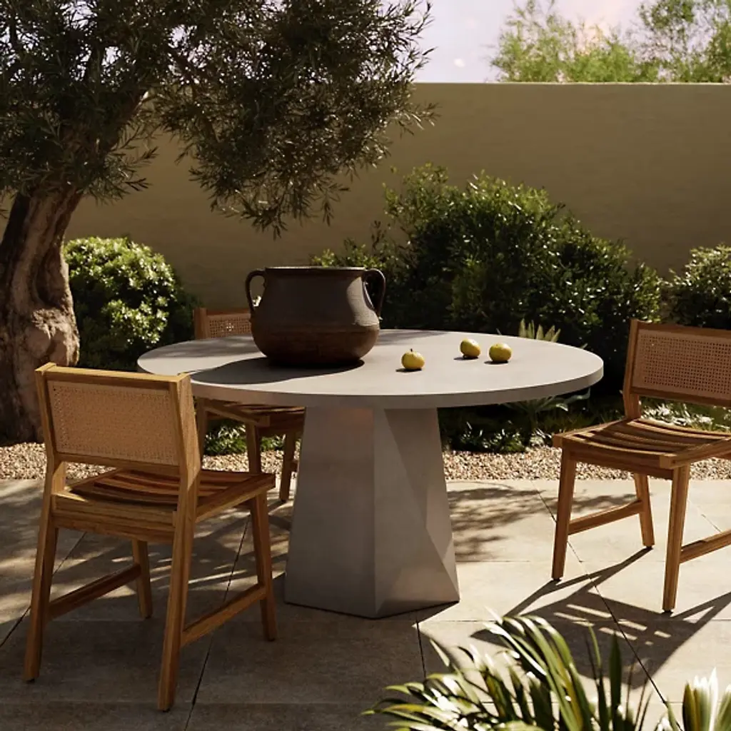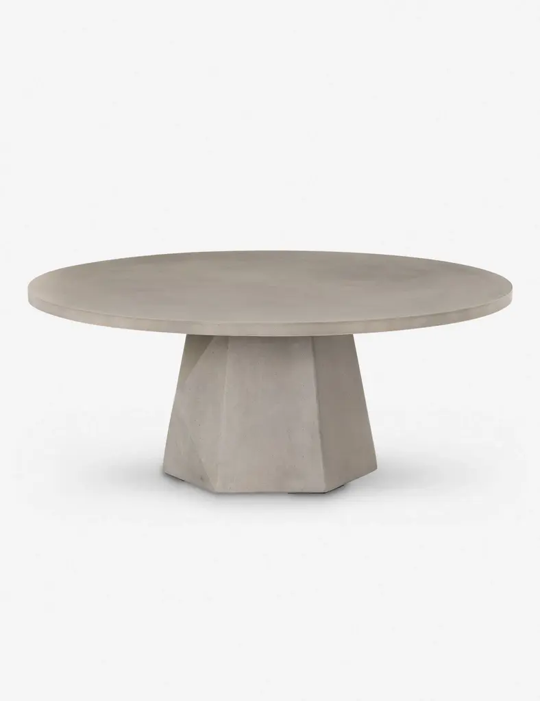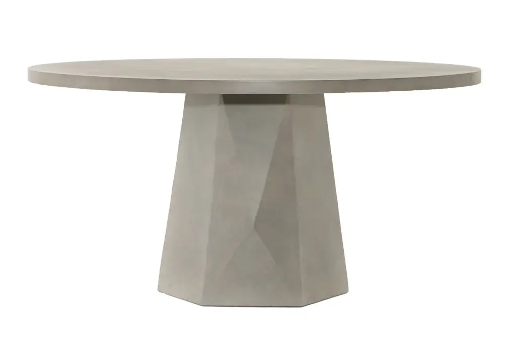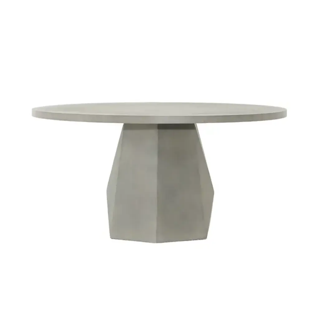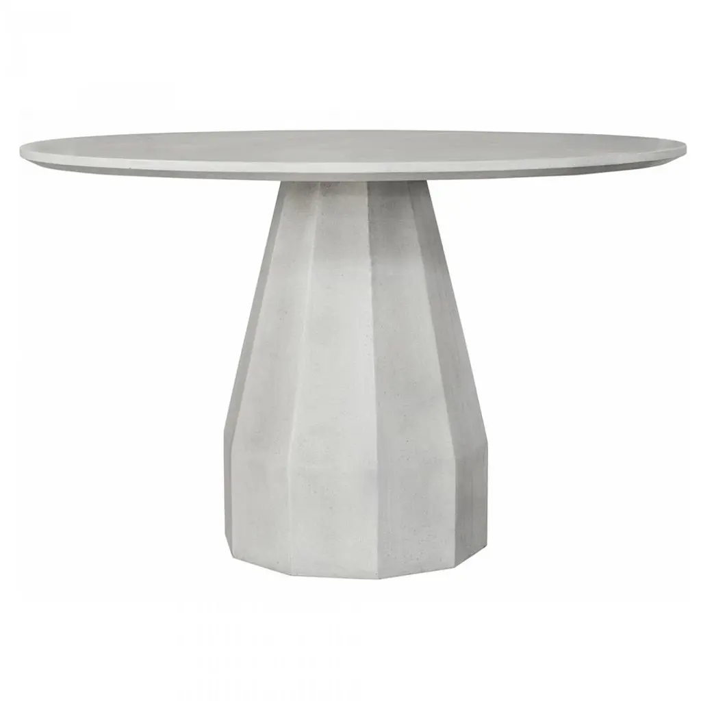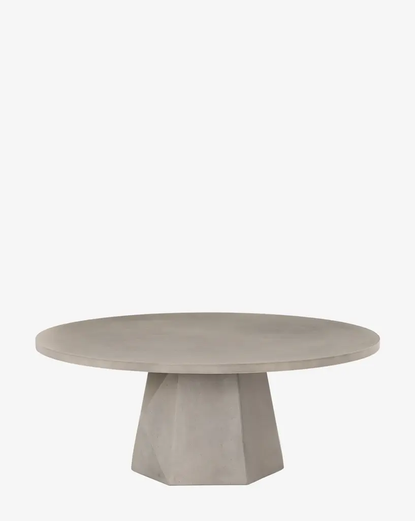 The Bowman Outdoor Dining Table by Four Hands boasts a striking faceted base that delivers visual impact from every angle. Its spacious, rounded top offers plenty of room to welcome guests, whether used indoors or outdoors. This versatile and stylish table is ideal for any entertaining space. To preserve its beauty and longevity, be sure to cover or store the table indoors during inclement weather and when not in use.